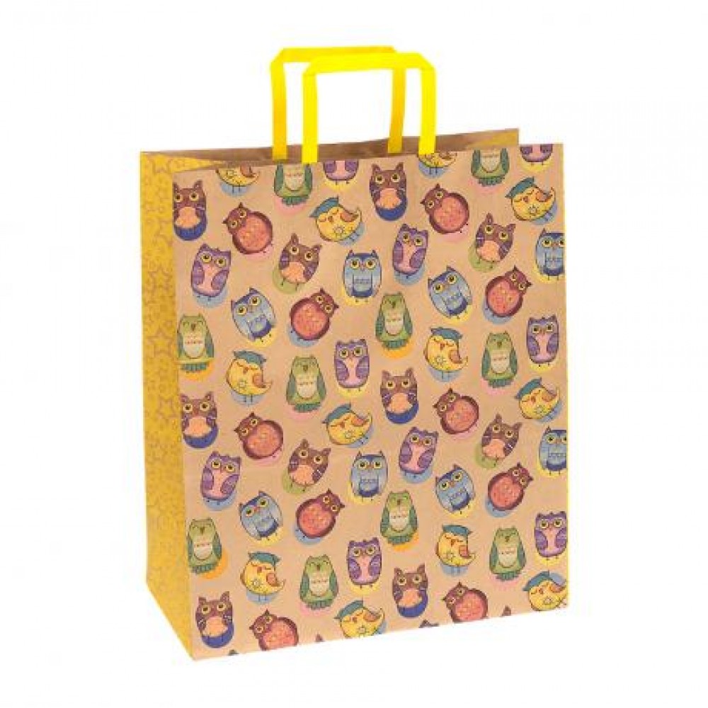 Паперовий пакет Крафт розміром 32х15х38 см виготовлений з паперу 100 г/м². Має кольорові прямокутні паперові ручки. Друк виконано в 3-6 кольорах Pantone з основним дизайном з обох боків та додатковим чорним Pantone. В одній упаковці представлений один дизайн.