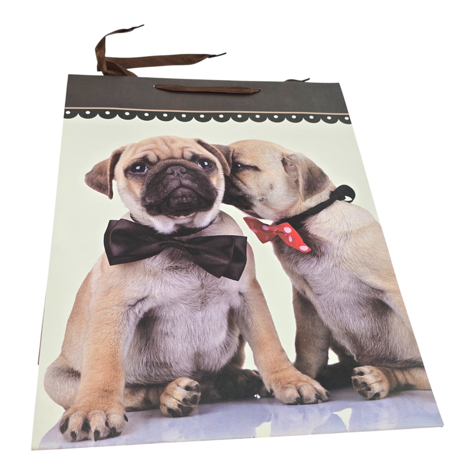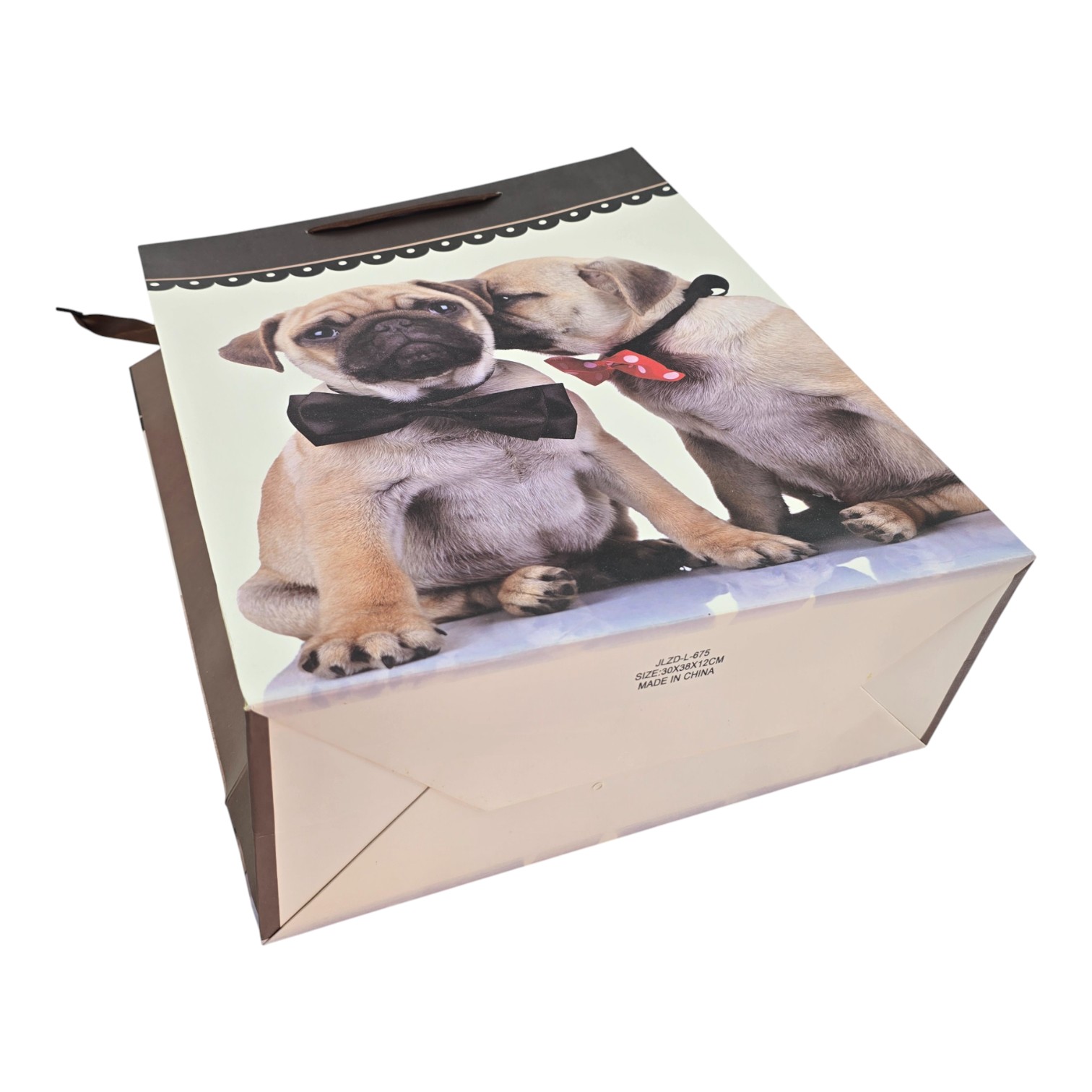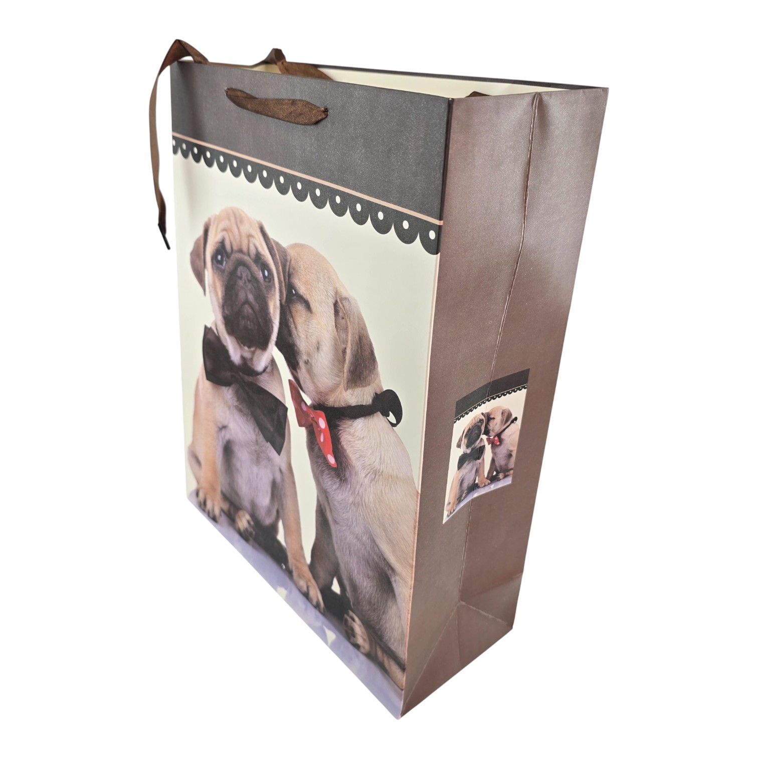 Подарочный пакет с милыми щенками в бабочках. На лицевой стороне два щенка сидят рядом: один в строгой чёрной бабочке, второй словно шепчет ему на ухо и украшен красным галстуком в горошек. Верх пакета оформлен тёмной декоративной полосой, ручки из мягкой коричневой ленты добавляют аккуратный, немного нарядный вид. Такой пакет подойдёт для подарков детям и взрослым, особенно тем, кто любит собак.