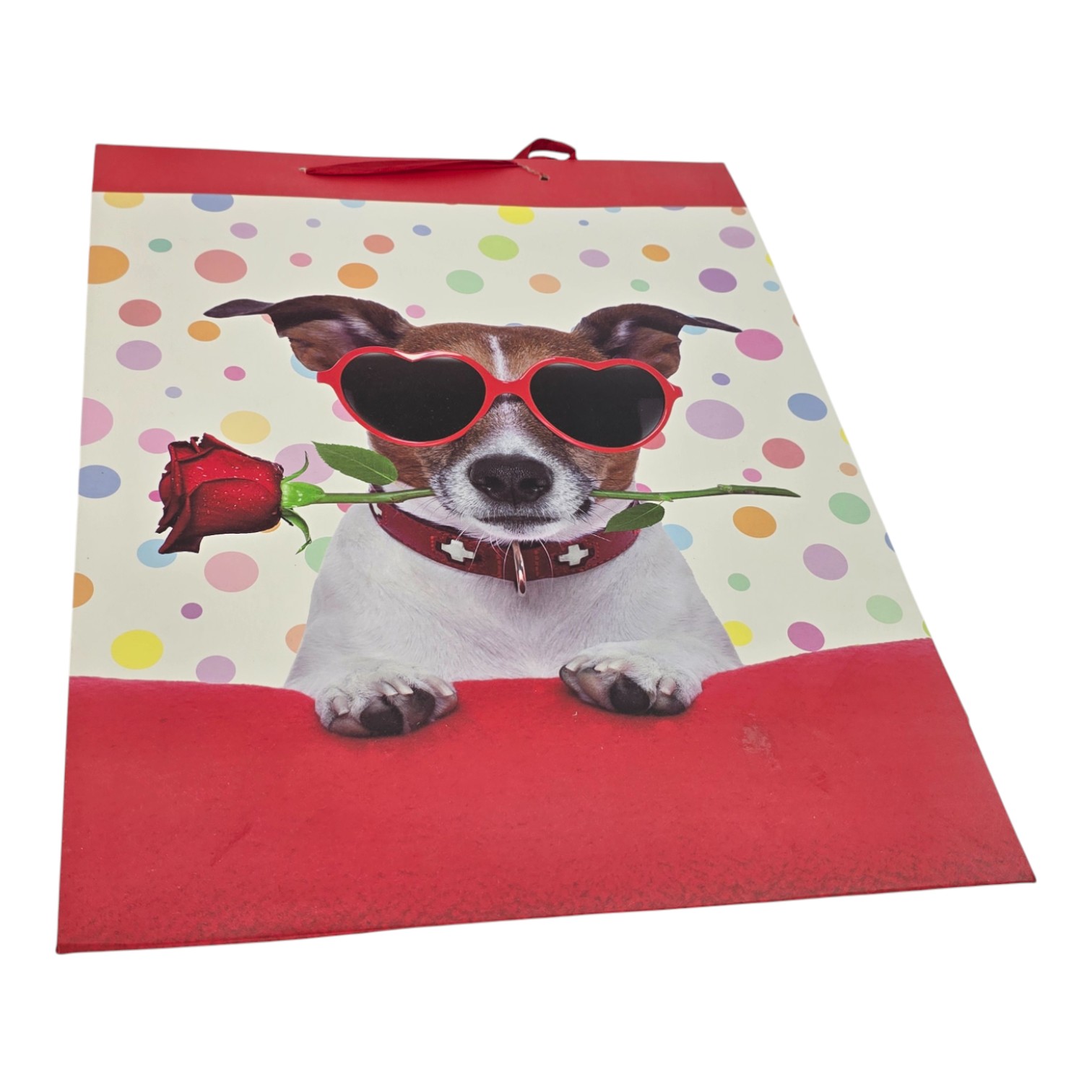 Яркий подарочный пакет с изображением собачки в красных очках-сердечках, держащей в зубах красную розу. Фон украшен цветными кружками, нижняя часть и боковины пакета выполнены в красном цвете. Такой рисунок создаёт романтическое настроение, поэтому пакет особенно подходит для подарков на 14 февраля, годовщину, день рождения или любой другой приятный повод для любимого человека и поклонников собак.
