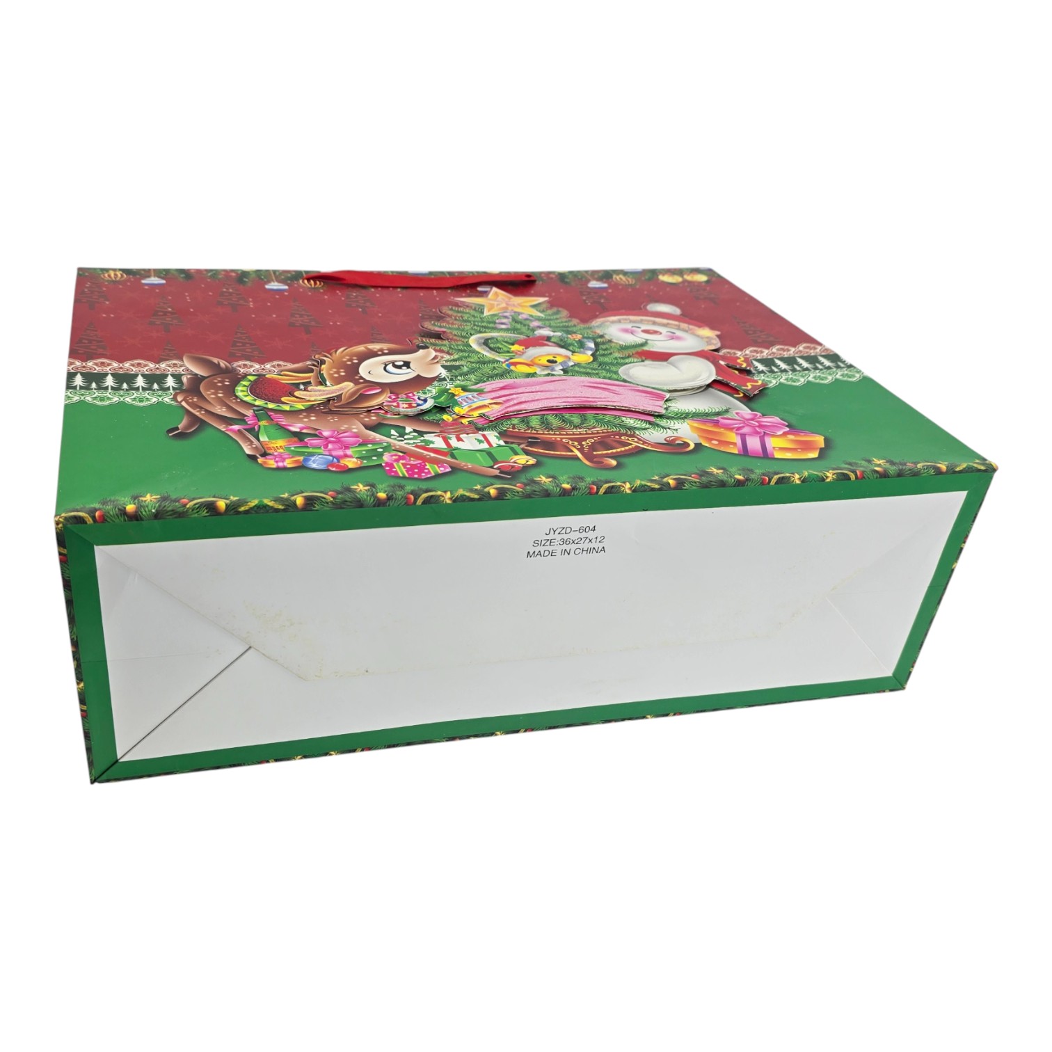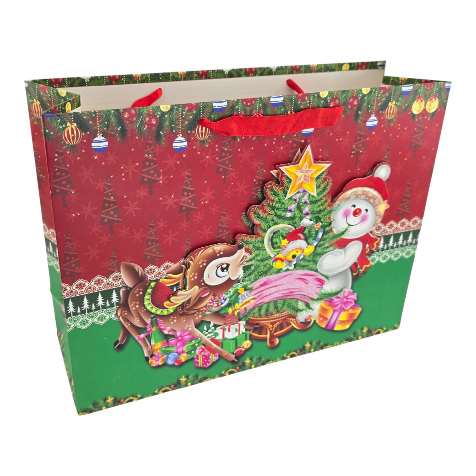 Яркий новогодний подарочный пакет с веселым оленем, снеговиком и елкой поднимает настроение еще до вручения подарка. Красно-зеленый фон с детальными рисунками и объемными элементами выглядит по-детски радостно и заметен под елкой. Пакет подходит для сладостей, коробки с игрушкой, набора косметики, одежды или небольшого сувенира. Плотный картон и атласные ручки позволяют удобно нести подарок и использовать пакет несколько раз.