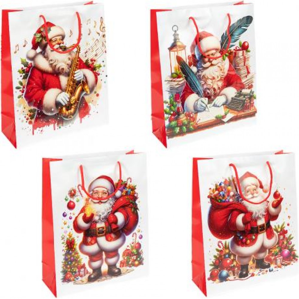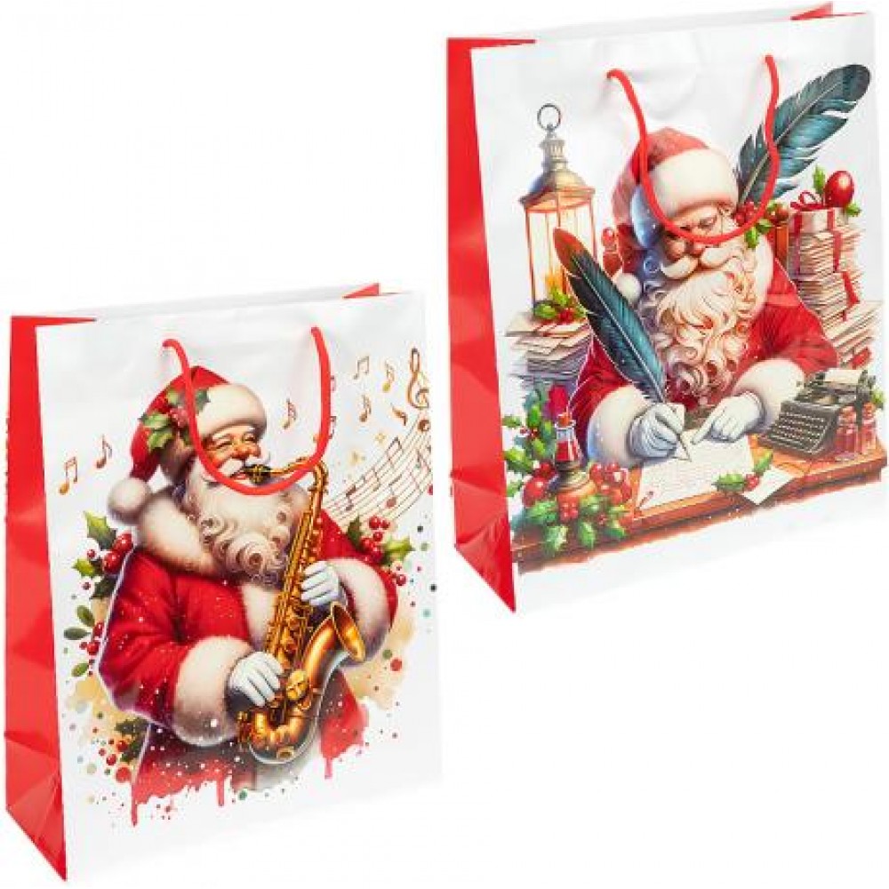 Подарунковий пакет «Новий Рік» розміром 32×44×11 см — святкова упаковка для подарунків середнього та великого розміру. Виготовлений із щільного ламінованого паперу з глянцевим покриттям, що додає блиску й захищає від вологи. На пакетах зображені яскраві новорічні сюжети з Дідом Морозом, подарунками та сніжинками. В упаковці — 12 штук (4 види дизайну). Оснащений міцними шнурковими ручками, зручними для перенесення. Ідеально підходить для пакування святкових презентів.