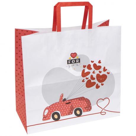 Паперовий пакет з розмірами 32х15х30 см, виготовлений з паперу 100 г/м². Має прямокутні кольорові паперові ручки. Друк виконано в 4 кольорах Pantone з основним дизайном з обох боків та 1 кольором чорного Pantone для вихідних даних і штрих-коду. Упаковка містить 10 штук одного дизайну.