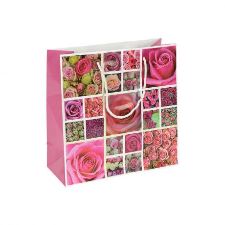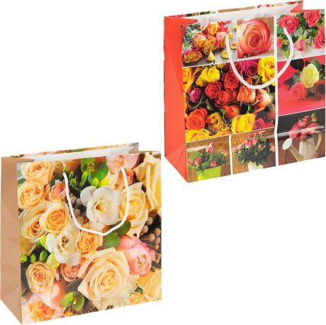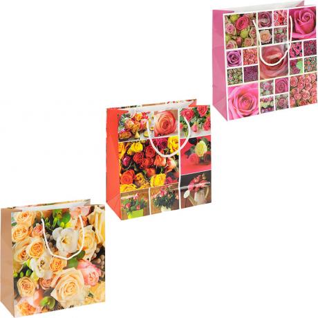 Пакет подарунковий квадрат "Квіти" з глянцевою поверхнею. Розміри 24х24х10 см. Має ручки-шнурки. У наборі 12 штук. Кольори представлені в асортименті.