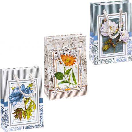 Пакет подарунковий МІНІ "Квіти" МІКС має глянцеву поверхню та ручки зі стрічки. Розмір пакета 8х12х3,5 см. Упаковка містить 12 штук з чотирма різними малюнками. Кольори представлені в асортименті.