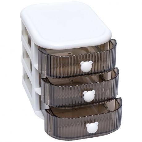 Настільний органайзер з 3 відділеннями, 13×14×18 см — компактне та зручне рішення для зберігання канцелярії, дрібних аксесуарів, косметики та інших потрібних речей. Прозорі висувні шухлядки з декоративними ручками забезпечують легкий доступ до вмісту, а білий корпус додає охайності та стилю. Органайзер не займає багато місця і чудово пасує до інтер’єру офісу, дому чи навчального столу. Ідеальний для підтримання порядку.