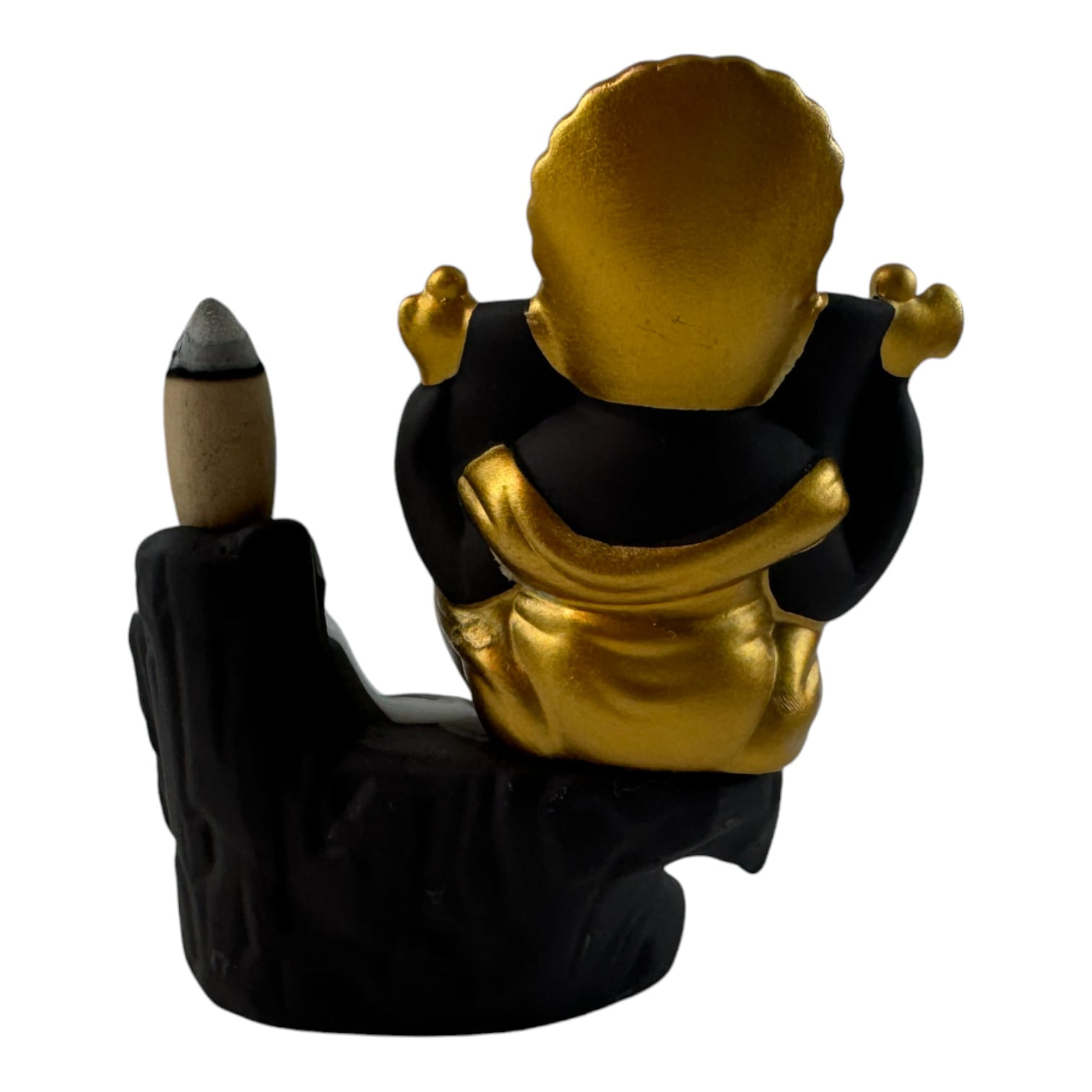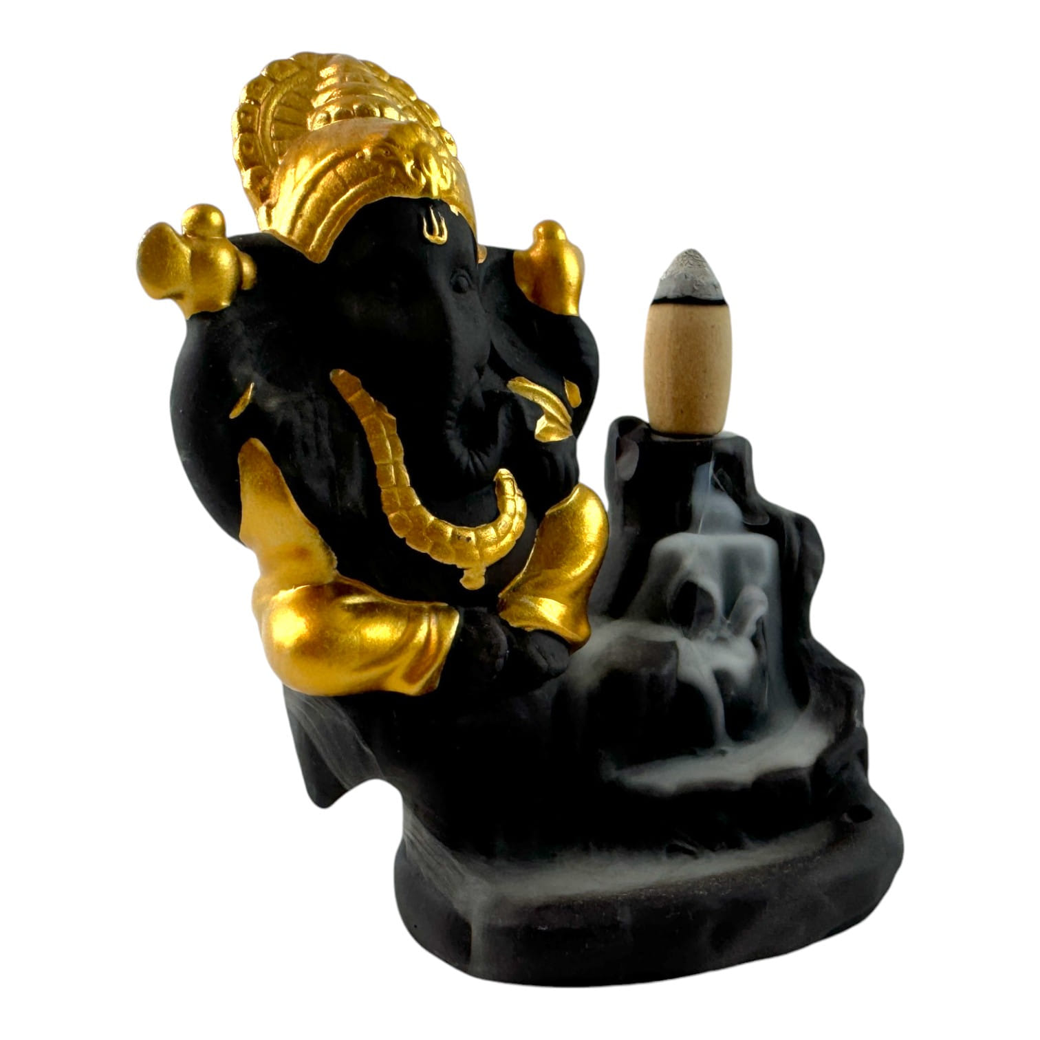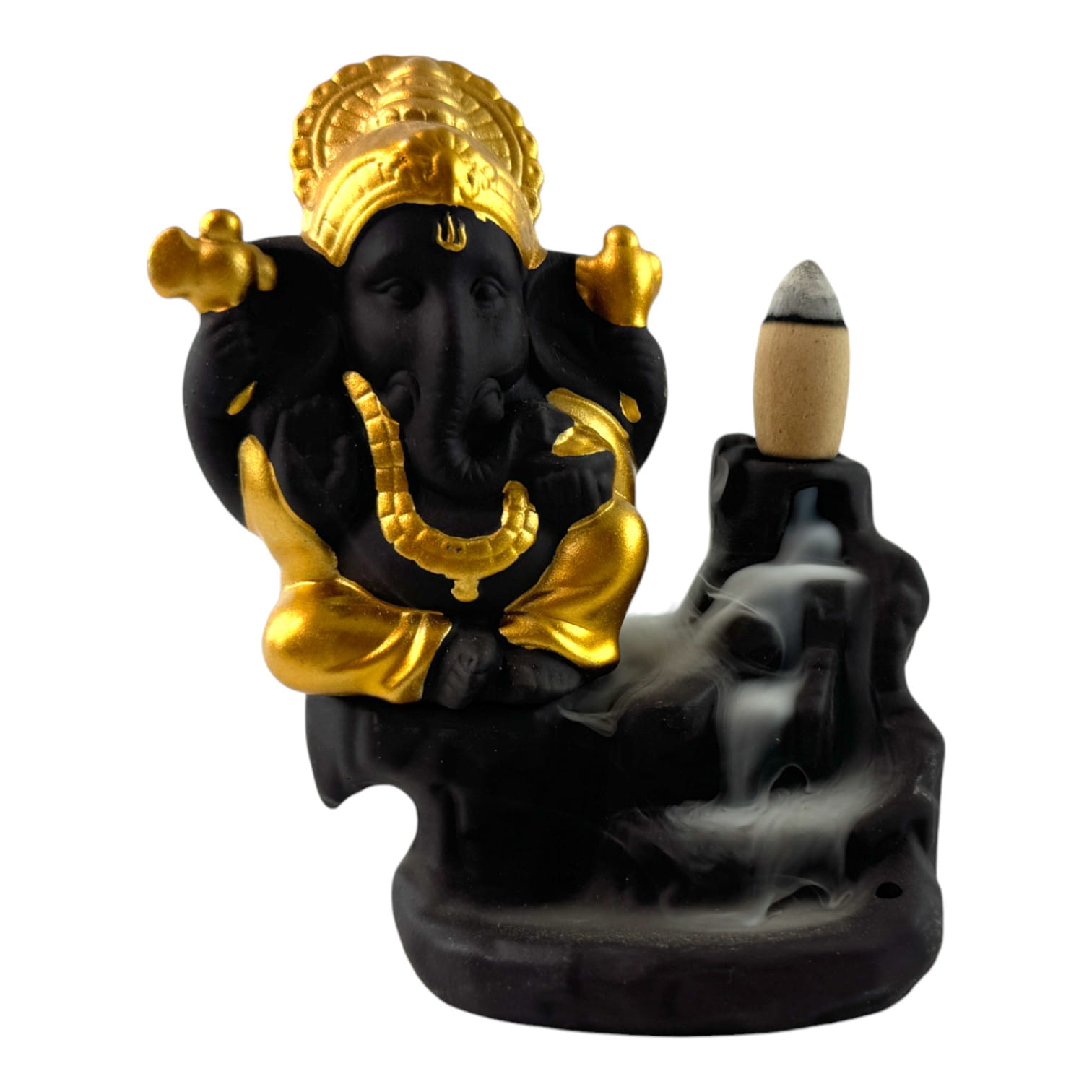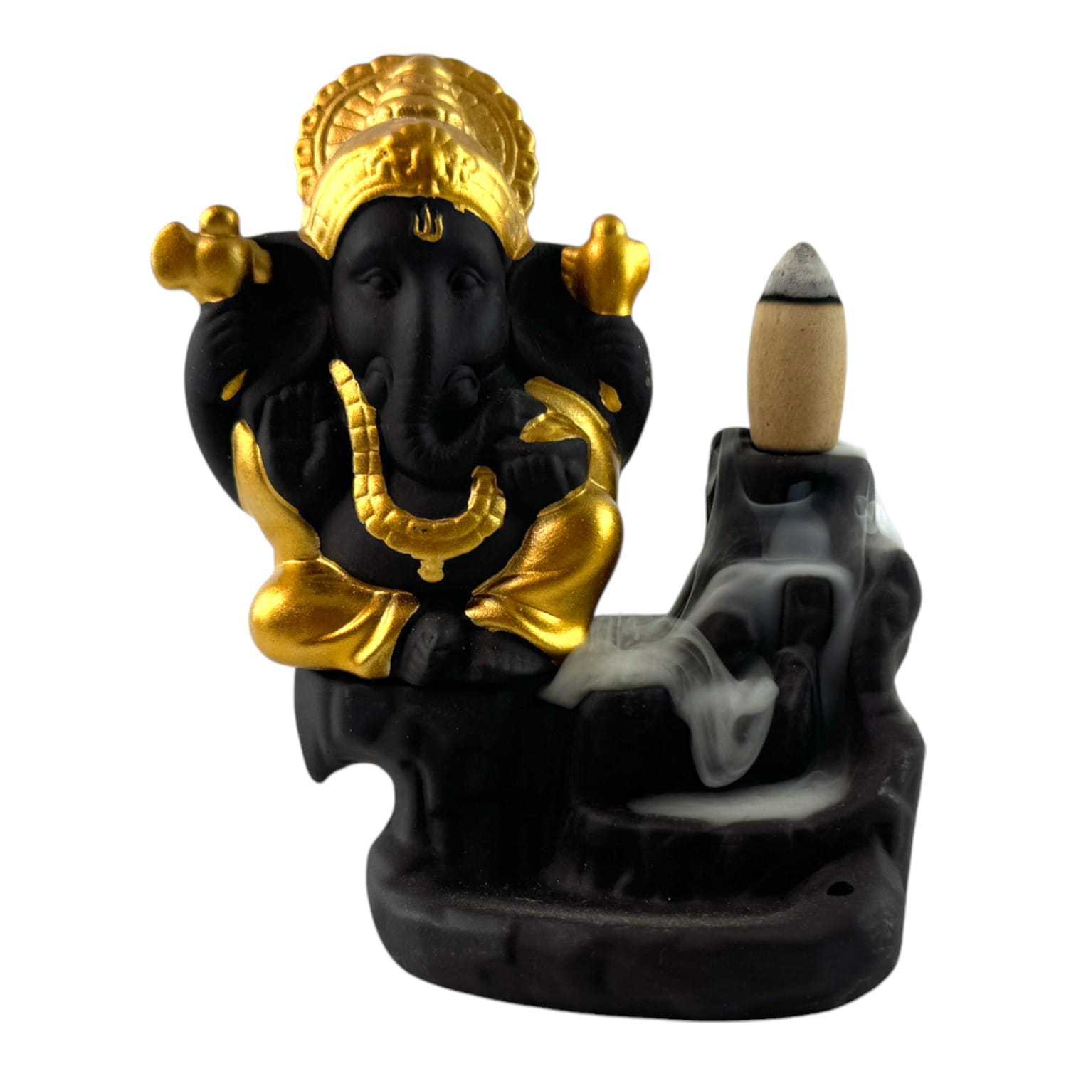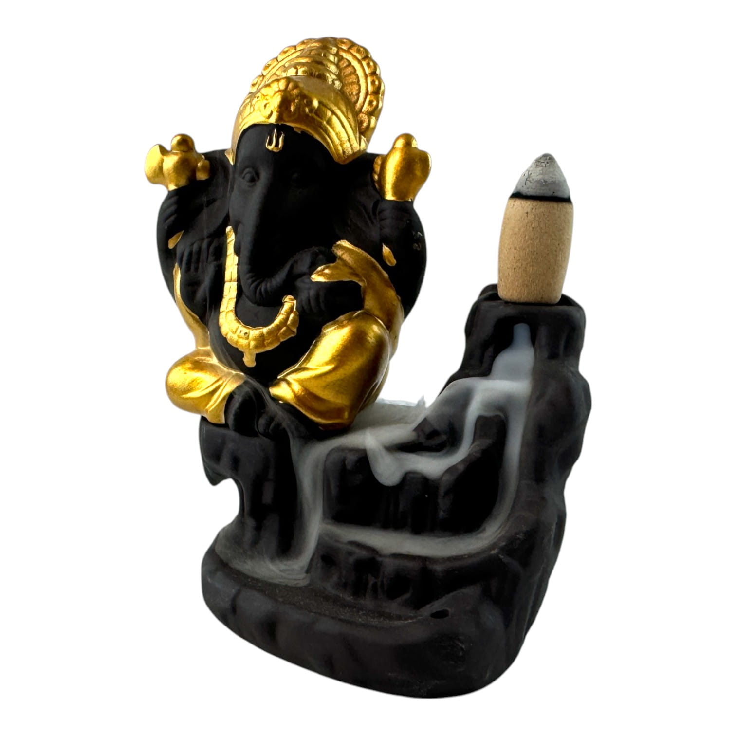 Эта элегантная подставка для благовоний с изображением божества Ганеши выполнена в технике back flow, что позволяет дыму плавно стекать вниз, создавая завораживающий визуальный эффект. Ганеша, украшенный золотыми деталями, символизирует мудрость, удачу и защиту от препятствий. Такая подставка станет прекрасным украшением интерьера, привносящим спокойствие и духовную гармонию. Она идеальна для медитаций, релаксации и создания благоприятной атмосферы дома или в рабочем пространстве.