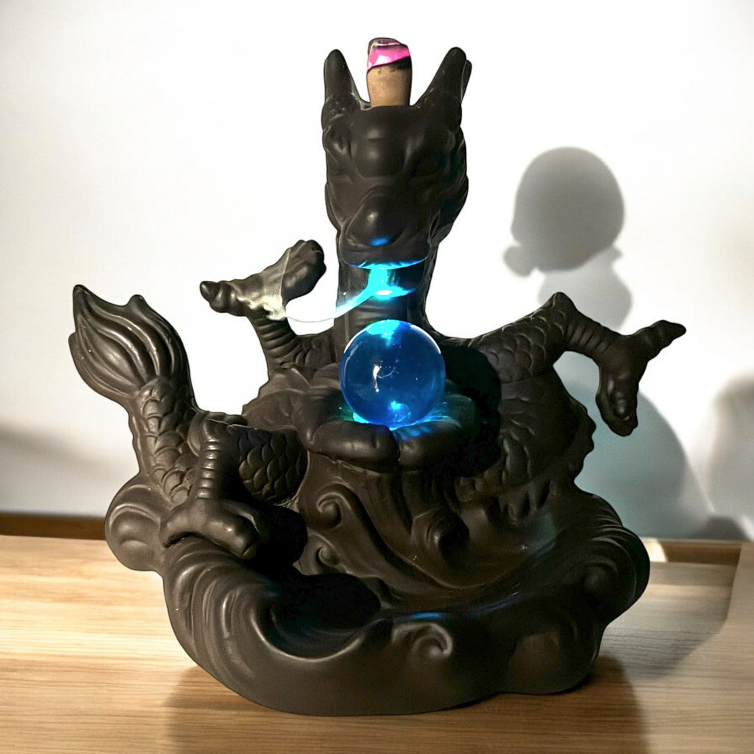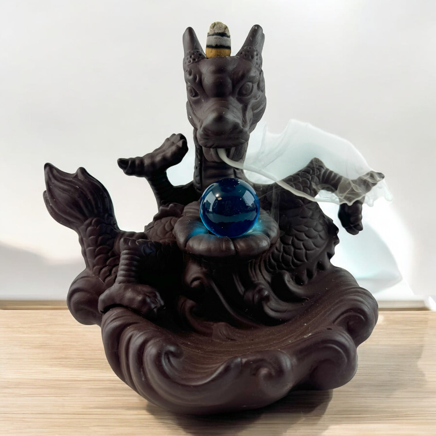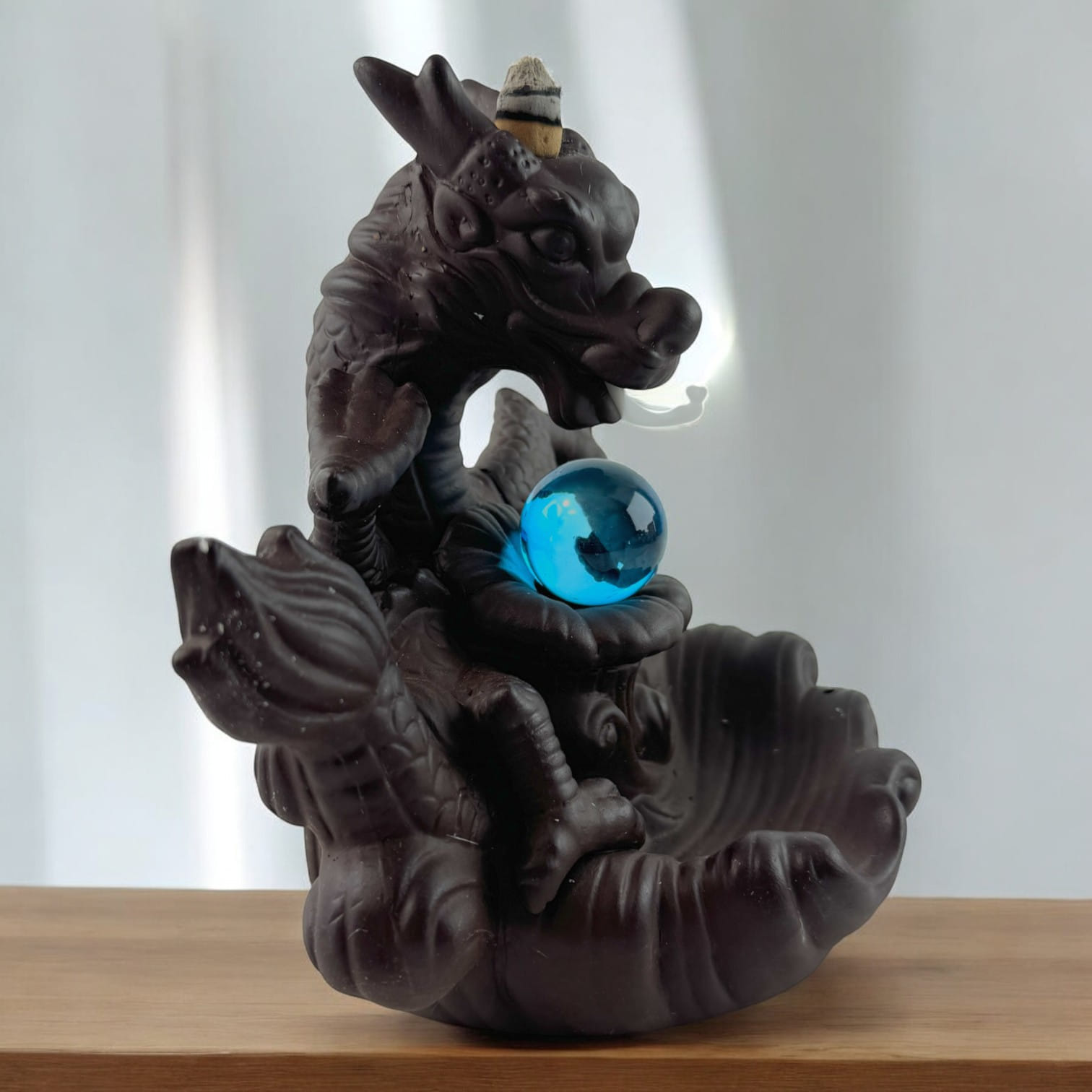 Эффект Back Flow и подсветка делают эту подставку настоящим произведением искусства. Специальный конус для благовоний, установленный на голове дракона, создаёт завораживающий эффект, когда дым плавно струится вниз, проходя через пасть и окутывая светящуюся сферу. Это создаёт визуальный эффект загадочного тумана или магического дыхания, который притягивает взгляд и помогает сосредоточиться, очищая ум от лишних мыслей