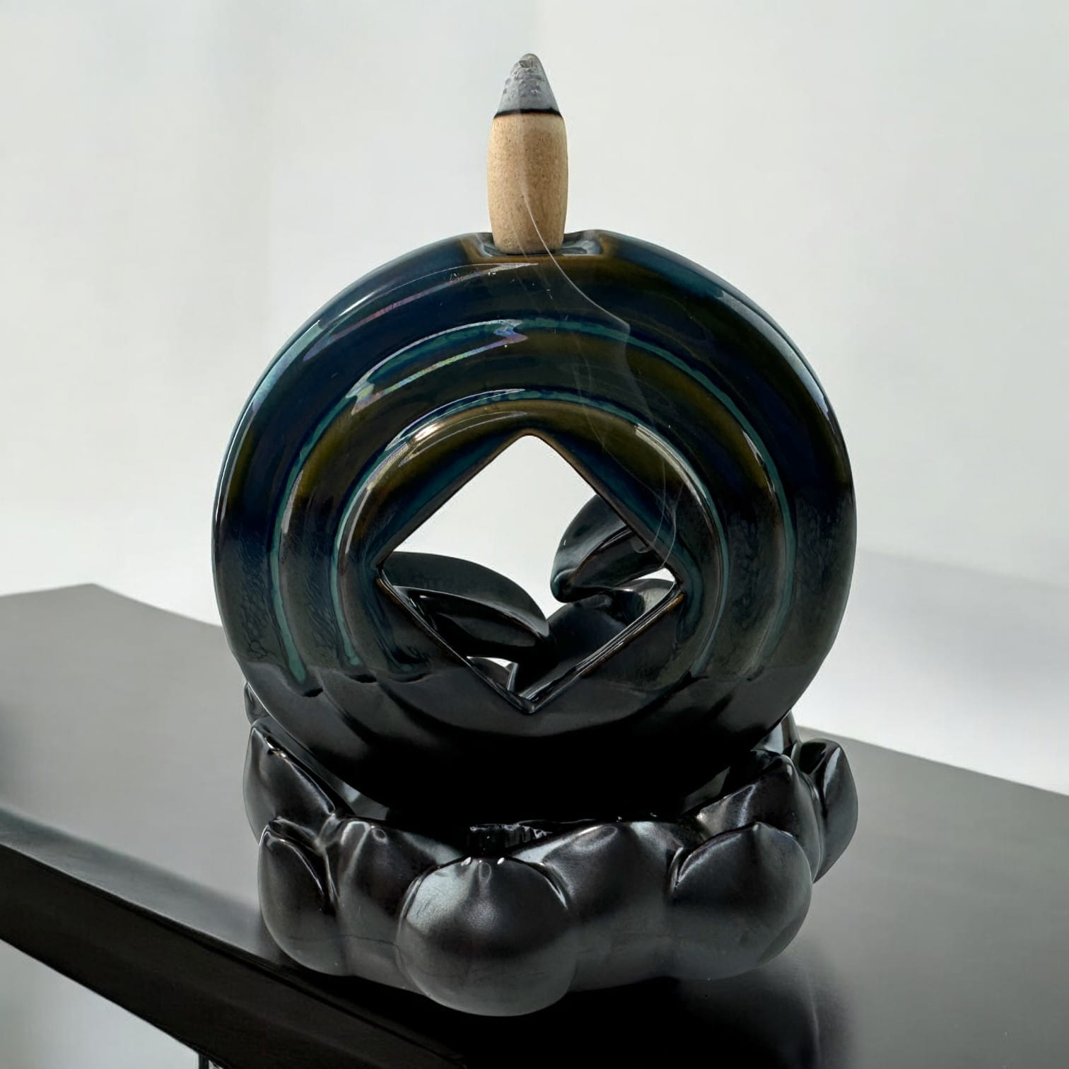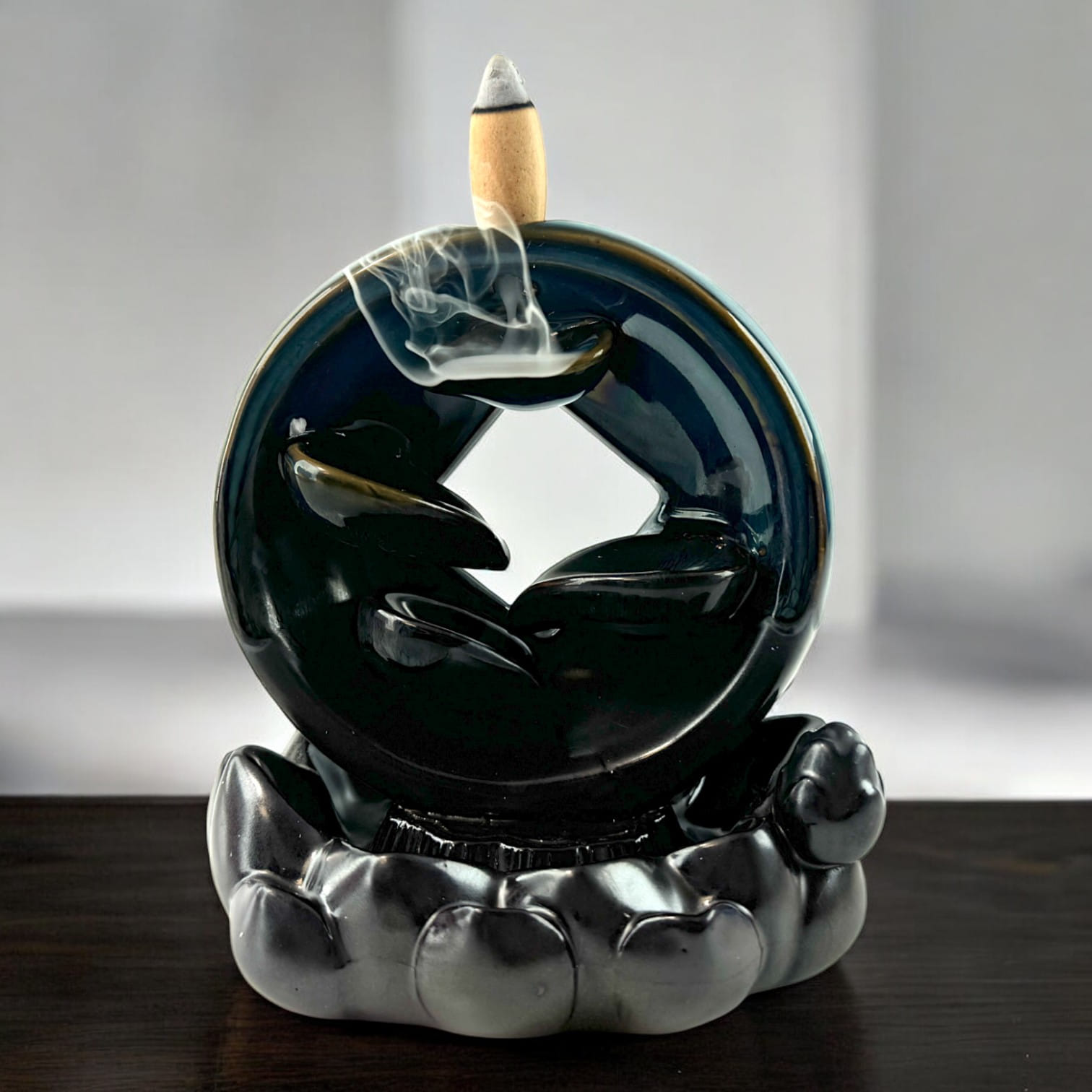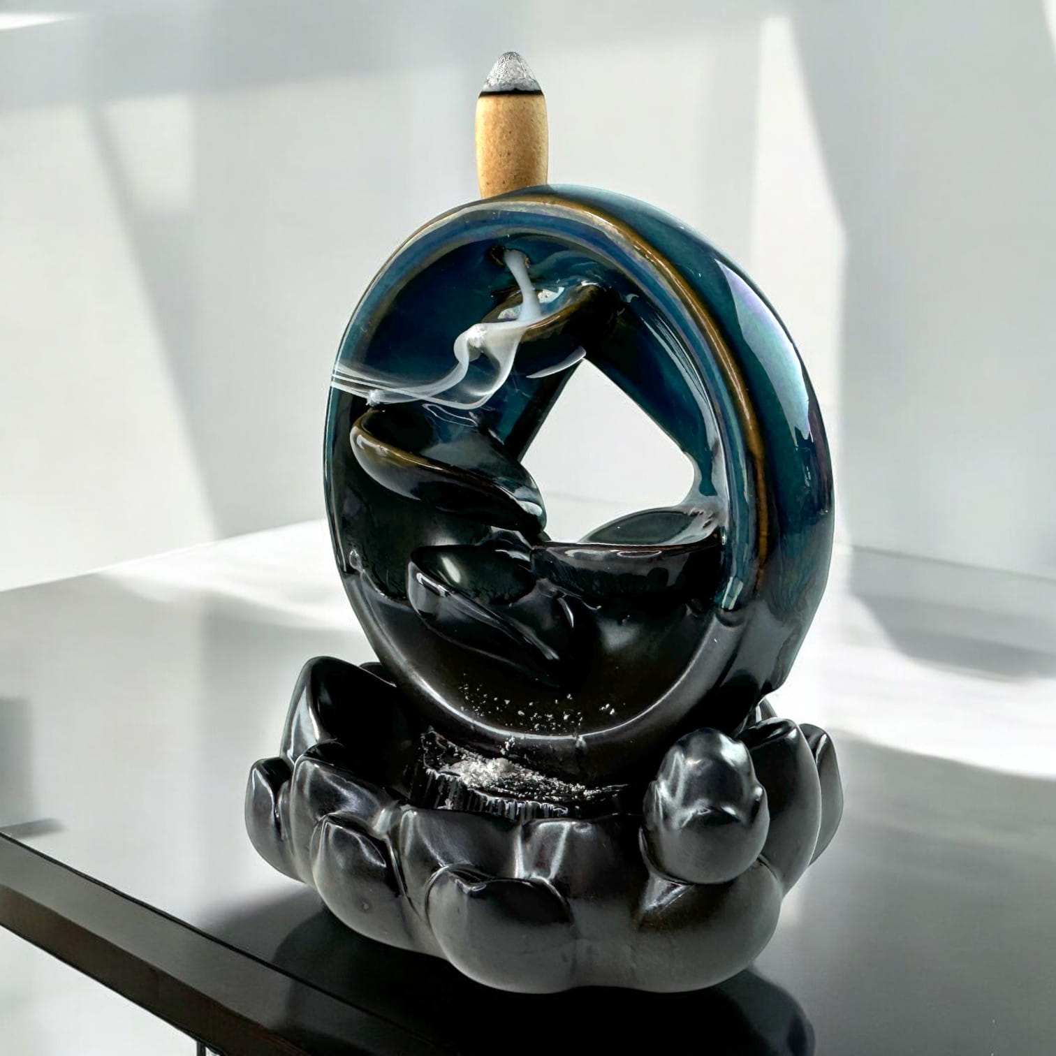 Эта элегантная подставка для благовоний Back Flow с каскадным эффектом выполнена в виде кругового водопада. Каждая деталь тщательно проработана, создавая впечатление плавных потоков воды, текущих вниз по каменным уступам. Подставка имеет глянцевое покрытие тёмного оттенка с изумрудным отливом, что придаёт ей выразительный и мистический вид. Когда на неё устанавливается конус для благовоний, дым плавно стекает по каскаду, образуя завораживающий эффект водопада, усиливая атмосферу спокойствия и умиротворения.