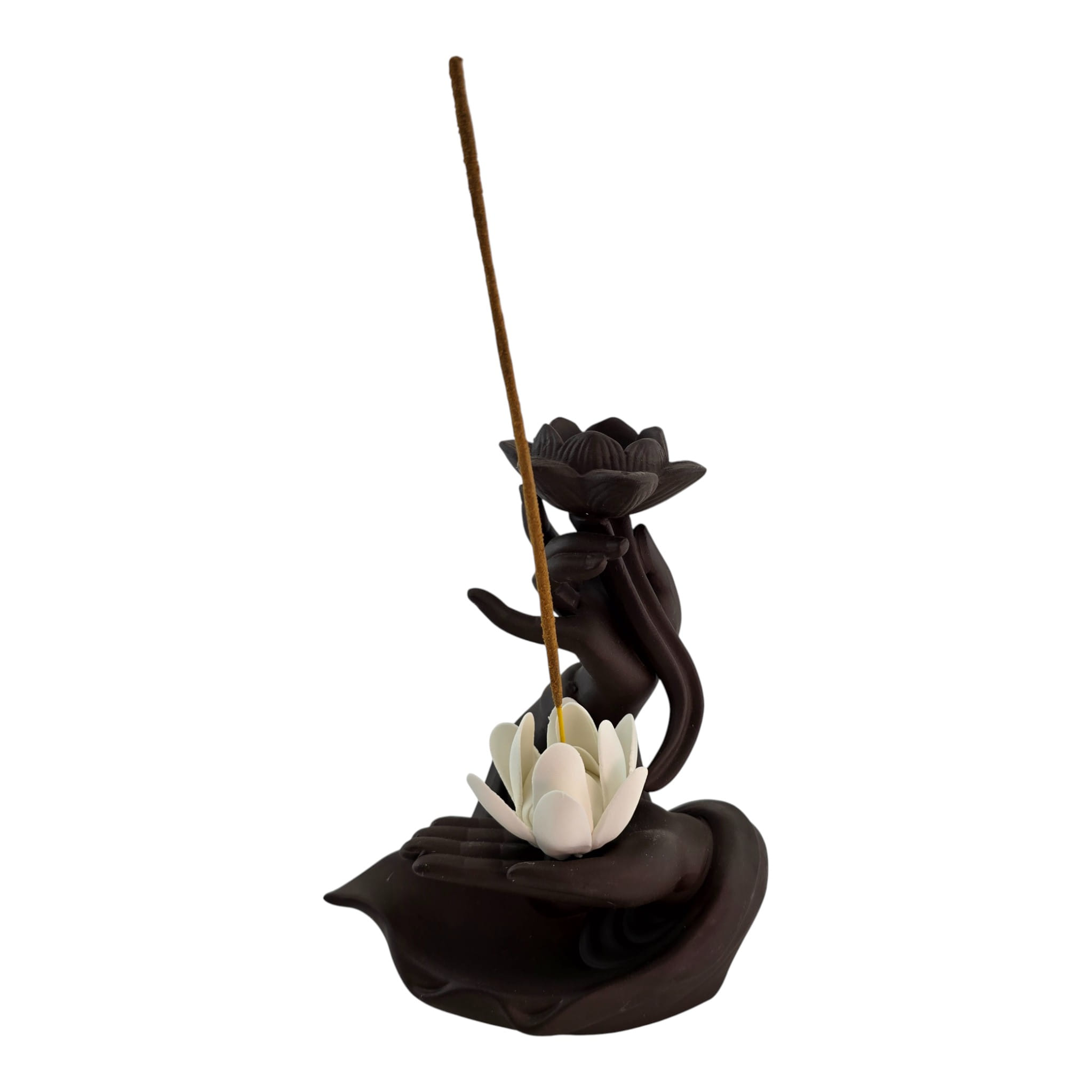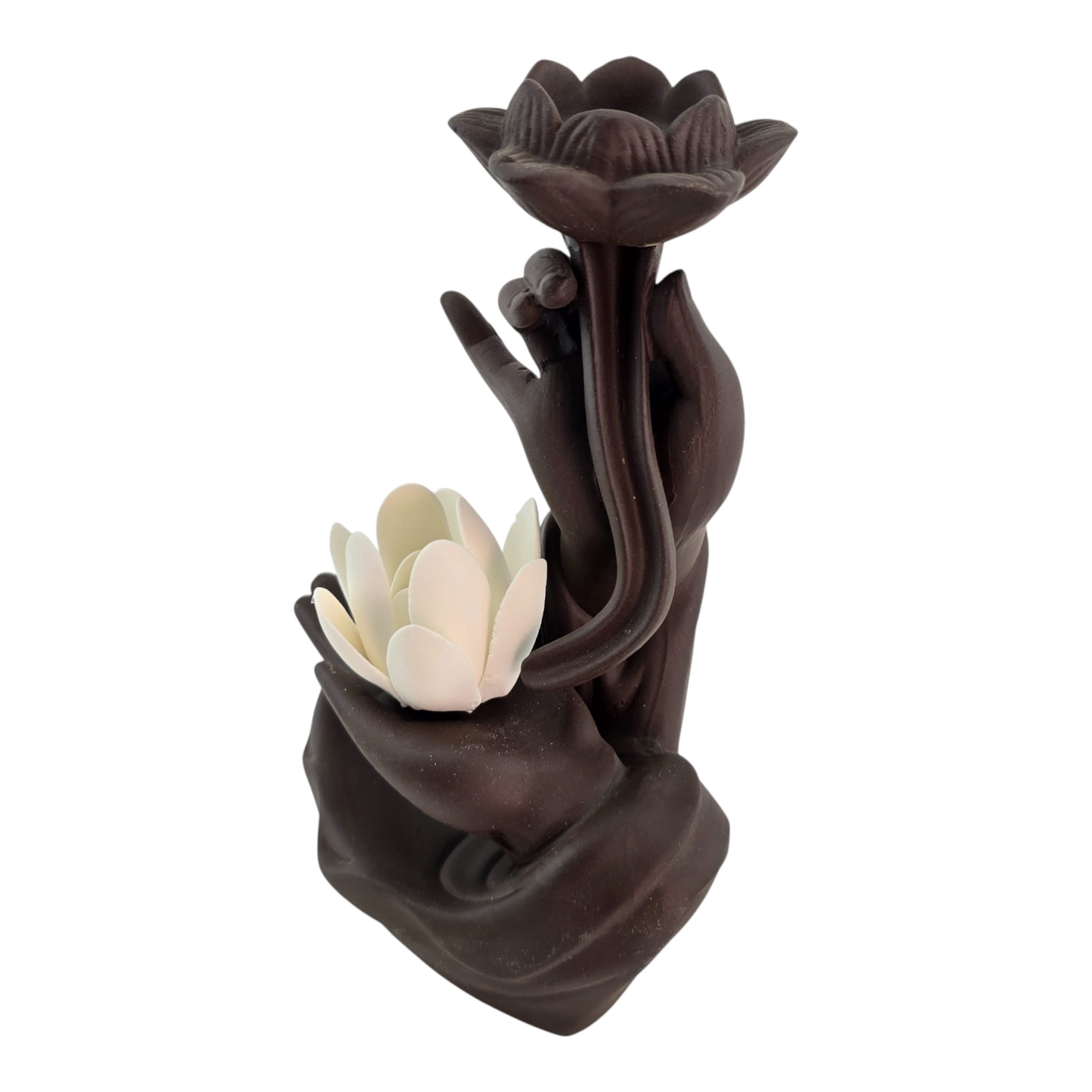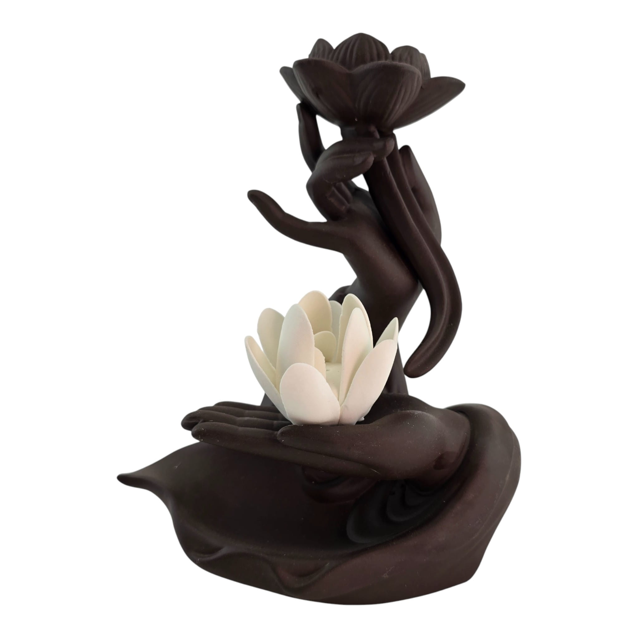 Эстетичная керамическая подставка в виде ладони с белым лотосом и цветком сверху. Подходит для палочек и конусов благовоний: палочка устанавливается сбоку, конус ставится в верхний цветок. Форма направляет дым мягкими завитками и защищает поверхность от пепла. Подойдёт для домашнего алтаря, уголка медитации, йога-студии или как приятный подарок любителям ароматерапии. Возможны небольшие отличия оттенков и фактуры.