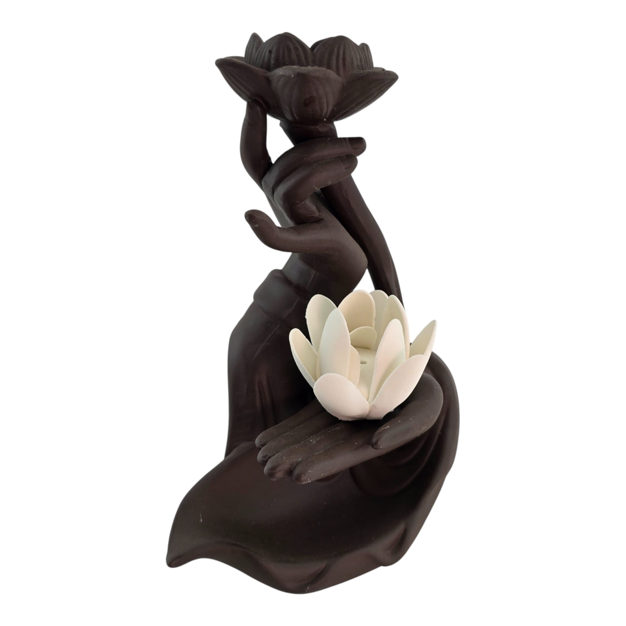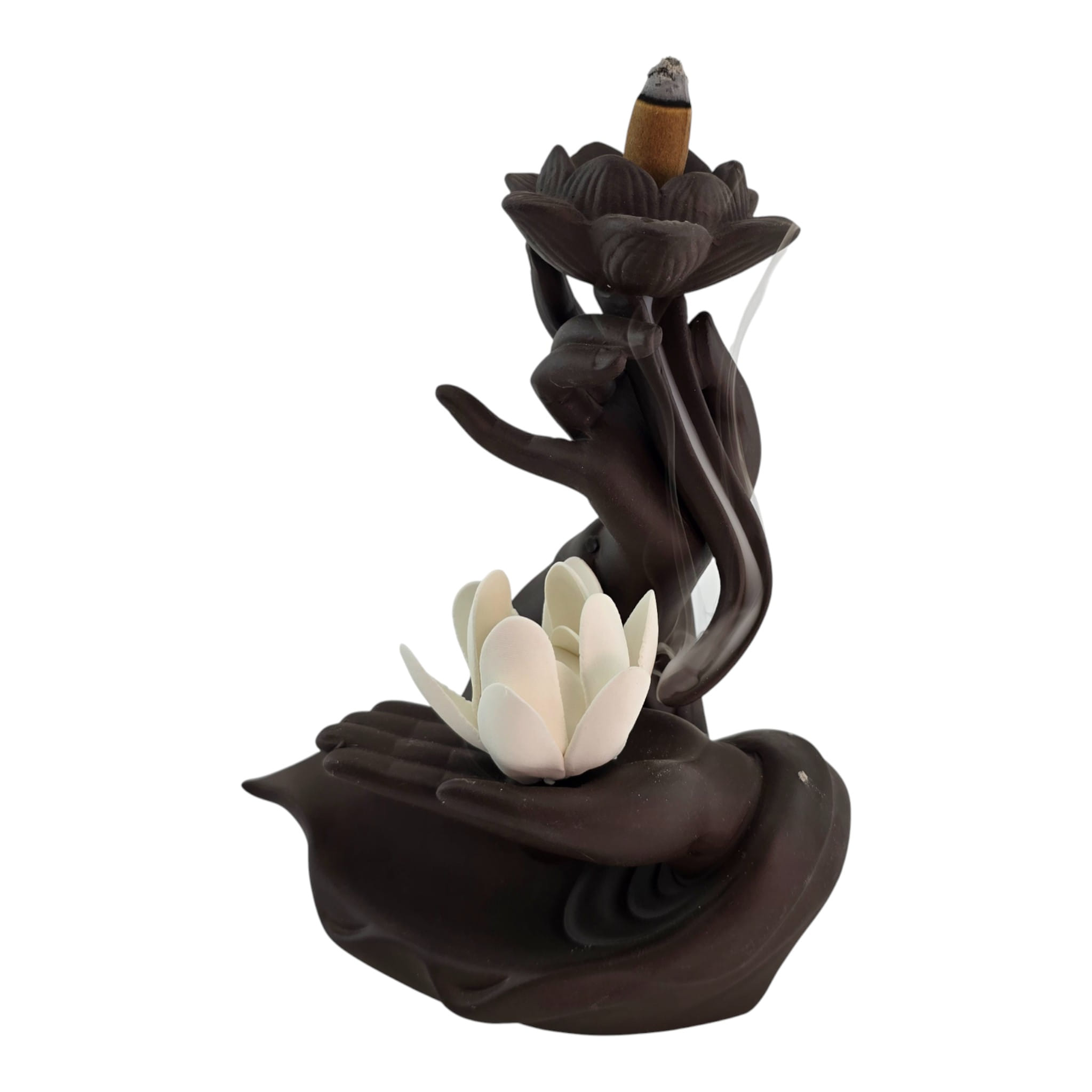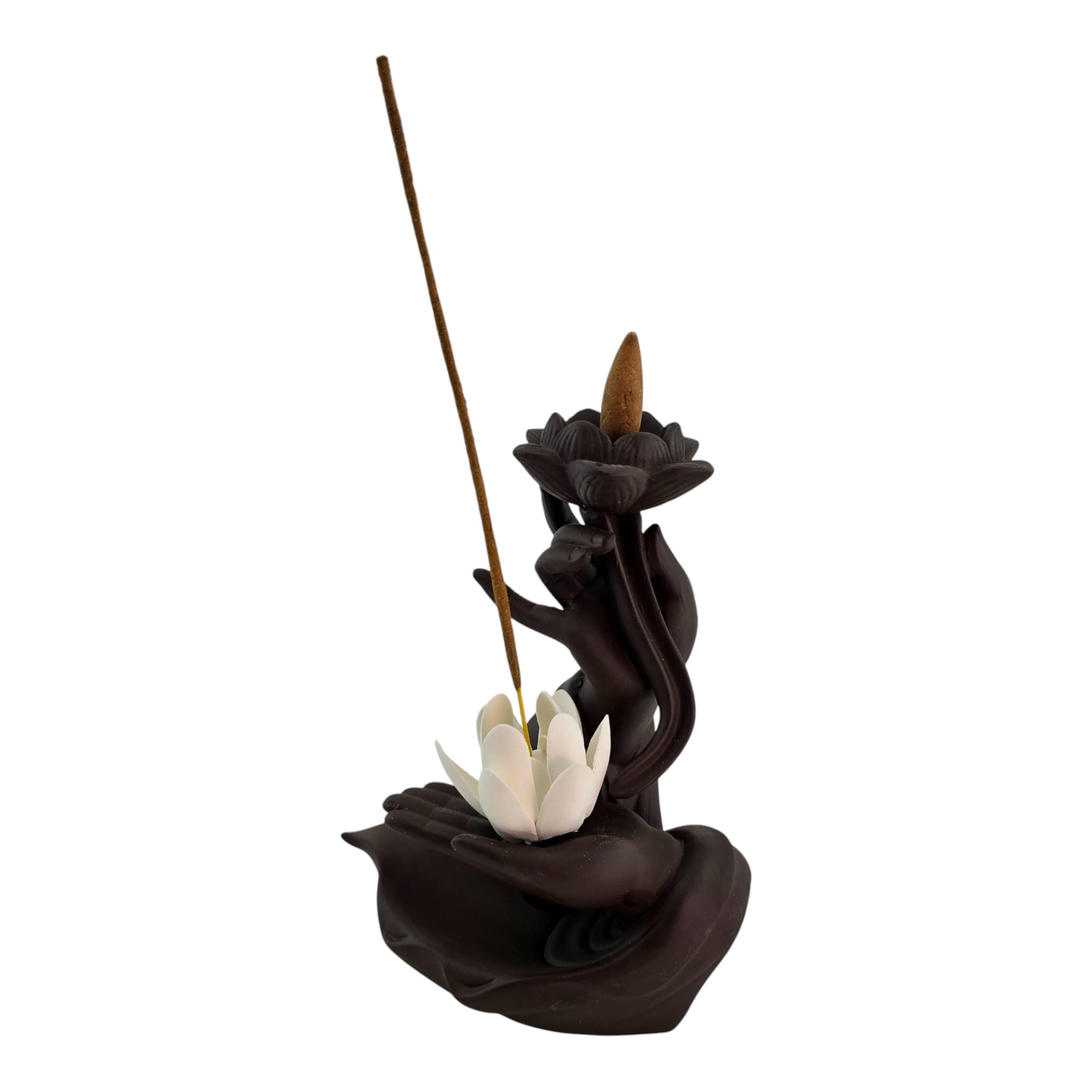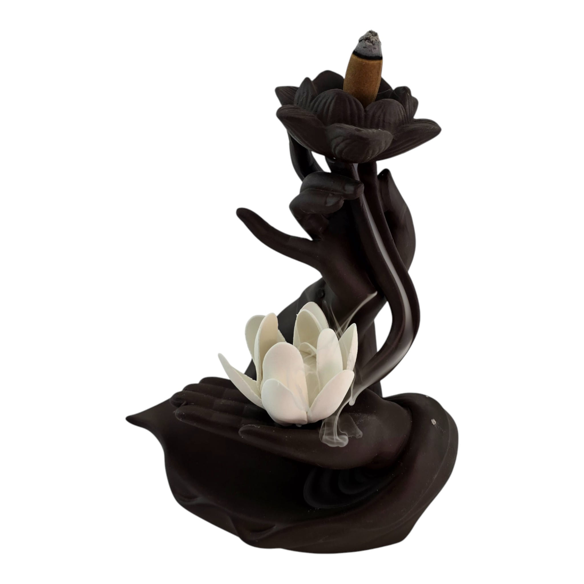 Эстетичная керамическая подставка в виде ладони с белым лотосом и цветком сверху. Подходит для палочек и конусов благовоний: палочка устанавливается сбоку, конус ставится в верхний цветок. Форма направляет дым мягкими завитками и защищает поверхность от пепла. Подойдёт для домашнего алтаря, уголка медитации, йога-студии или как приятный подарок любителям ароматерапии. Возможны небольшие отличия оттенков и фактуры.