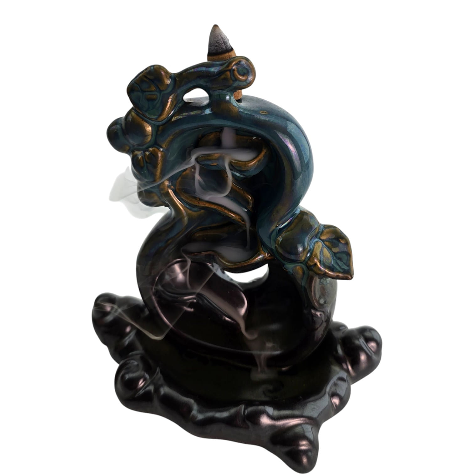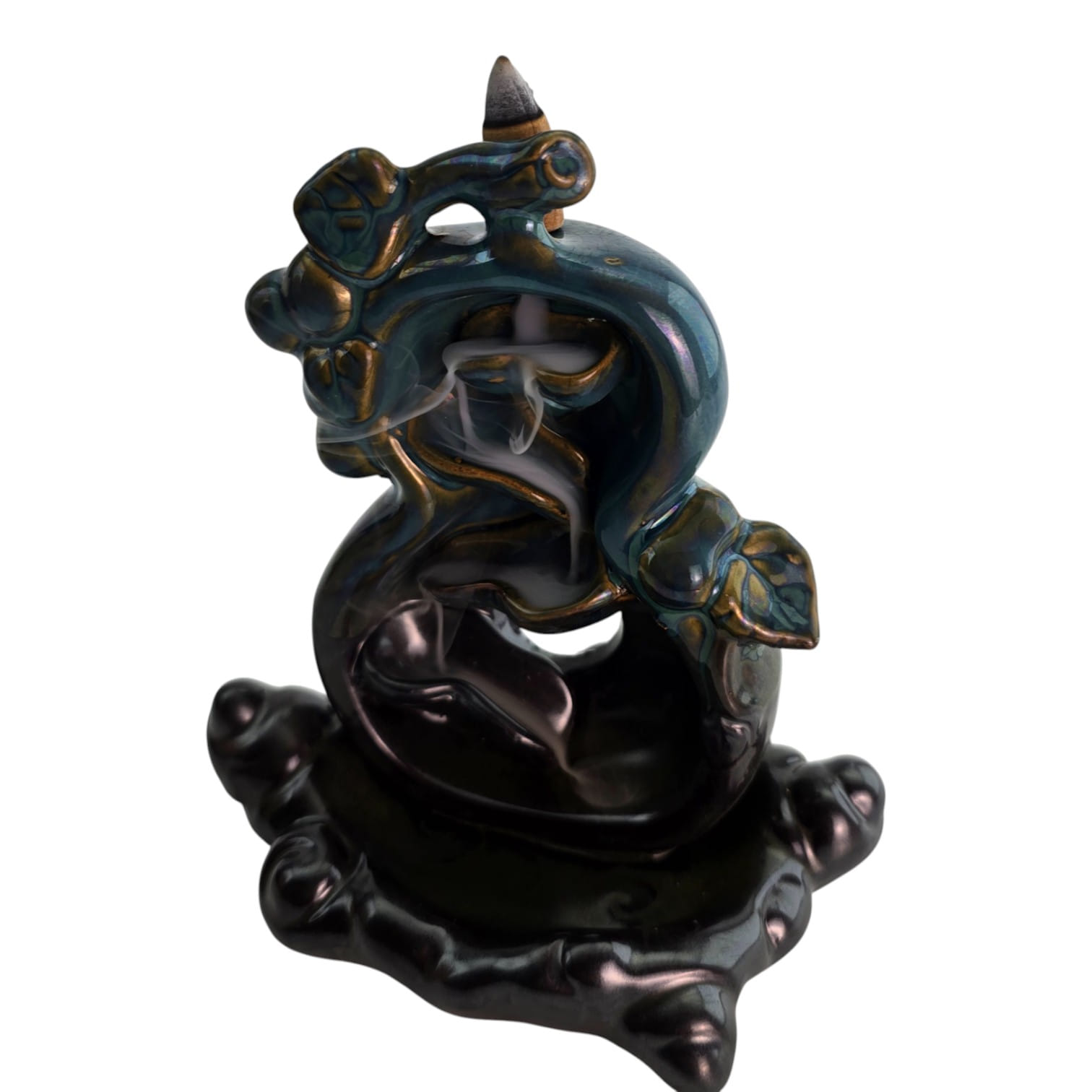 Керамическая подставка для конусных благовоний backflow с абстрактным волнообразным/растительным мотивом на декоративном основании. Дым от конуса мягко стекает в чашу, создавая эффект «водопада дыма». Подходит для медитации, релакса и восточного декора. Конусы в комплект не входят.