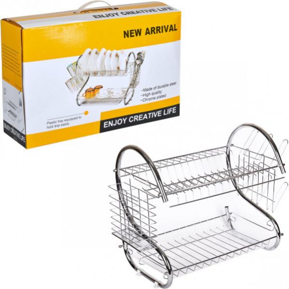 в комплекте: 2 полочки для сушки посуды, один пластиковый поддон, подставку для ложек и вилок, держатель для стаканов и антискользящие насадки. Дополнительные части можно использовать по-отдельности. Имеет отверстия для крепления к стене. Материал корпуса: хромированный металл. Материал поддона пластик. 2 яруса. Размер 40*25*36см