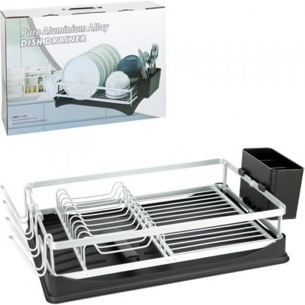 Настільна сушарка для посуду є зручним і практичним рішенням для кухні. Оснащена пластиковим піддоном зі зливом унизу для відведення води. Алюмінієвий тримач призначений для розміщення посуду та 4 чашок. У комплекті є пластикова підставка для ложок на 3 комірки розміром 15×10×7 см. Розмір сушарки без тримачів — 41×10×30 см. Розмір упаковки — 43×30×12 см, коробка має ручку для зручного транспортування. Підходить для щоденного використання та раціонального використання кухонного простору.