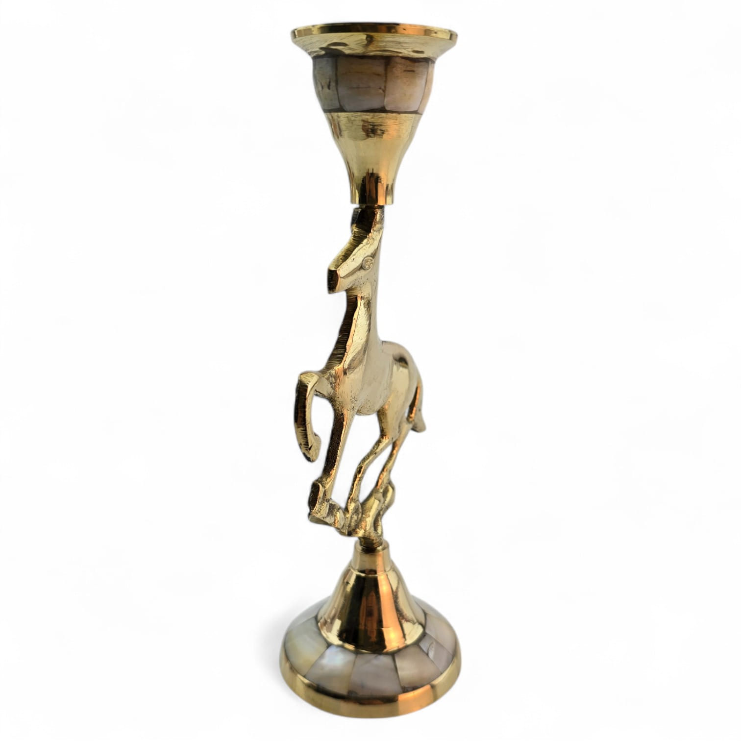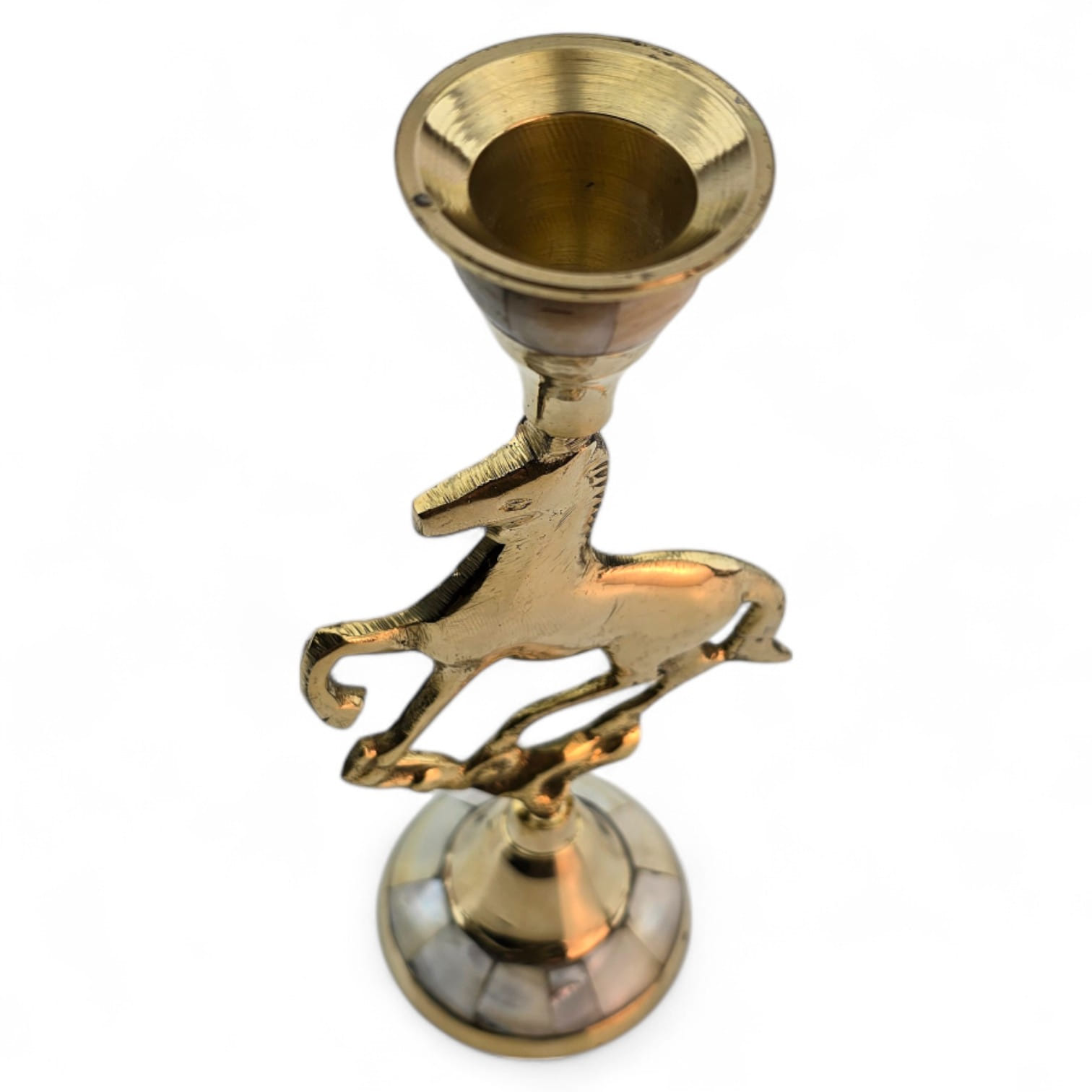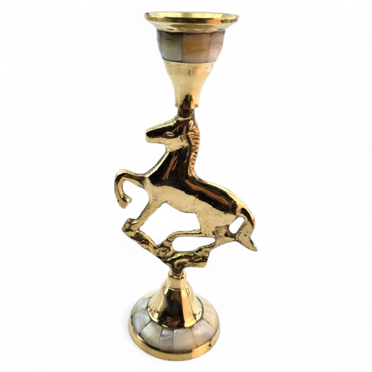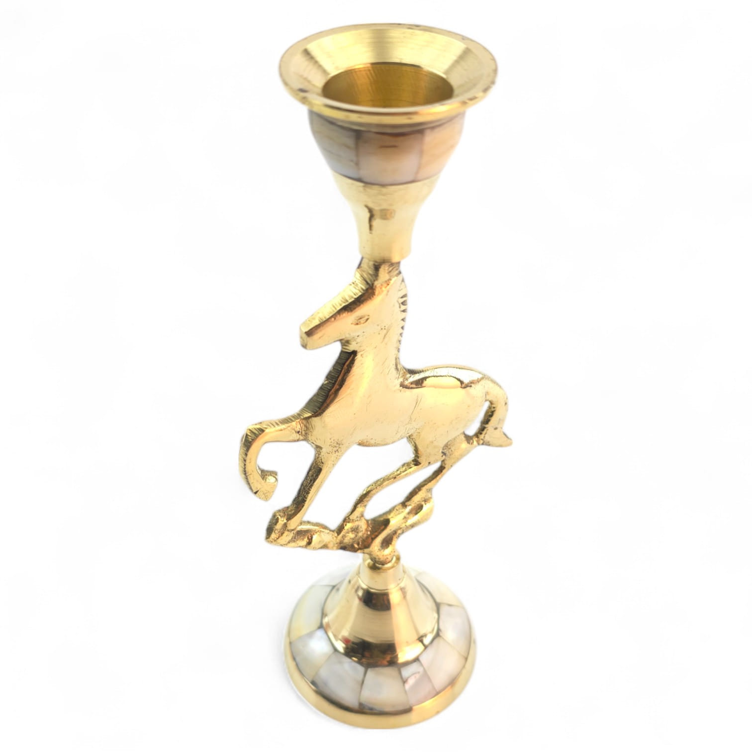 Элегантный латунный подсвечник с фигуркой скачущей лошади олицетворяет энергию, свободу и движение. Перламутровые вставки подчёркивают утончённый стиль изделия. Подходит для тонкой свечи диаметром 2 см.