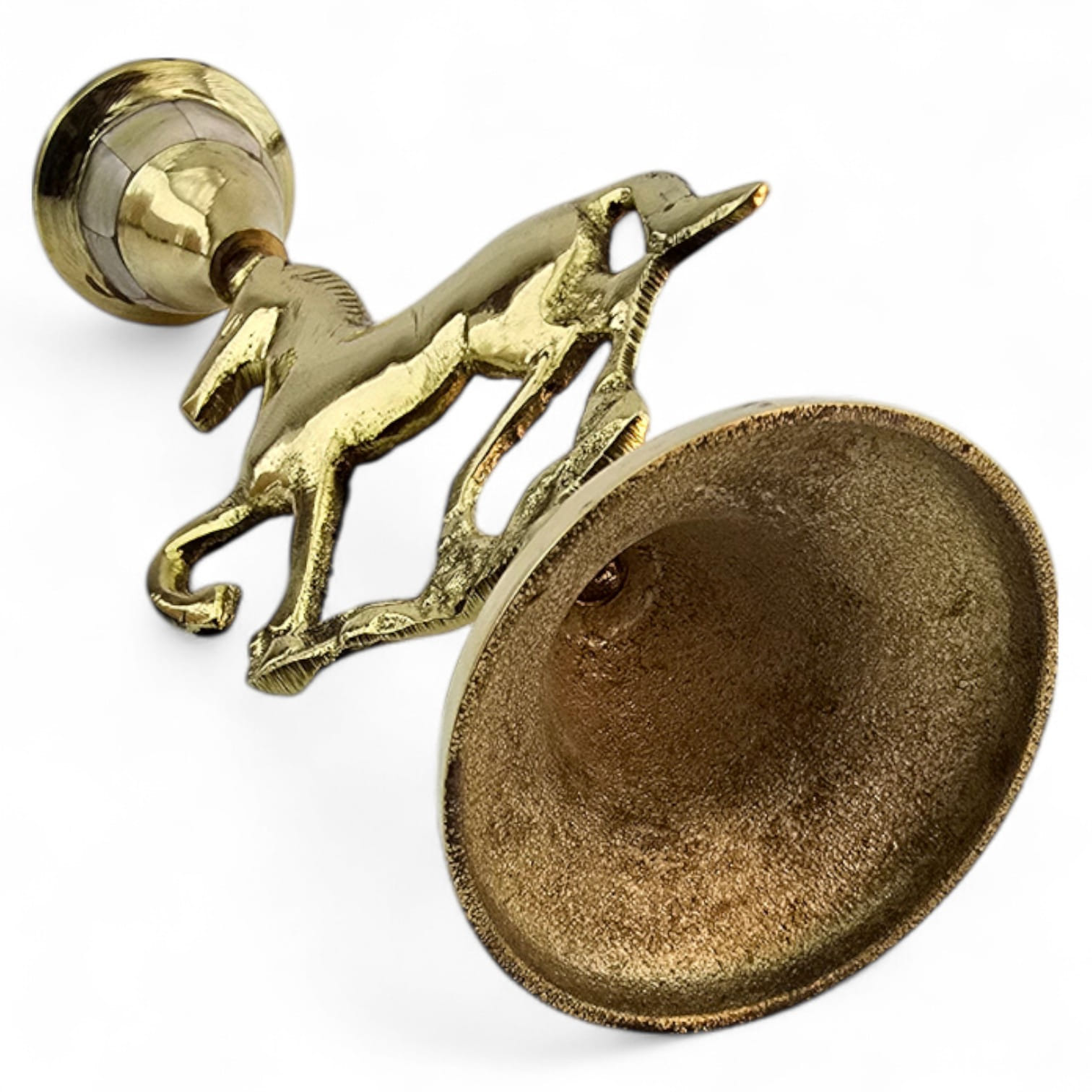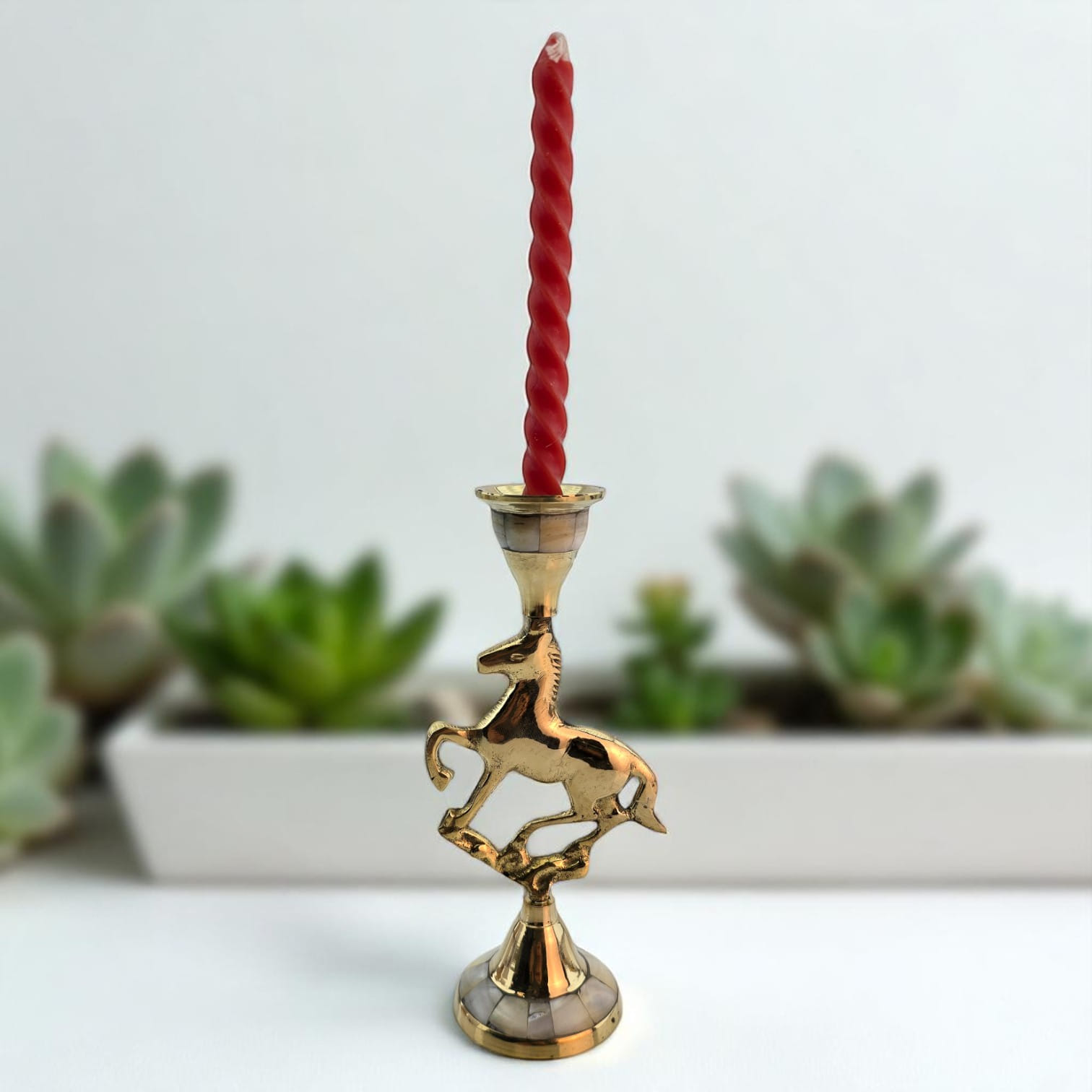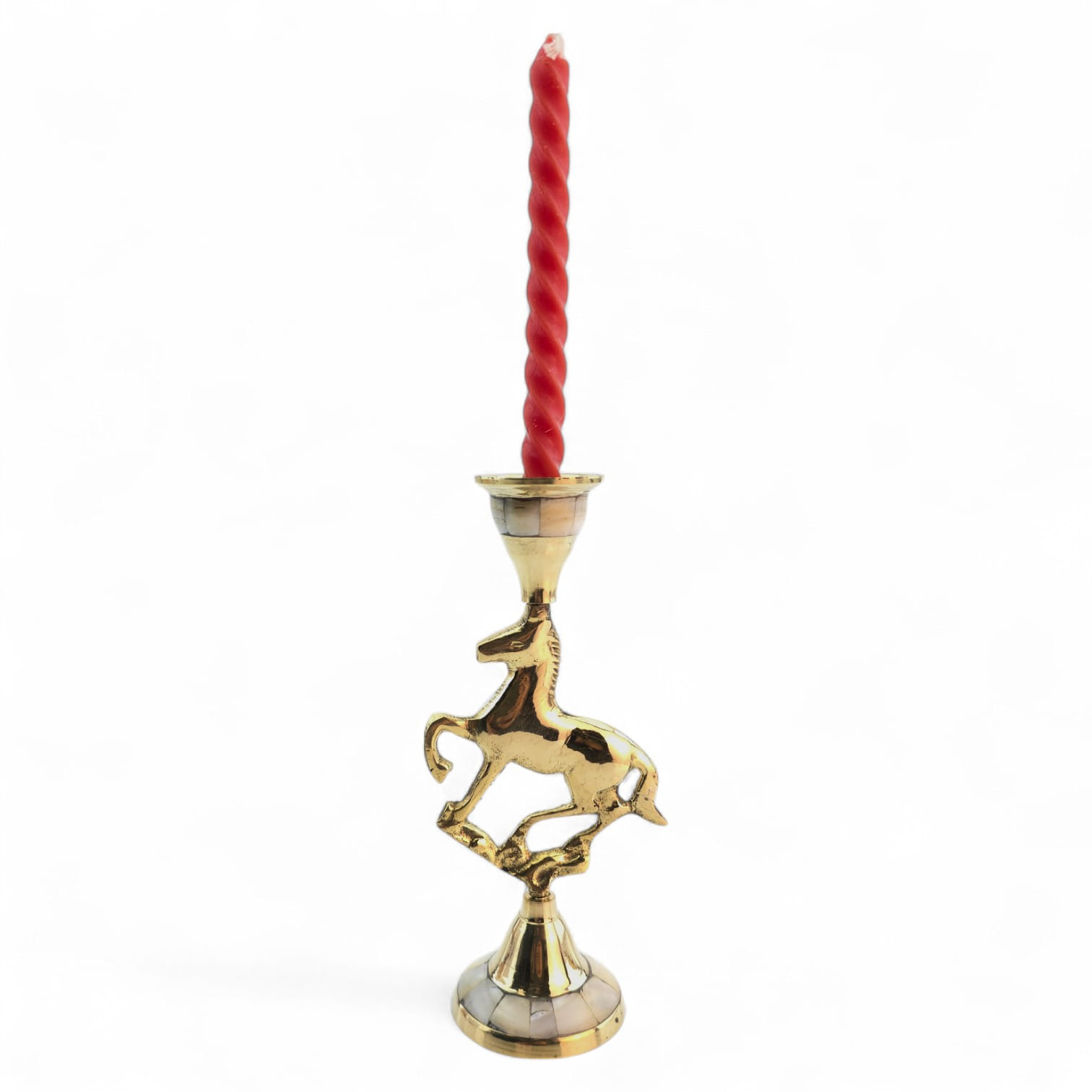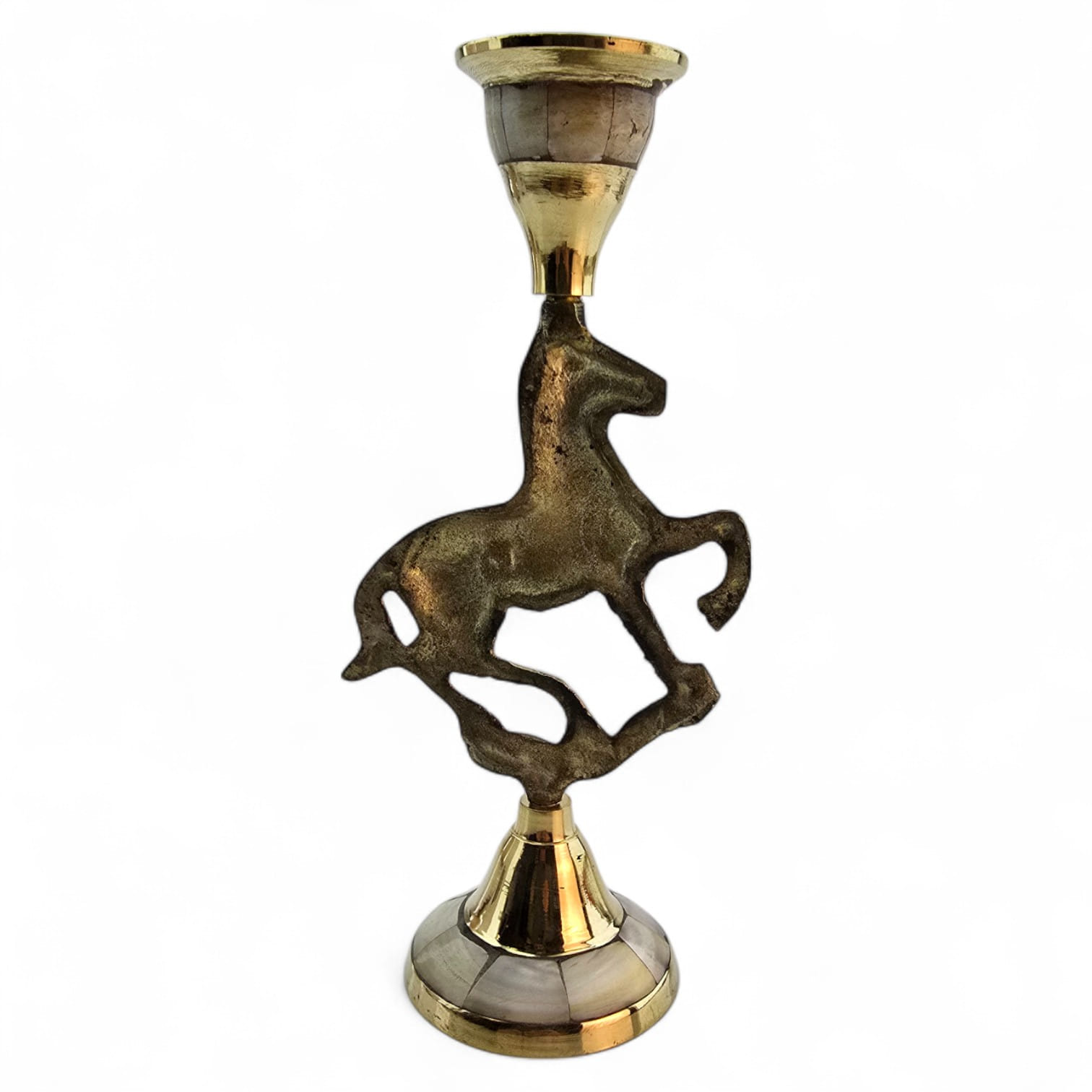 Элегантный латунный подсвечник с фигуркой скачущей лошади олицетворяет энергию, свободу и движение. Перламутровые вставки подчёркивают утончённый стиль изделия. Подходит для тонкой свечи диаметром 2 см.