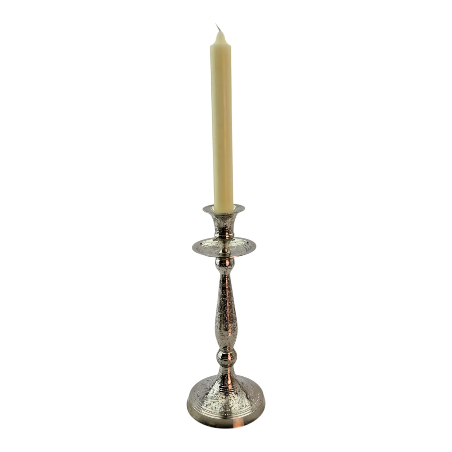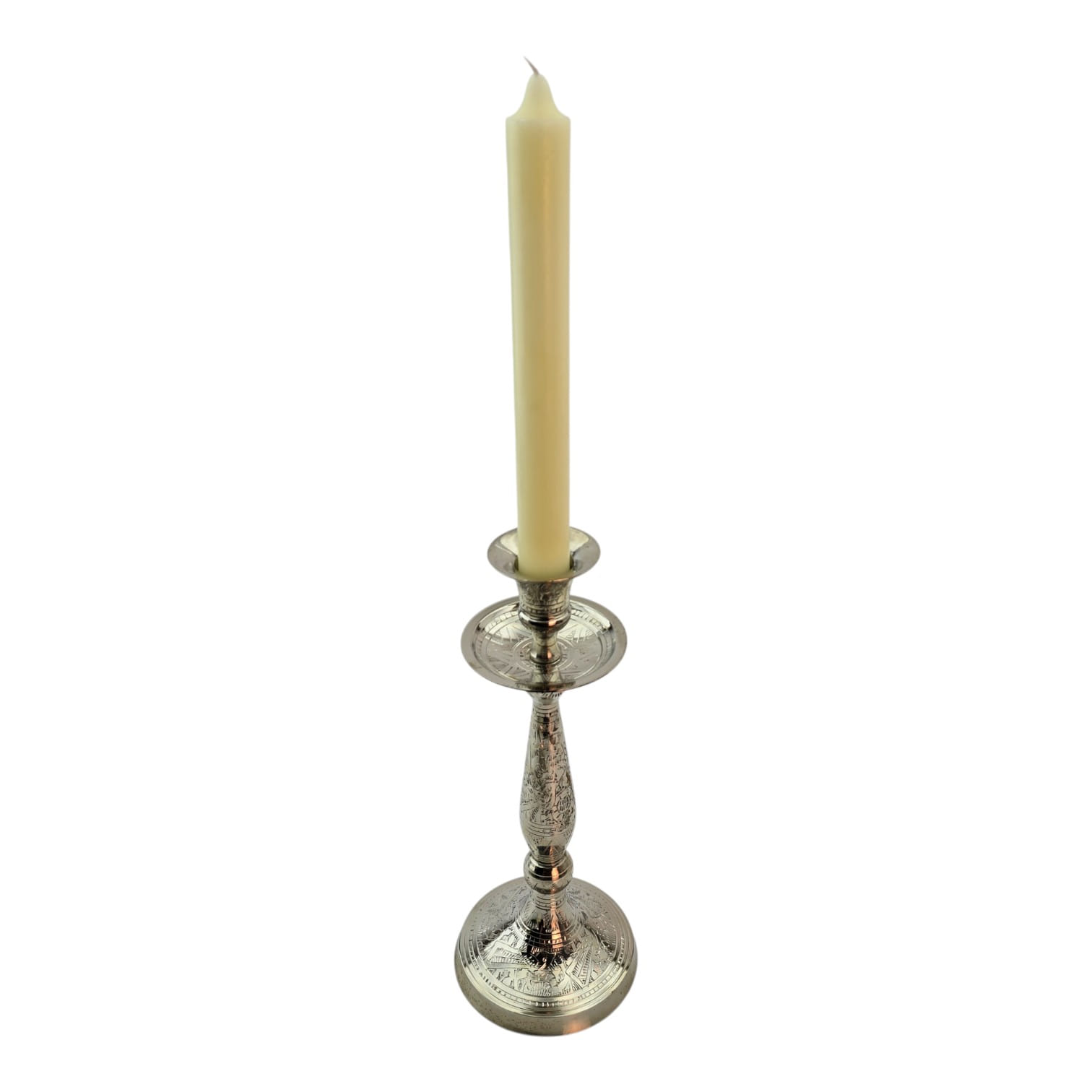 Классический металлический подсвечник из бронзы с покрытием под серебро. Есть блюдце для сбора воска. Подходит для тонких свечей диаметром до 2 см. Свеча в комплект не входит. Возможны небольшие отличия от фото и мелкие погрешности, характерные для индийского производства.