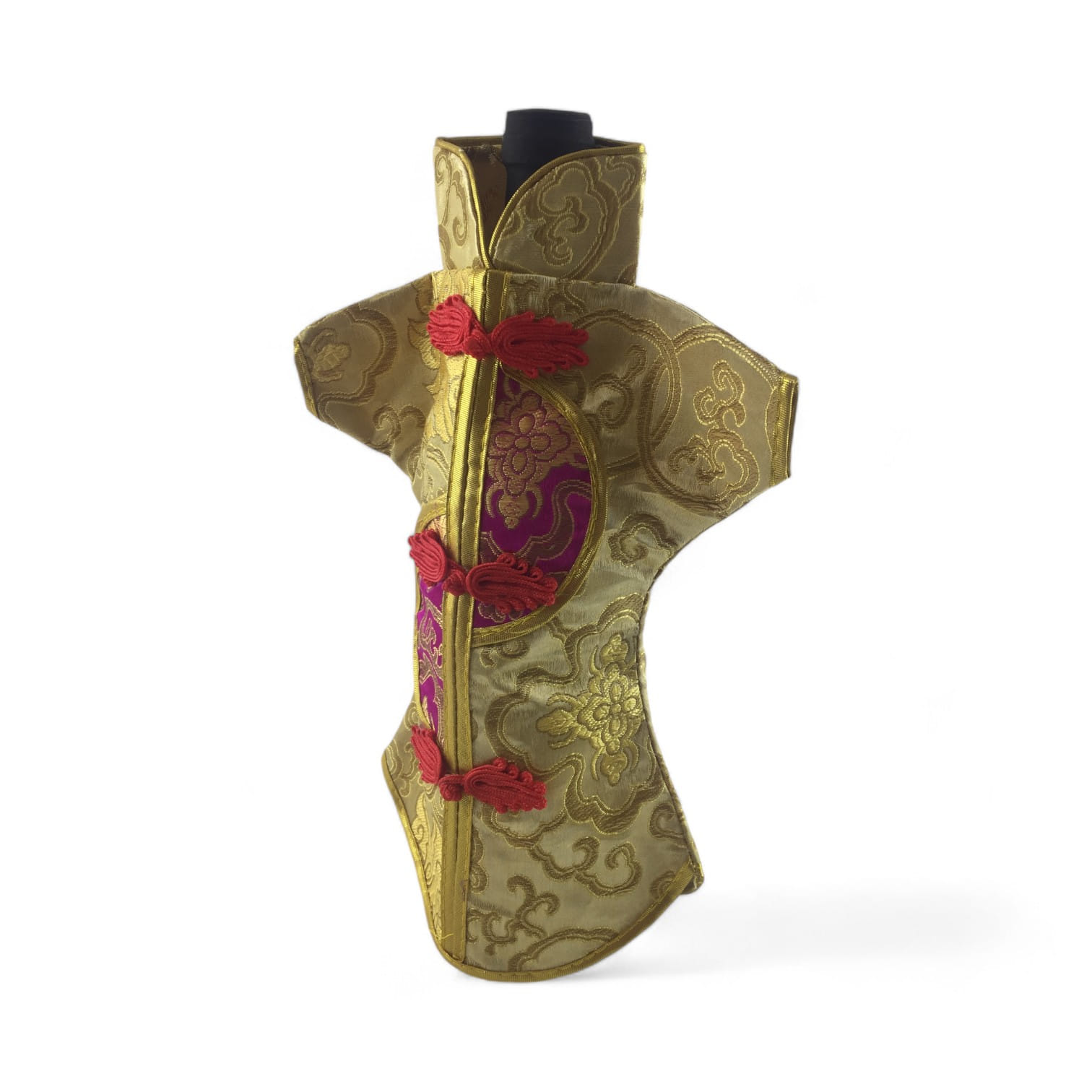 Этот элегантный чехол на бутылку выполнен в традиционном восточном стиле и напоминает миниатюрное кимоно. Он изготовлен из прочной ткани с ярким орнаментом, включающим символы и изображения, типичные для восточной культуры.