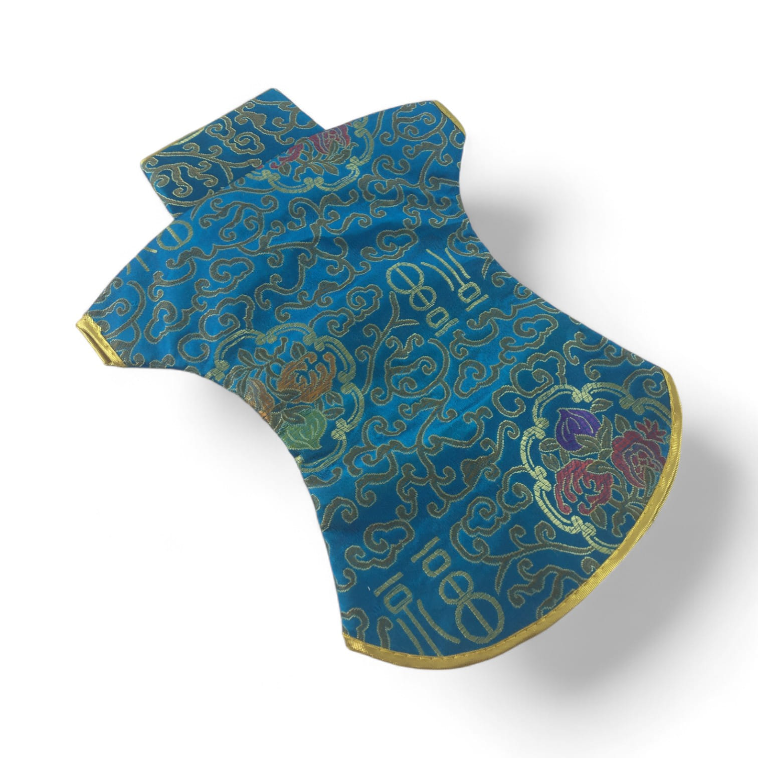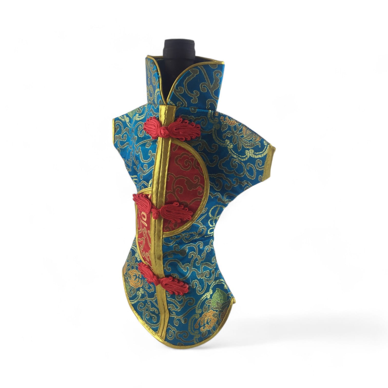 Этот элегантный чехол на бутылку выполнен в традиционном восточном стиле и напоминает миниатюрное кимоно. Он изготовлен из прочной ткани с ярким орнаментом, включающим символы и изображения, типичные для восточной культуры.