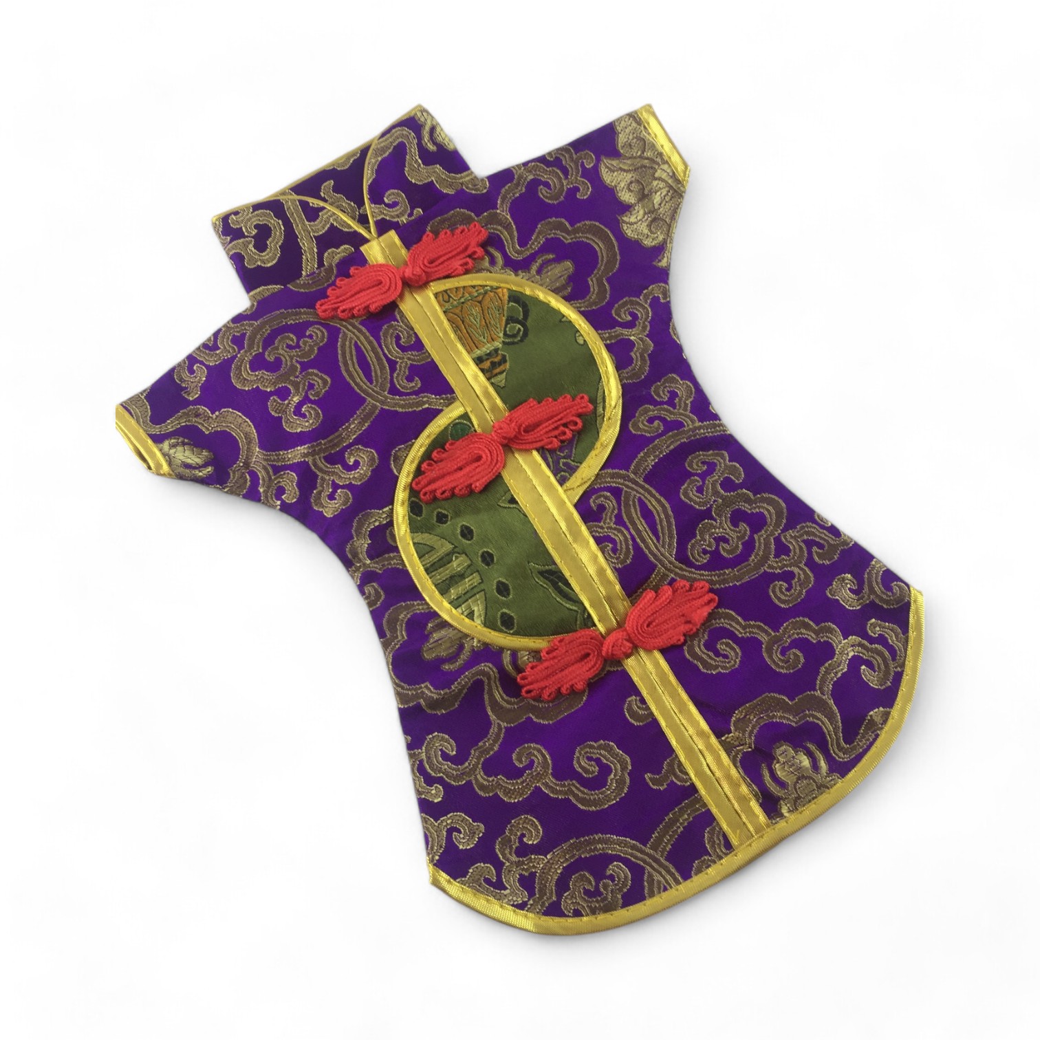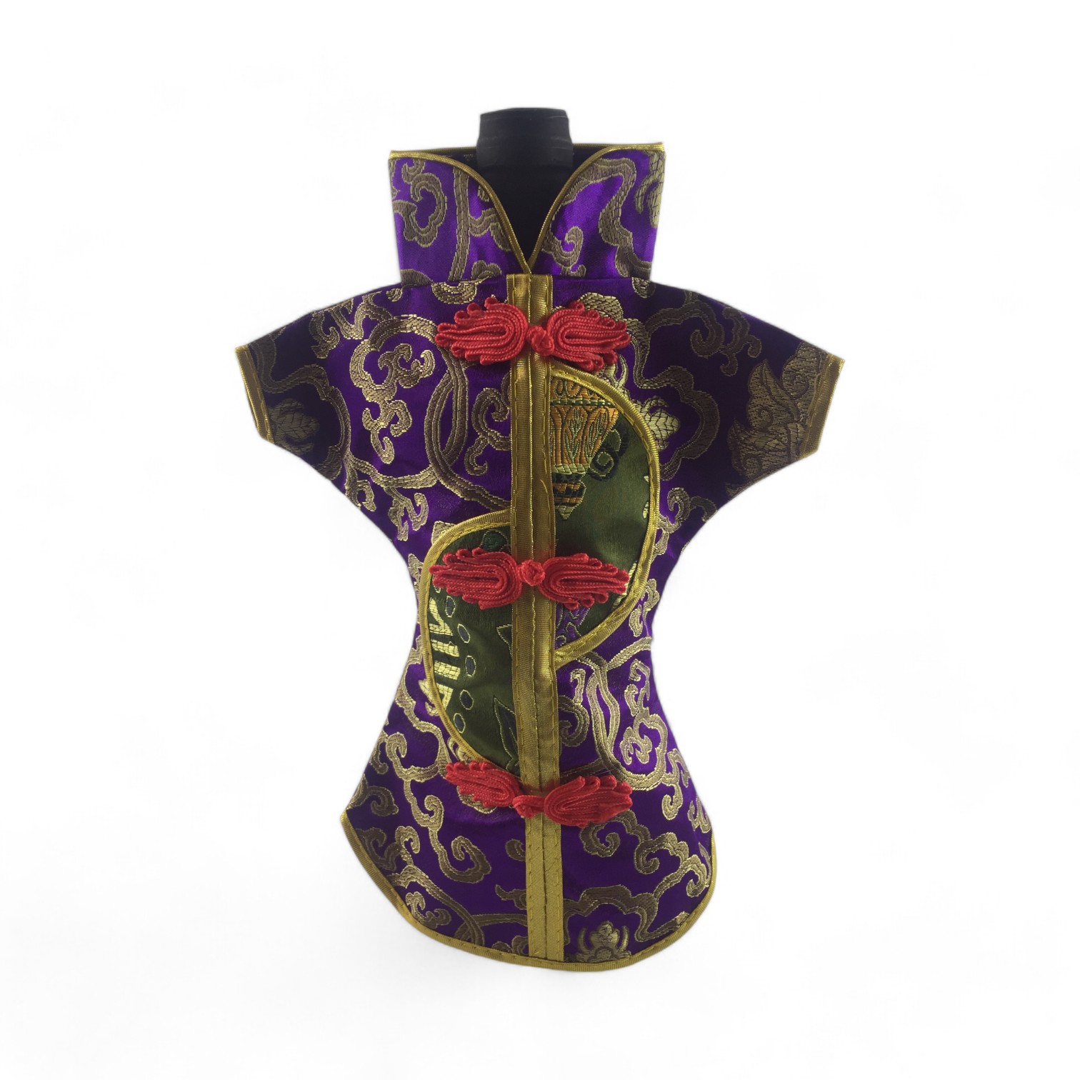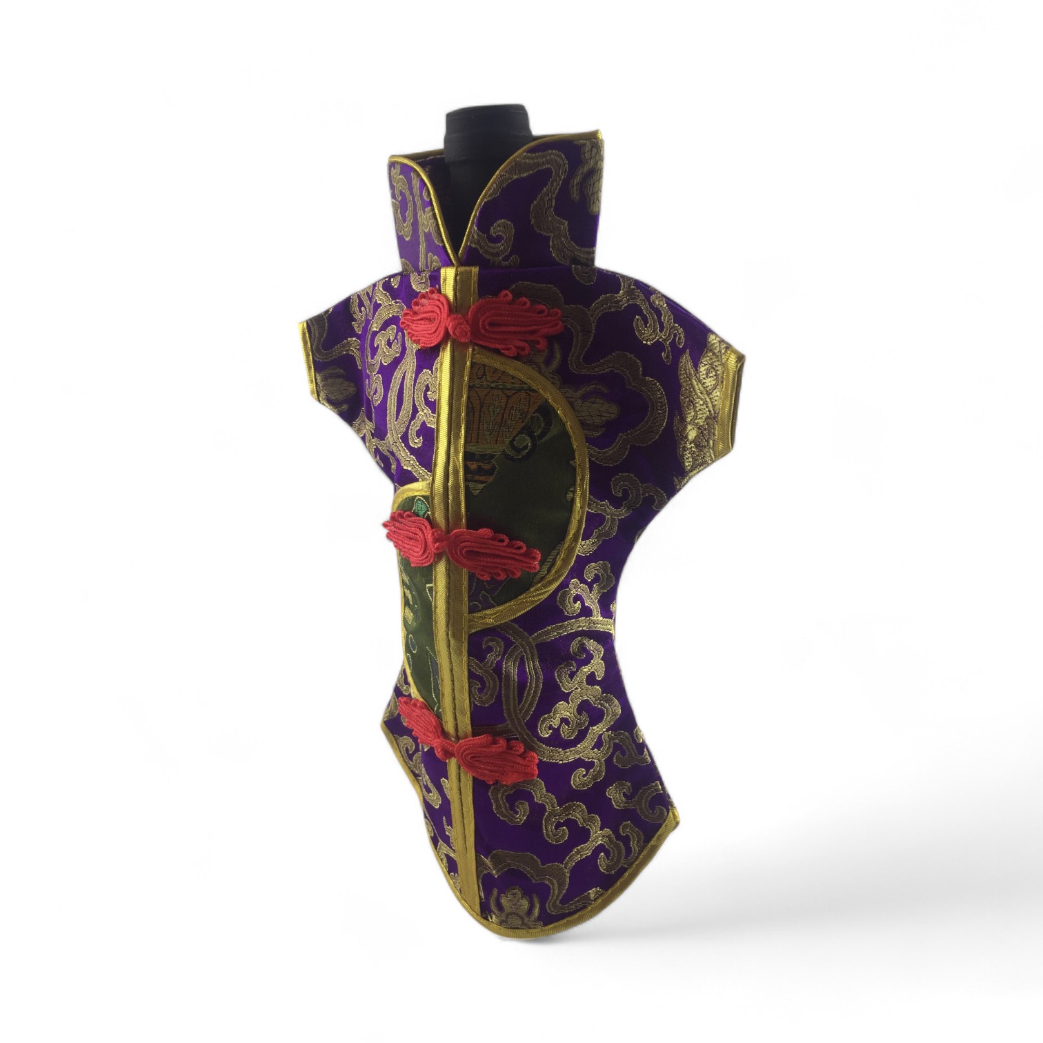Этот элегантный чехол на бутылку выполнен в традиционном восточном стиле и напоминает миниатюрное кимоно. Он изготовлен из прочной ткани с ярким орнаментом, включающим символы и изображения, типичные для восточной культуры.