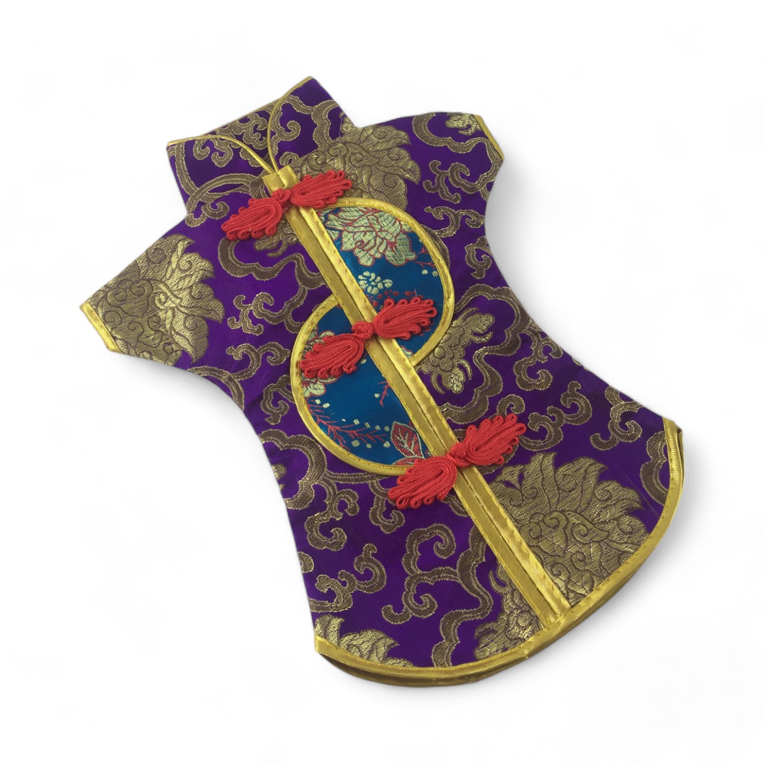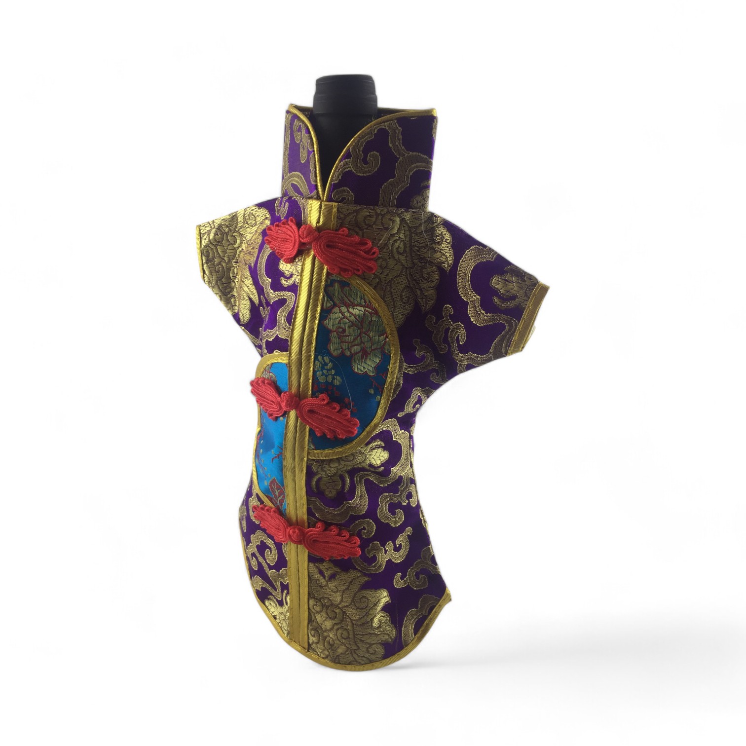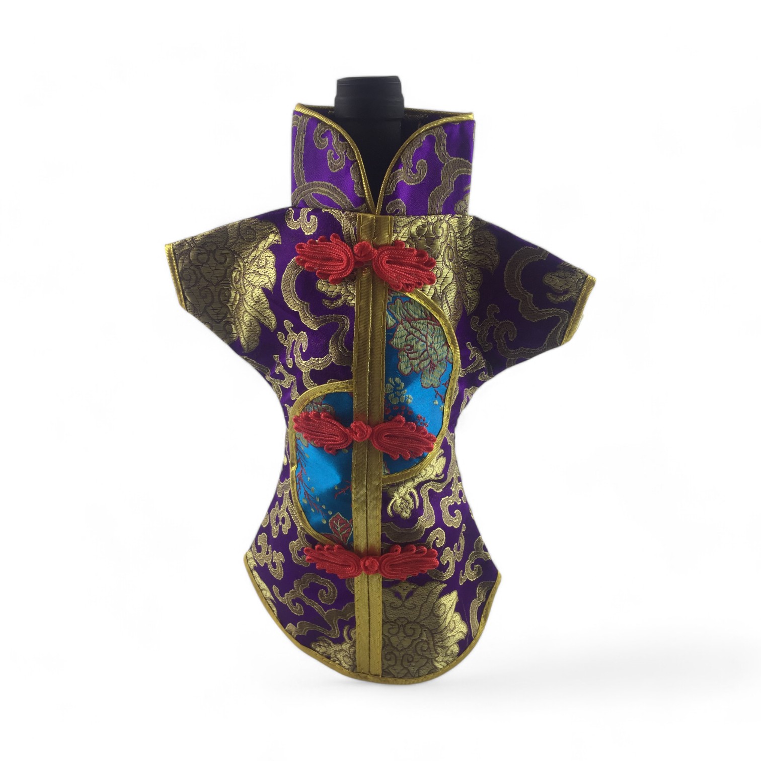 Этот элегантный чехол на бутылку выполнен в традиционном восточном стиле и напоминает миниатюрное кимоно. Он изготовлен из прочной ткани с ярким орнаментом, включающим символы и изображения, типичные для восточной культуры.