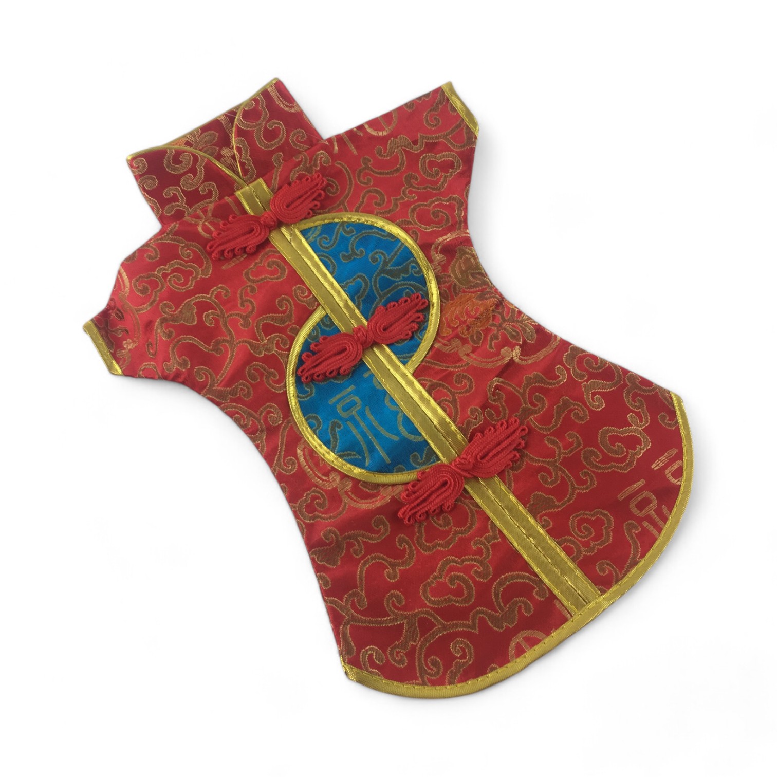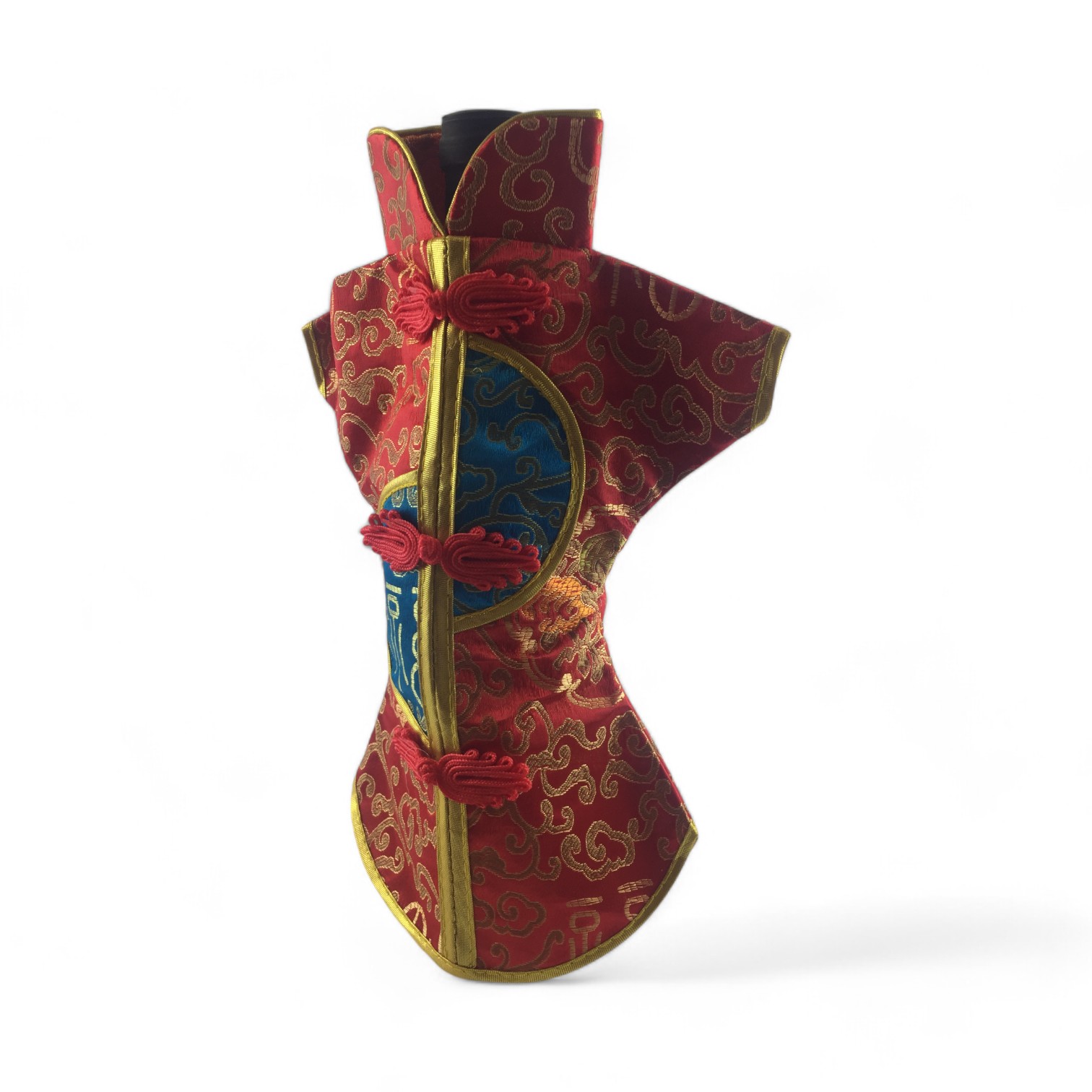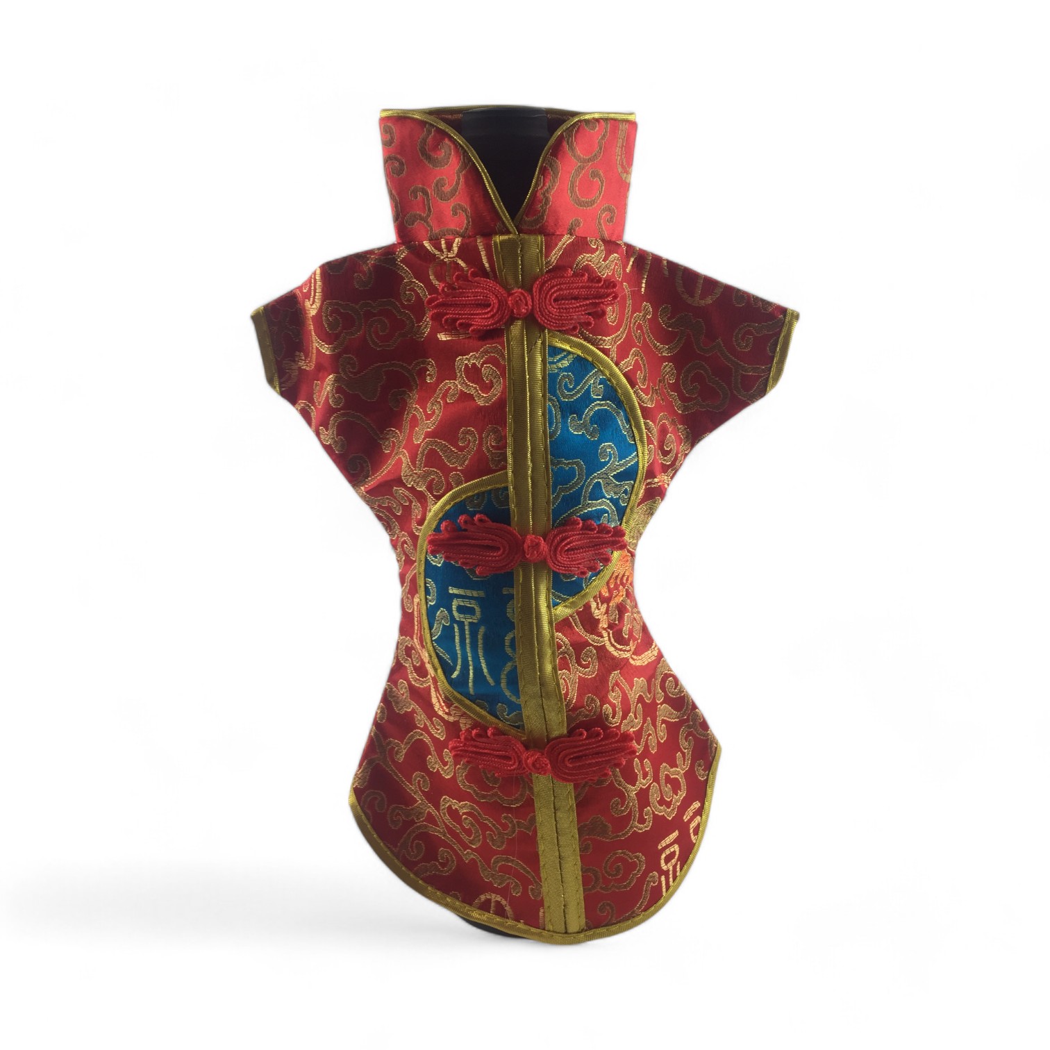 Этот элегантный чехол на бутылку выполнен в традиционном восточном стиле и напоминает миниатюрное кимоно. Он изготовлен из прочной ткани с ярким орнаментом, включающим символы и изображения, типичные для восточной культуры.