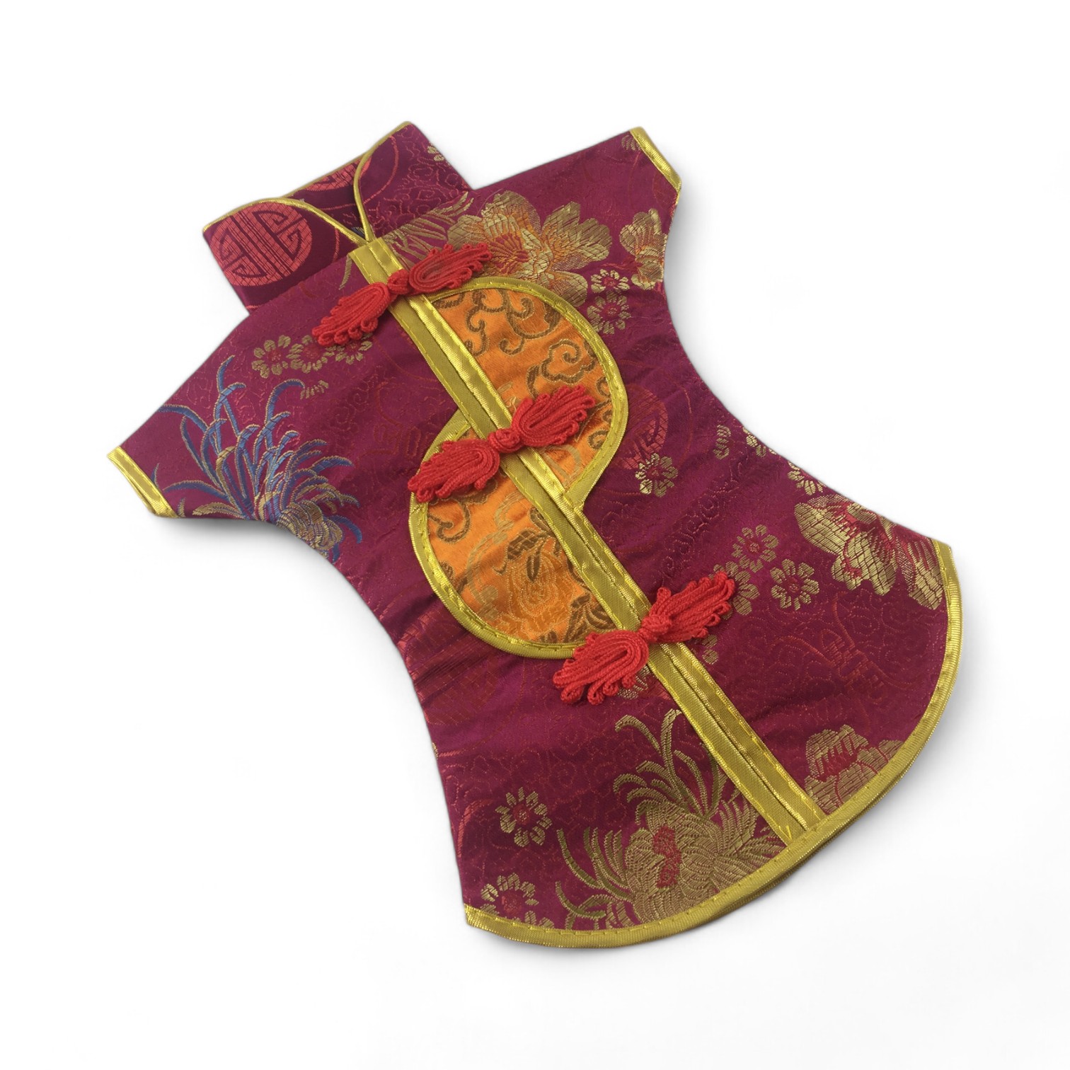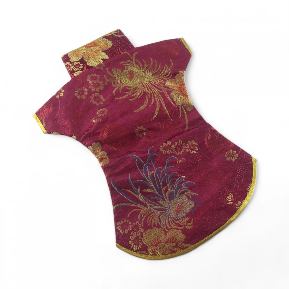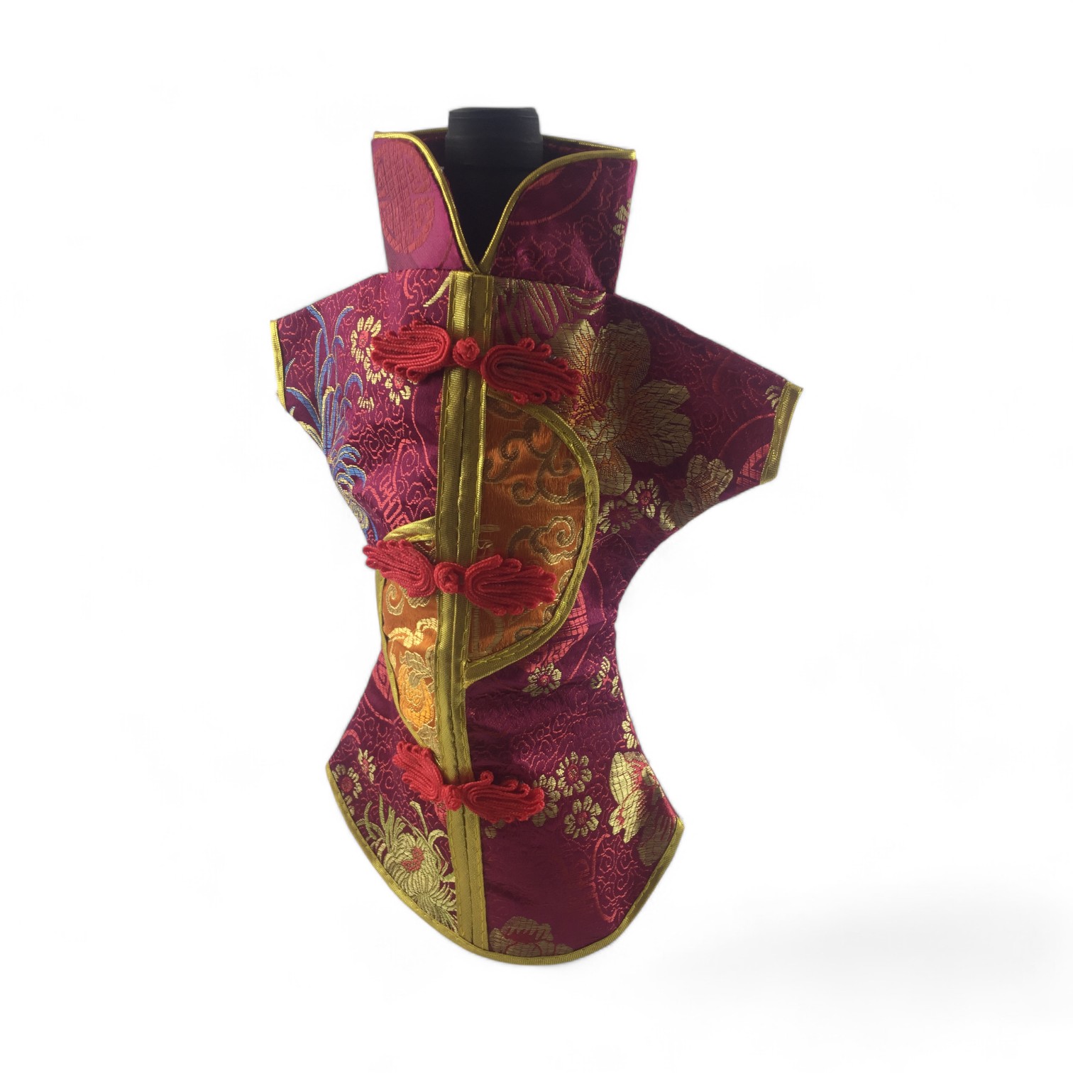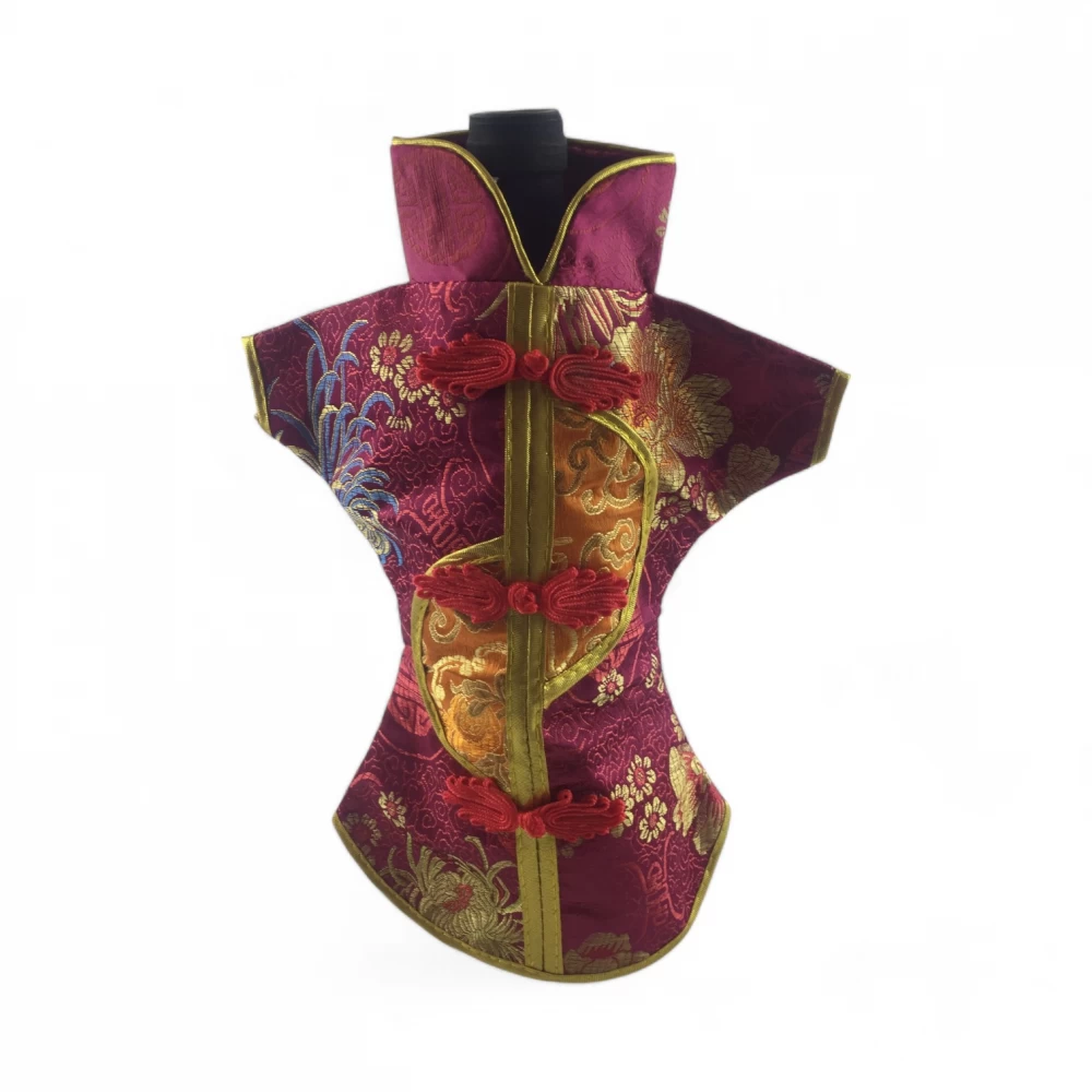 Этот элегантный чехол на бутылку выполнен в традиционном восточном стиле и напоминает миниатюрное кимоно. Он изготовлен из прочной ткани с ярким орнаментом, включающим символы и изображения, типичные для восточной культуры.