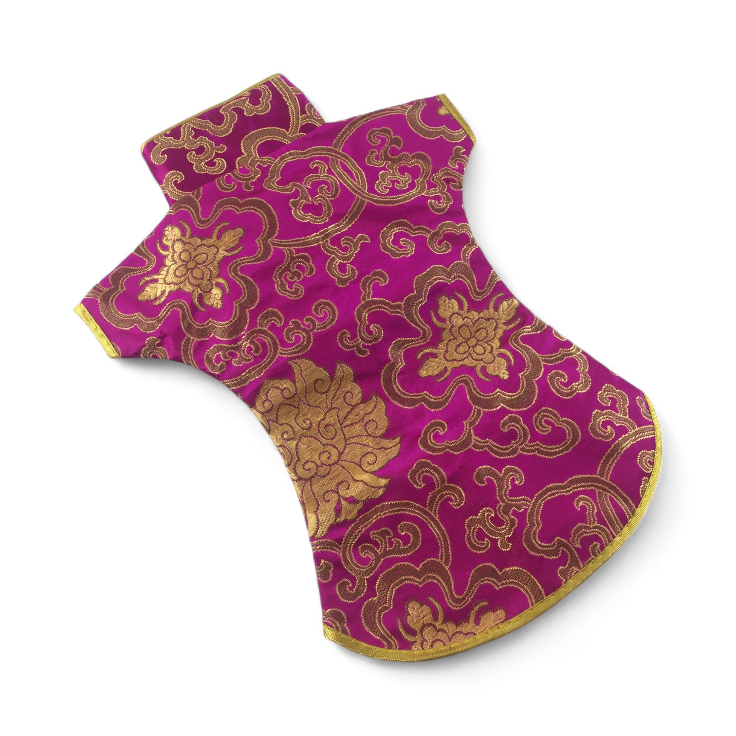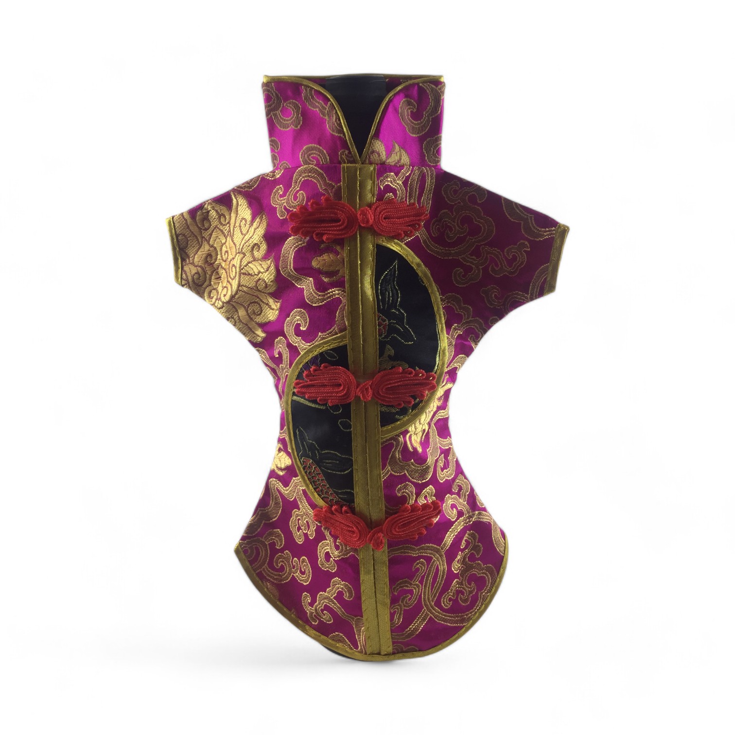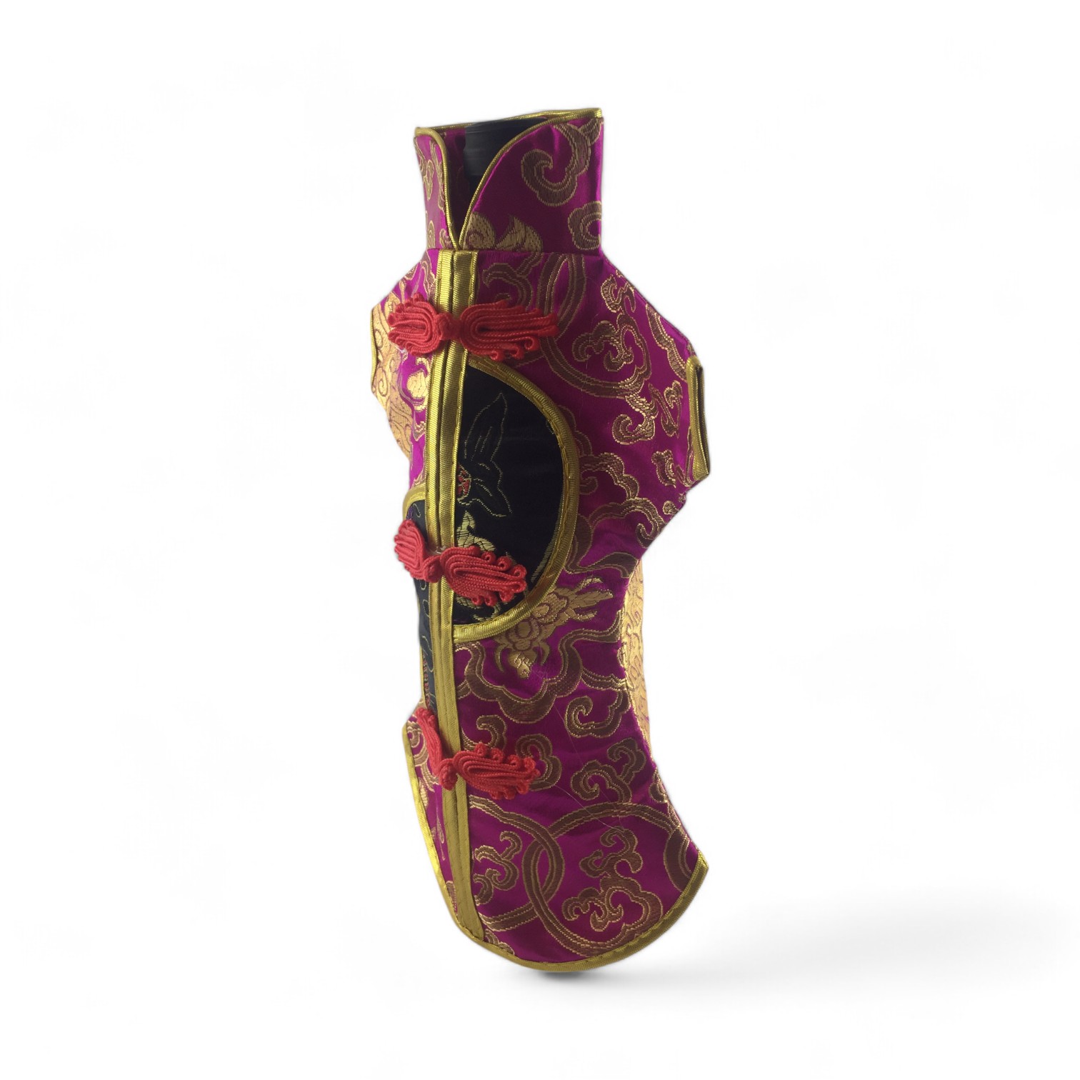 Этот элегантный чехол на бутылку выполнен в традиционном восточном стиле и напоминает миниатюрное кимоно. Он изготовлен из прочной ткани с ярким орнаментом, включающим символы и изображения, типичные для восточной культуры.