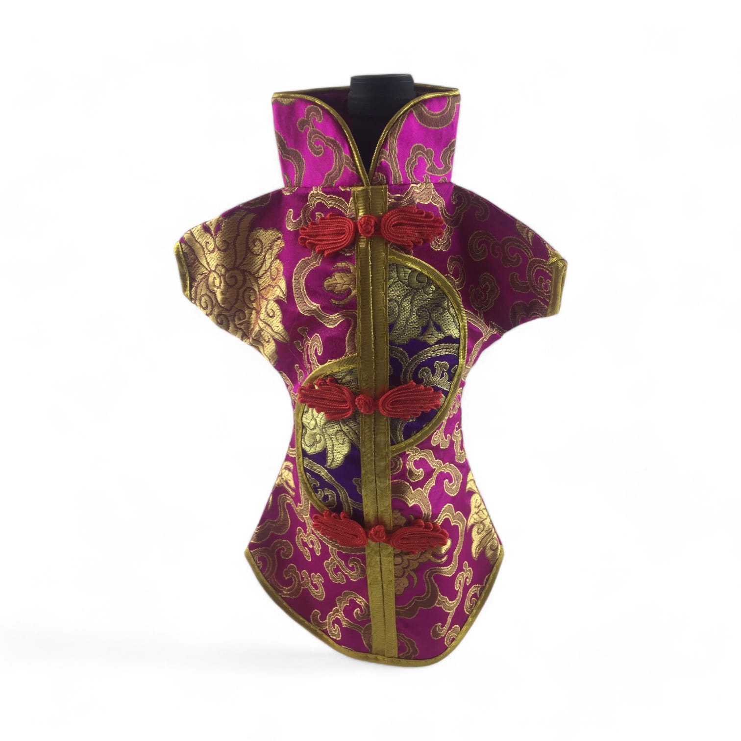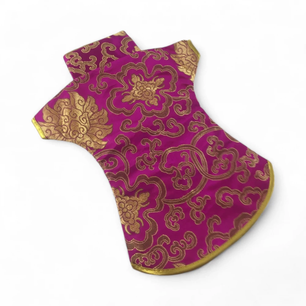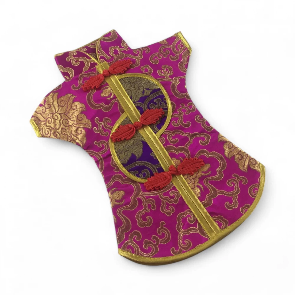 Этот элегантный чехол на бутылку выполнен в традиционном восточном стиле и напоминает миниатюрное кимоно. Он изготовлен из прочной ткани с ярким орнаментом, включающим символы и изображения, типичные для восточной культуры.