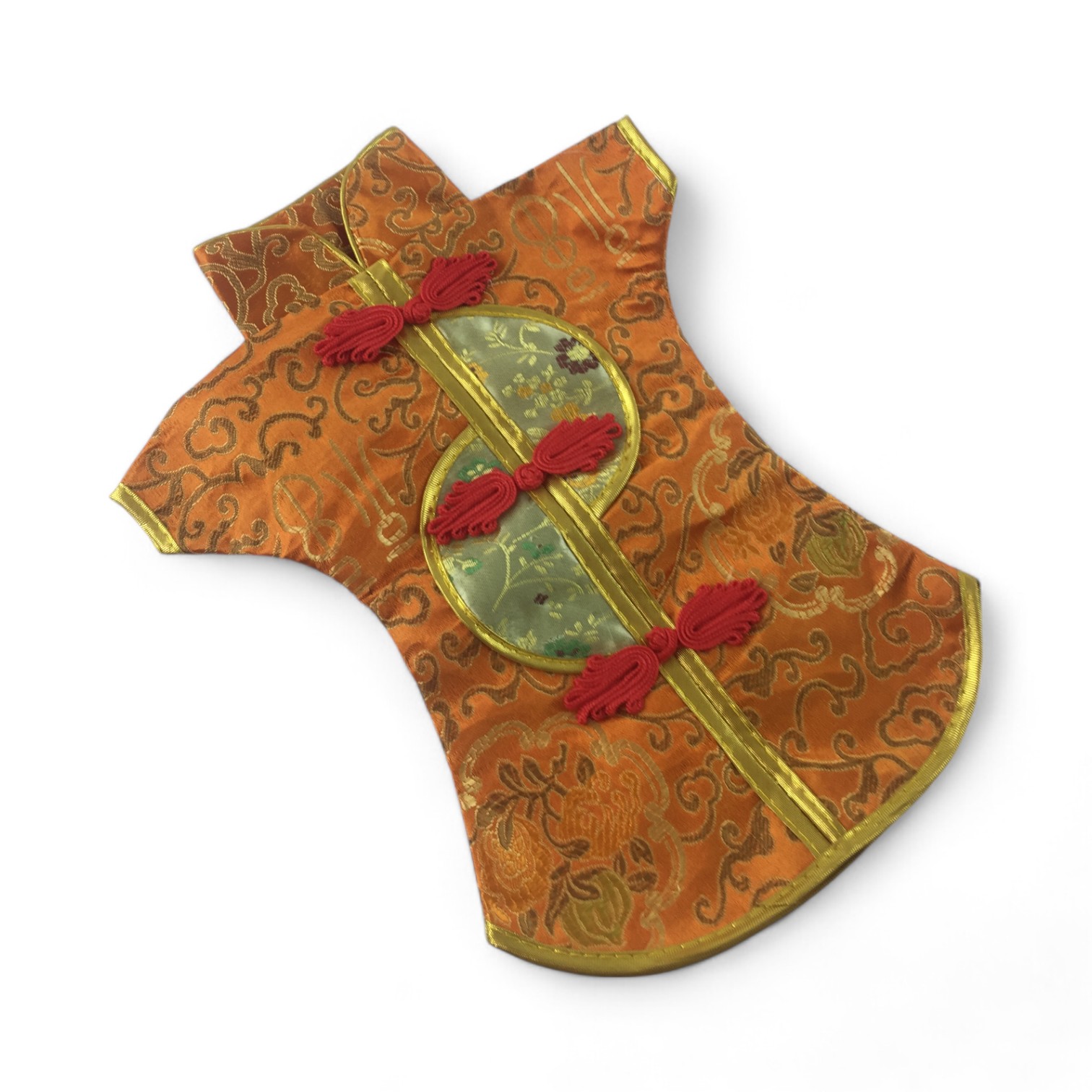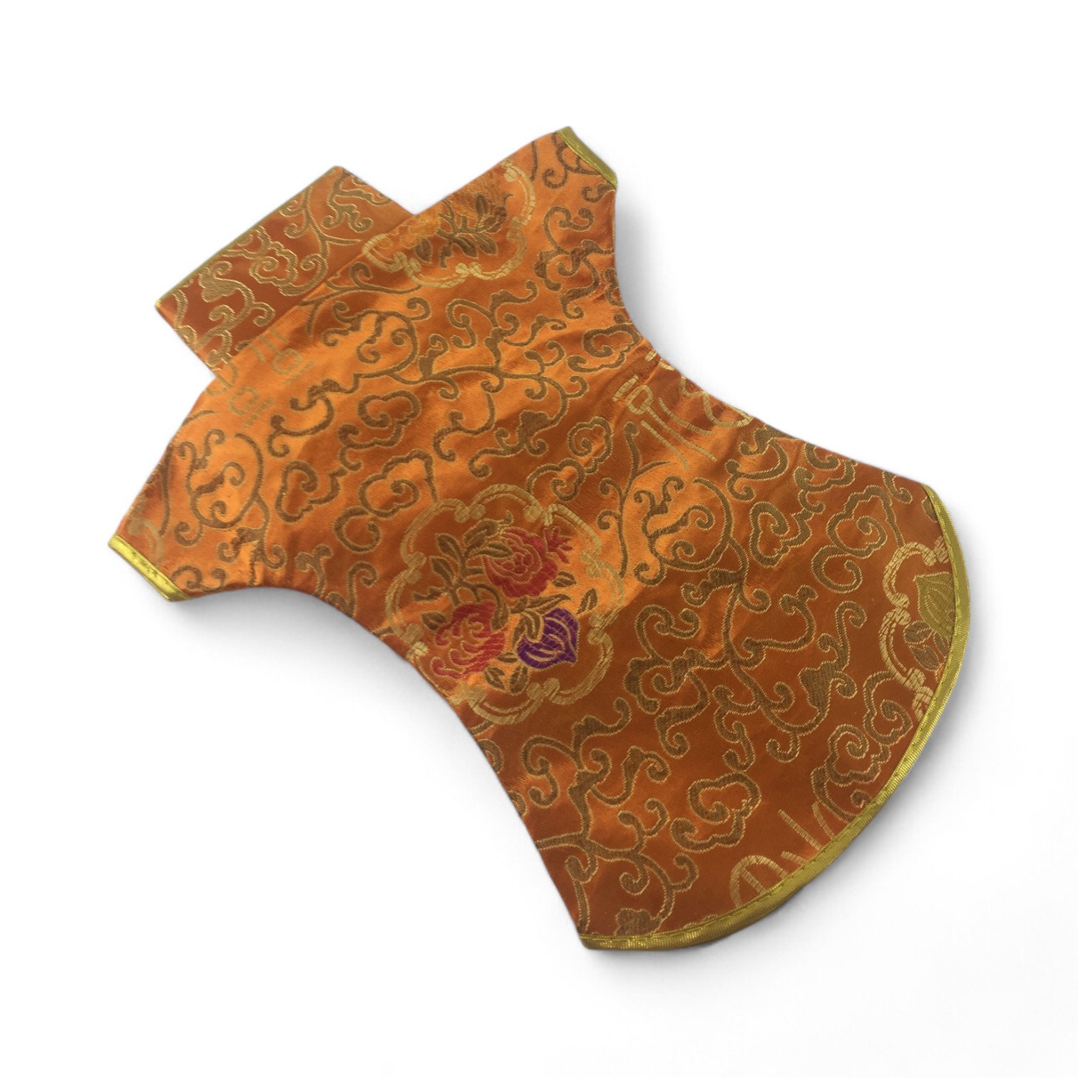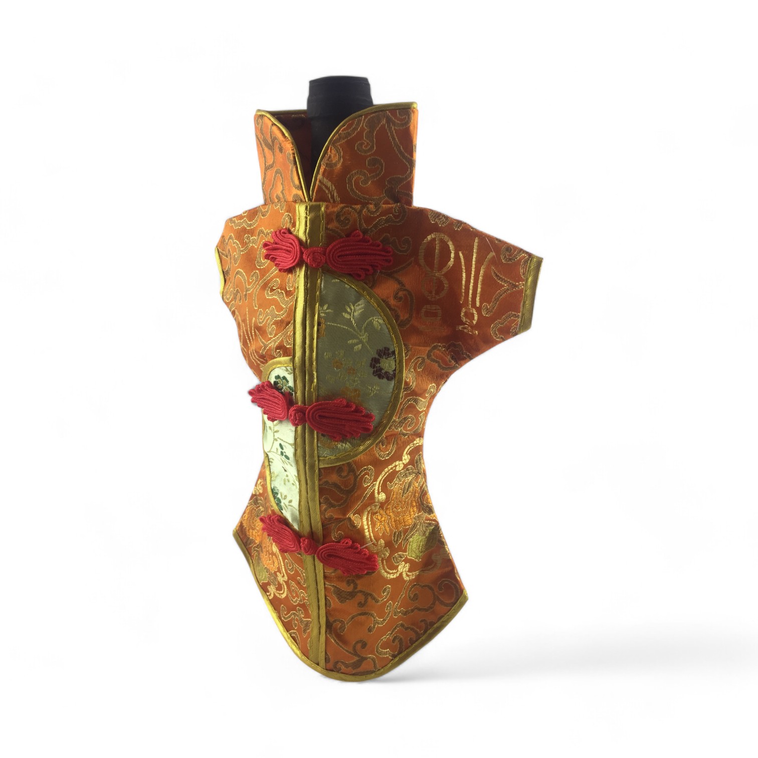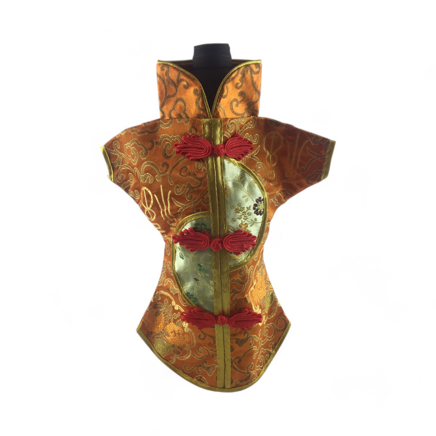 Этот элегантный чехол на бутылку выполнен в традиционном восточном стиле и напоминает миниатюрное кимоно. Он изготовлен из прочной ткани с ярким орнаментом, включающим символы и изображения, типичные для восточной культуры.