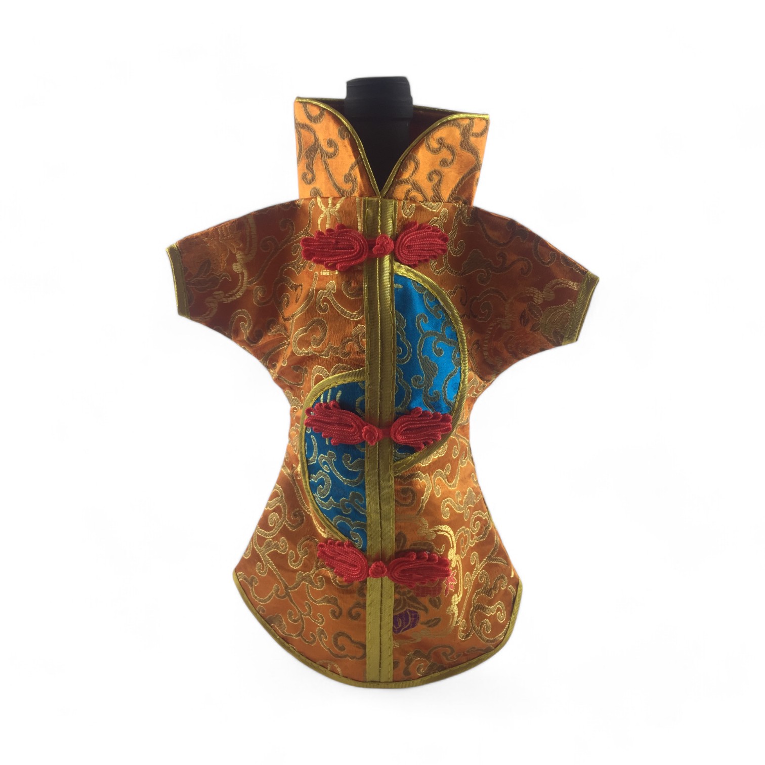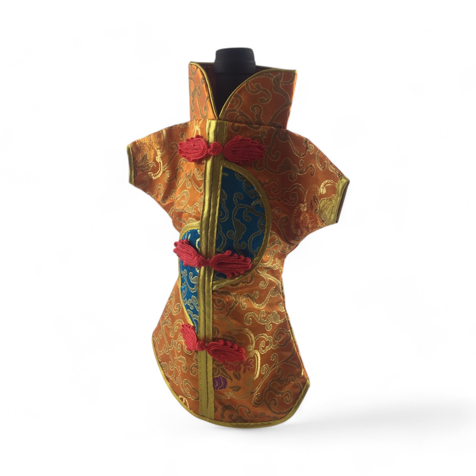 Этот элегантный чехол на бутылку выполнен в традиционном восточном стиле и напоминает миниатюрное кимоно. Он изготовлен из прочной ткани с ярким орнаментом, включающим символы и изображения, типичные для восточной культуры.