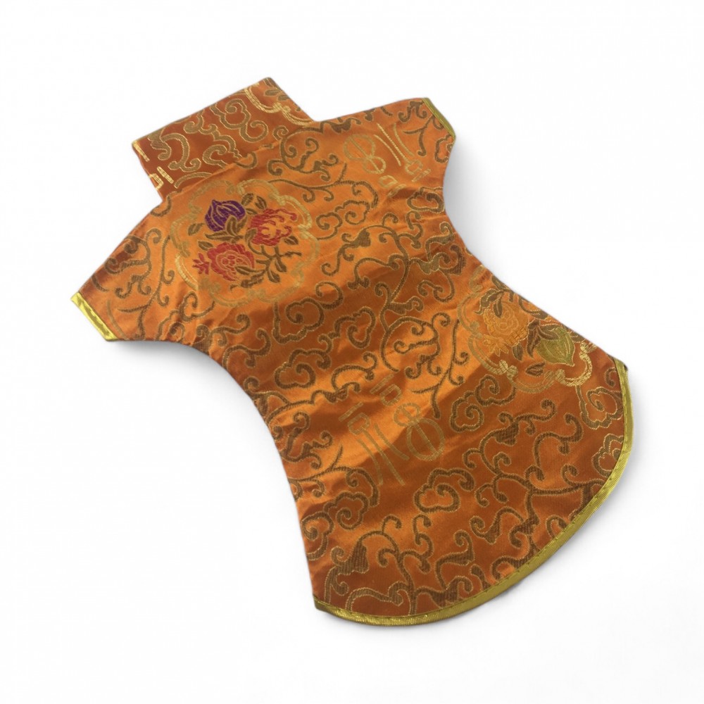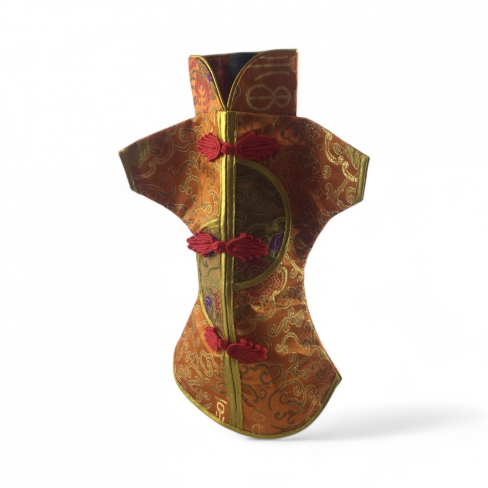 Этот элегантный чехол на бутылку выполнен в традиционном восточном стиле и напоминает миниатюрное кимоно. Он изготовлен из прочной ткани с ярким орнаментом, включающим символы и изображения, типичные для восточной культуры.