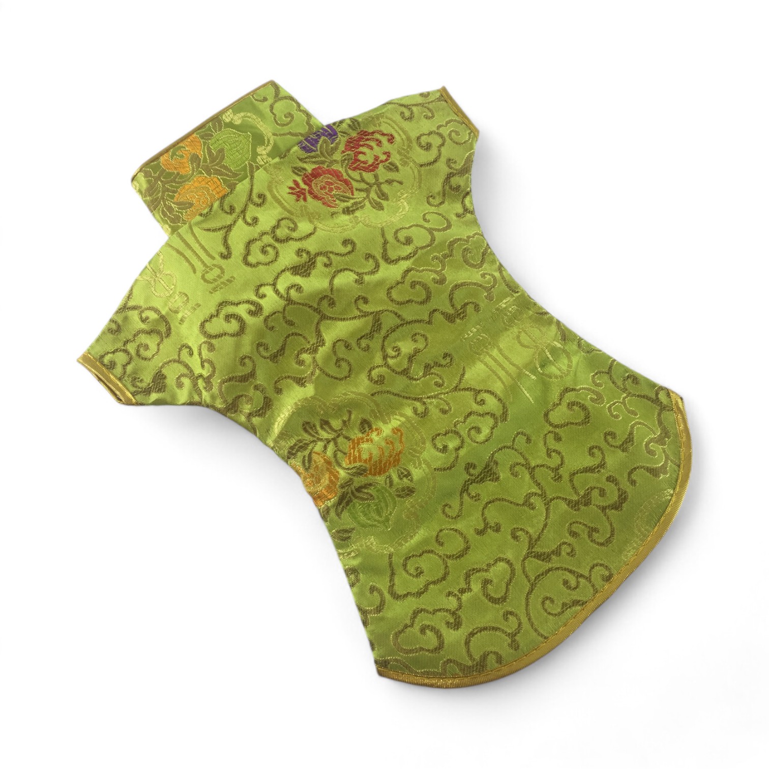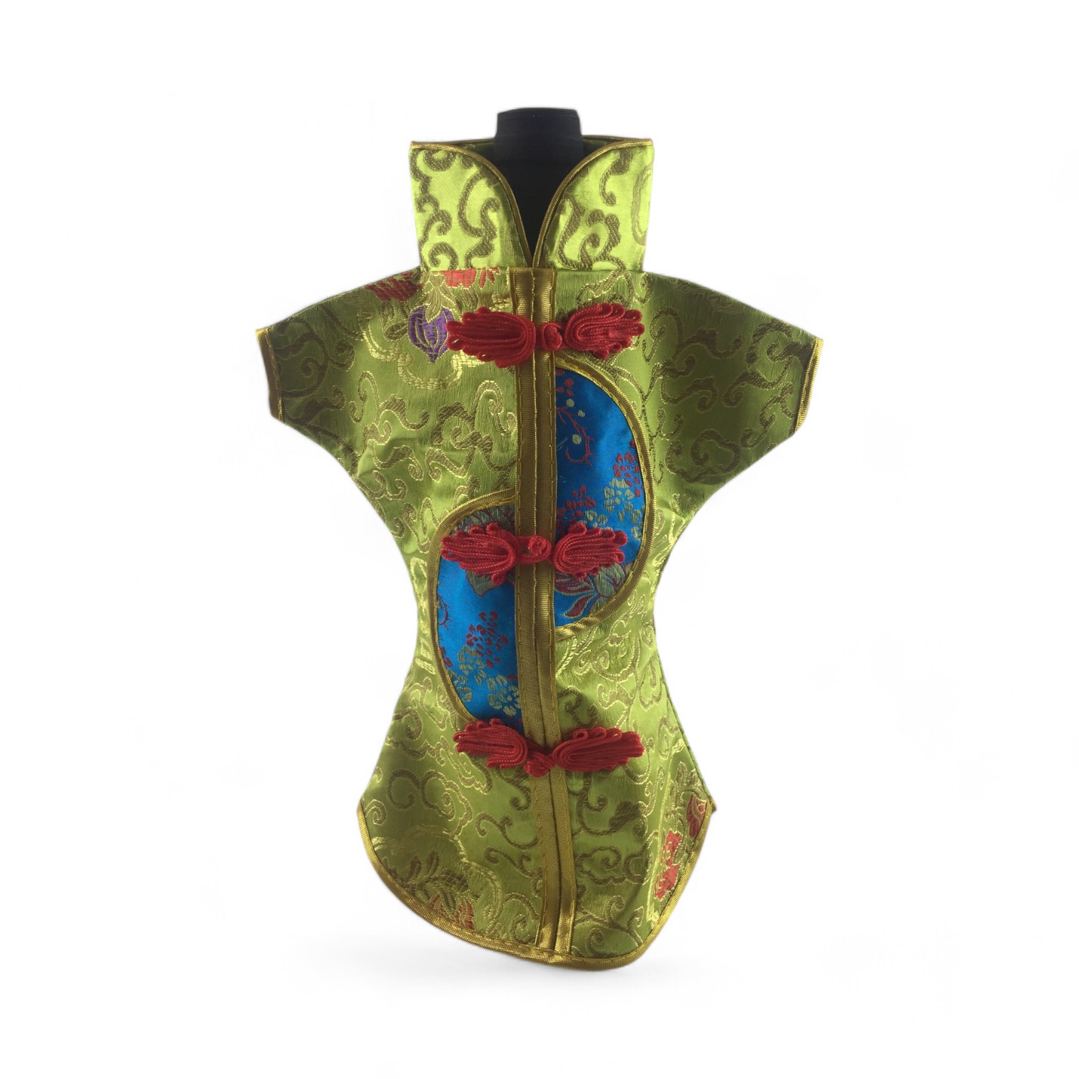 Этот элегантный чехол на бутылку выполнен в традиционном восточном стиле и напоминает миниатюрное кимоно. Он изготовлен из прочной ткани с ярким орнаментом, включающим символы и изображения, типичные для восточной культуры.