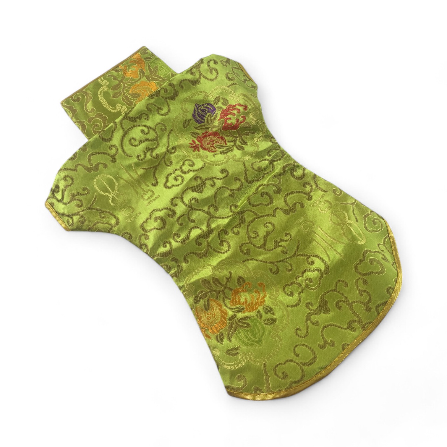 Этот элегантный чехол на бутылку выполнен в традиционном восточном стиле и напоминает миниатюрное кимоно. Он изготовлен из прочной ткани с ярким орнаментом, включающим символы и изображения, типичные для восточной культуры.