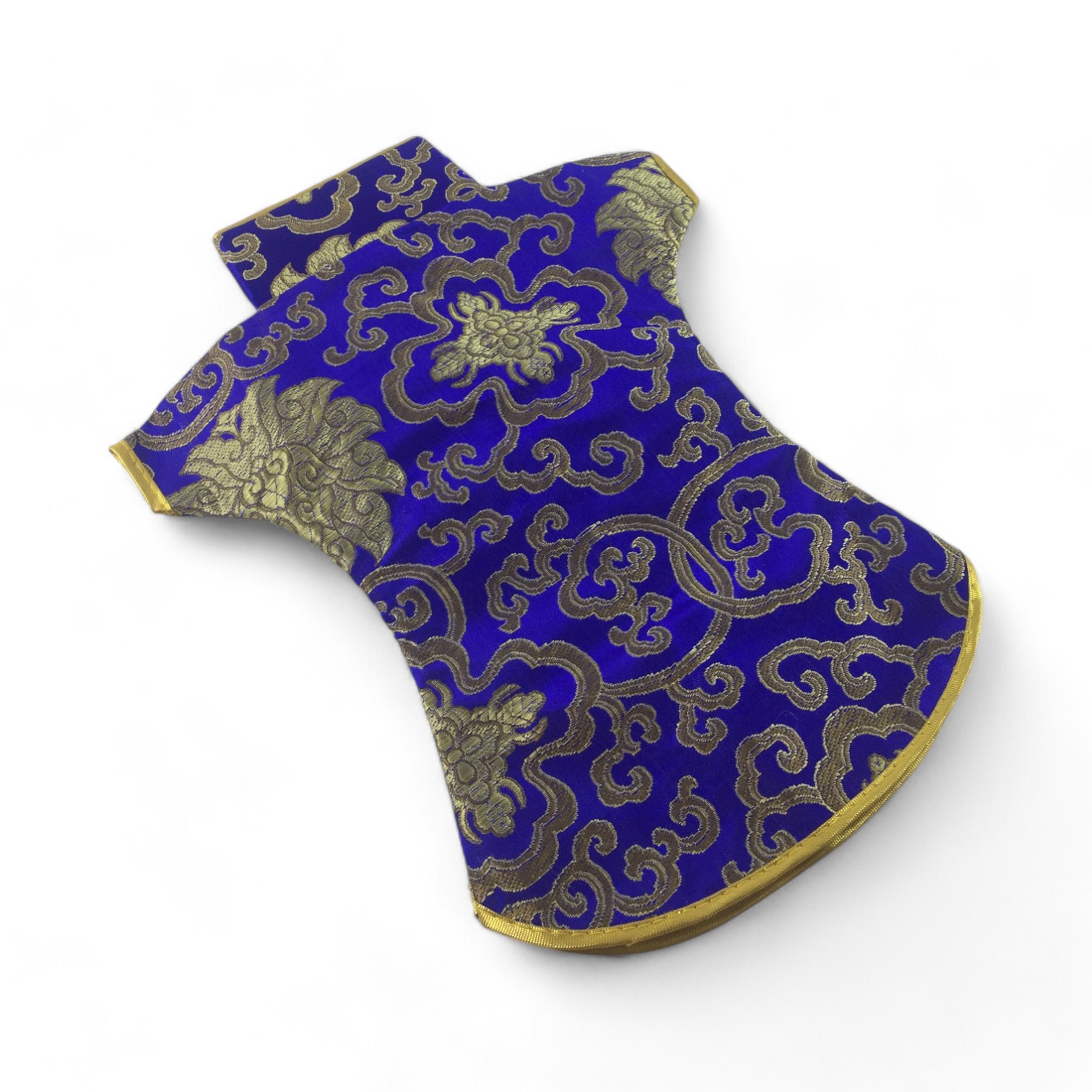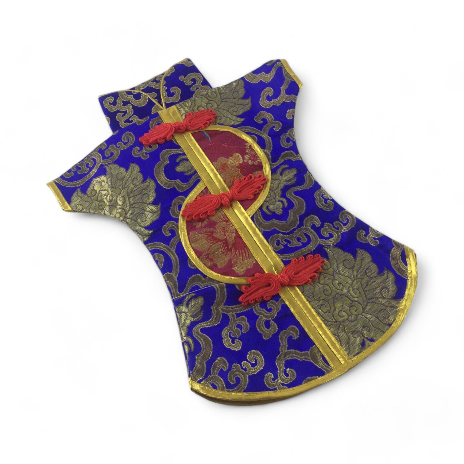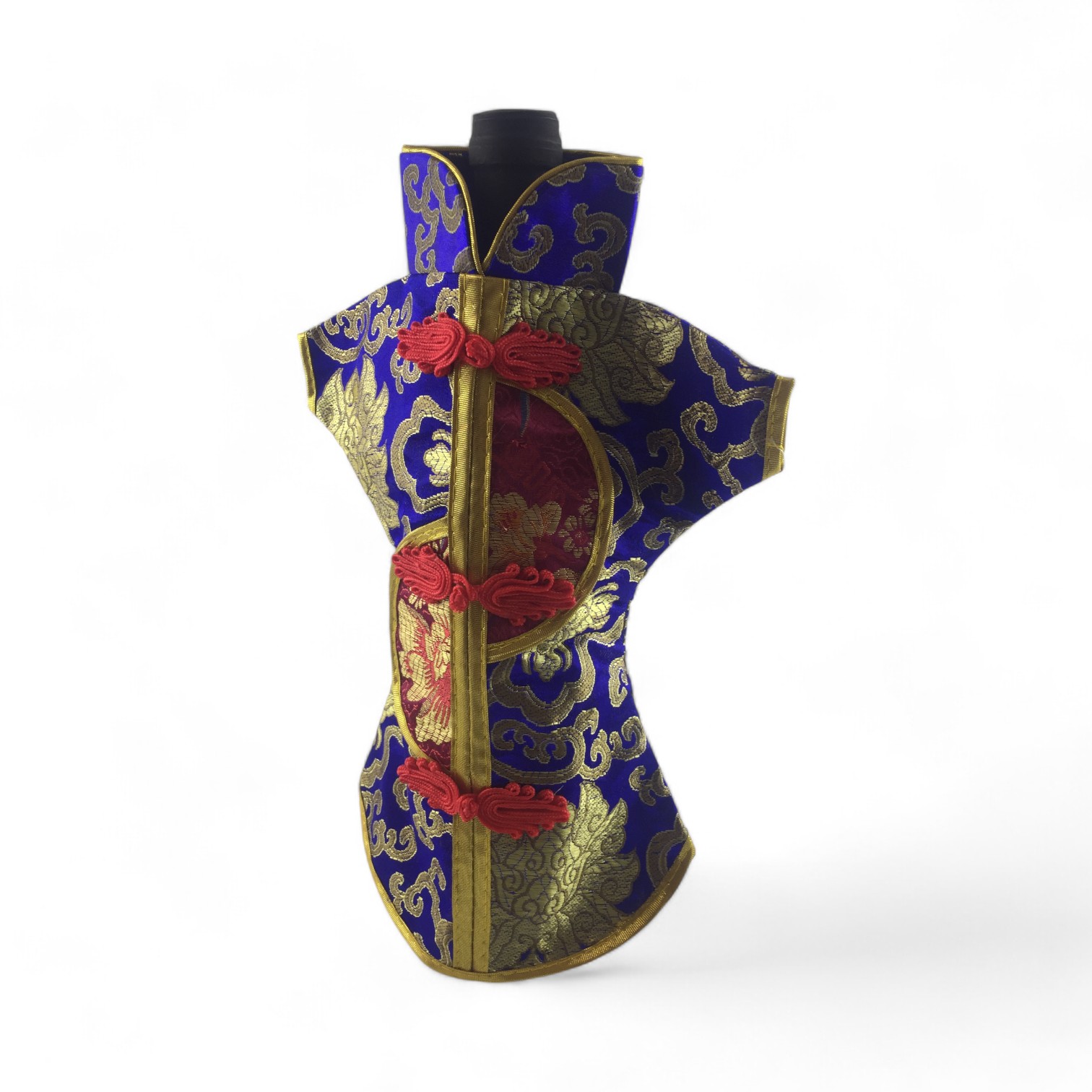 Этот элегантный чехол на бутылку выполнен в традиционном восточном стиле и напоминает миниатюрное кимоно. Он изготовлен из прочной ткани с ярким орнаментом, включающим символы и изображения, типичные для восточной культуры.