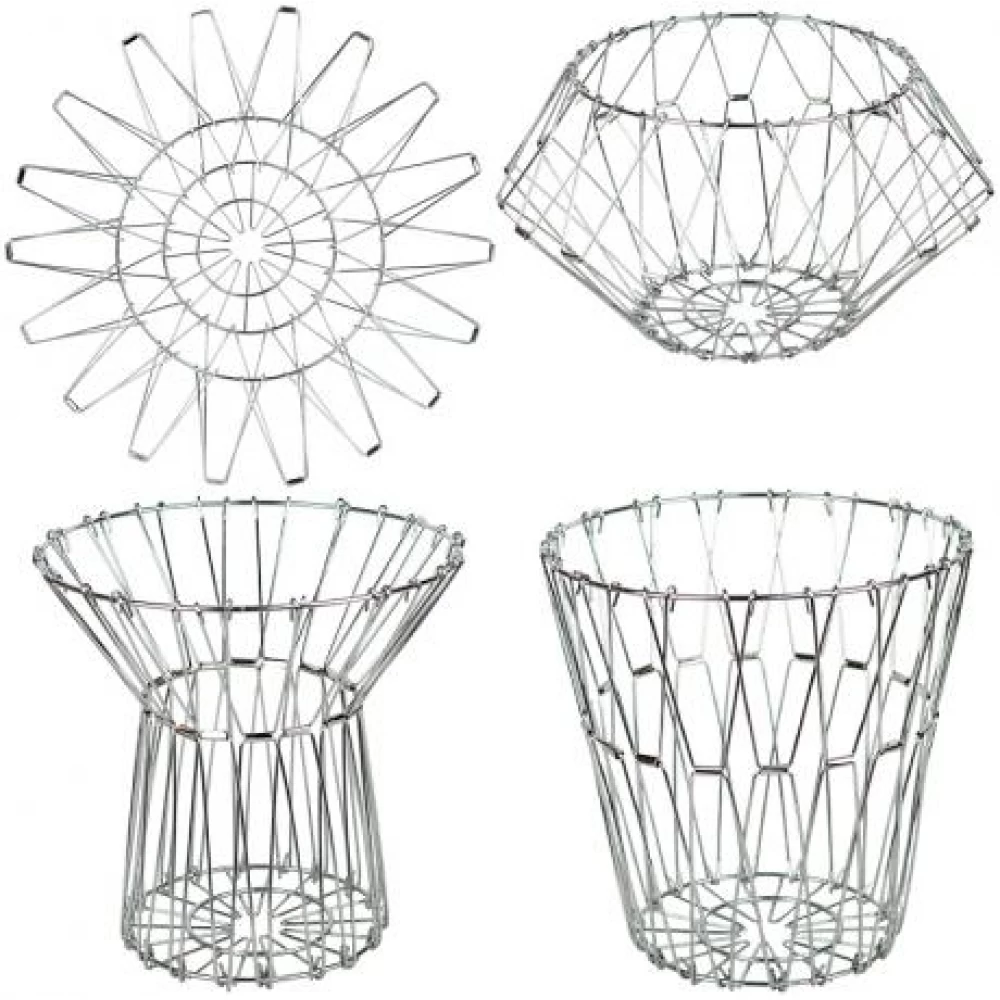 Металева фруктовниця-кошик трансформер — оригінальне та практичне рішення для сервірування та зберігання фруктів. Конструкція дозволяє змінювати форму виробу: кошик можна скласти приблизно у 5 різних видів, підлаштовуючи під інтер’єр або кількість продуктів. Міцний металевий каркас забезпечує стійкість і довговічність, а відкрита форма сприяє хорошій вентиляції фруктів.