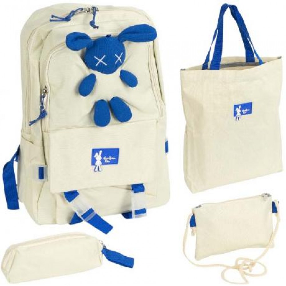 Стильний і зручний набір 4 в 1 для школи, прогулянок та повсякденного використання. У комплект входять: рюкзак з об’ємним декором у вигляді вухастого зайчика, сумка через плече, косметичка та пенал. Матеріал — щільний водовідштовхувальний поліестер.