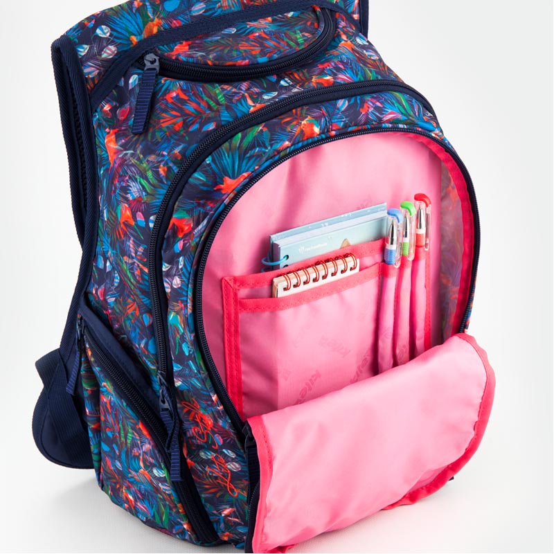 - Рюкзак Kite K18-857L-3 из полиэстера с цветочным принтом, имеет яркую подкладку. Рюкзак создан для девочек, которые любят носить рюкзак из-за его функционала и следят за тенденциями моды. Анатомическая спинка с "дышащими" подушечками и анатомические лямки правильной S-образной формы способствуют плотному прилеганию рюкзака к спине, минимизируют давление на плечи и позвоночник, дарят ощущение комфорта и легкости. Рюкзак состоит из 2 отделений, 2 передних, внутреннего, 2 боковых карманов на молнии и 2 открытых боковых карманов, для бутылки с водой. Переднее отделение оснащено органайзером, что позволяет систематизировать и находить мелкие вещи в рюкзаке. Регулируемые лямки и небольшой вес, всего 700 г, делают изделие необременительным для пользователя. Имеет прорезиненную ручку. Светоотражающие элементы обеспечивают безопасность человека в темное время суток. Ткань прошла сложные тесты на износостойкость и разрывы, устойчивая к воздействию внешних факторов. Фурнитура качественная, замки легко и плавно открываются