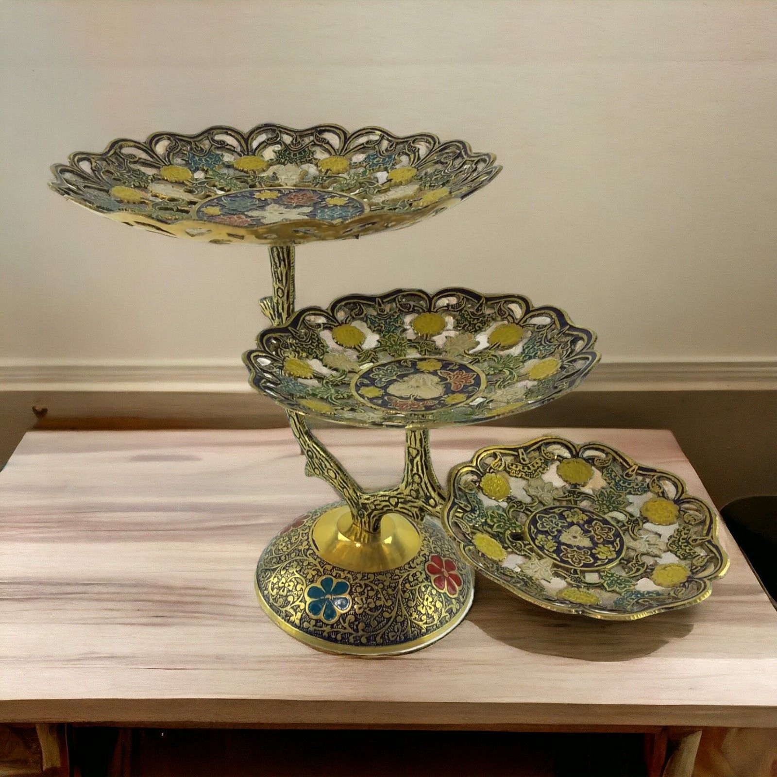 Эта бронзовая фруктовница - не просто функциональный предмет, но и произведение искусства. Изысканный рисунок цветов, на каждом уровне, создает впечатление настоящего произведения ремесла. Благородный материал и элегантный дизайн делают эту фруктовницу уникальным акцентом в вашем доме.