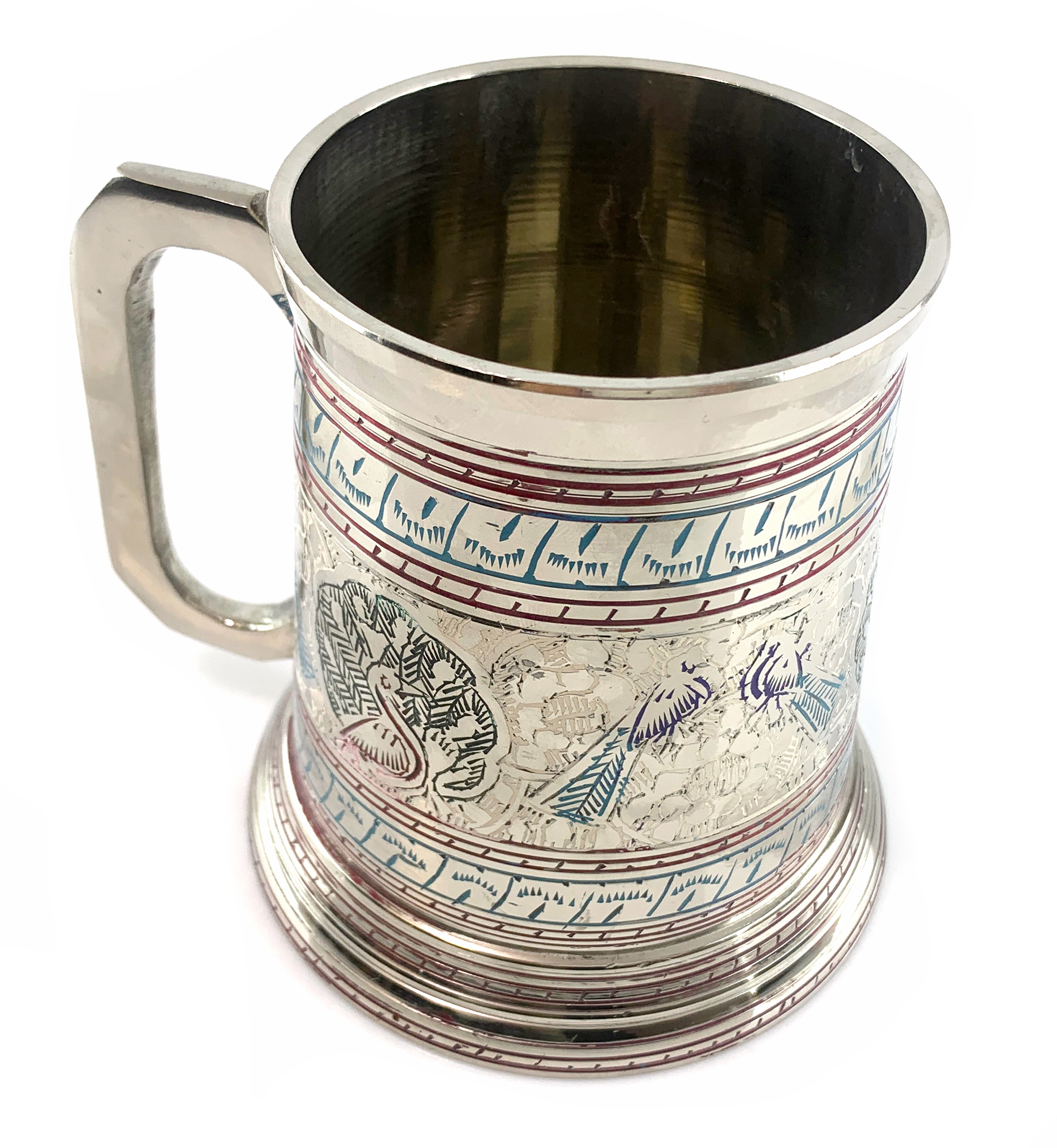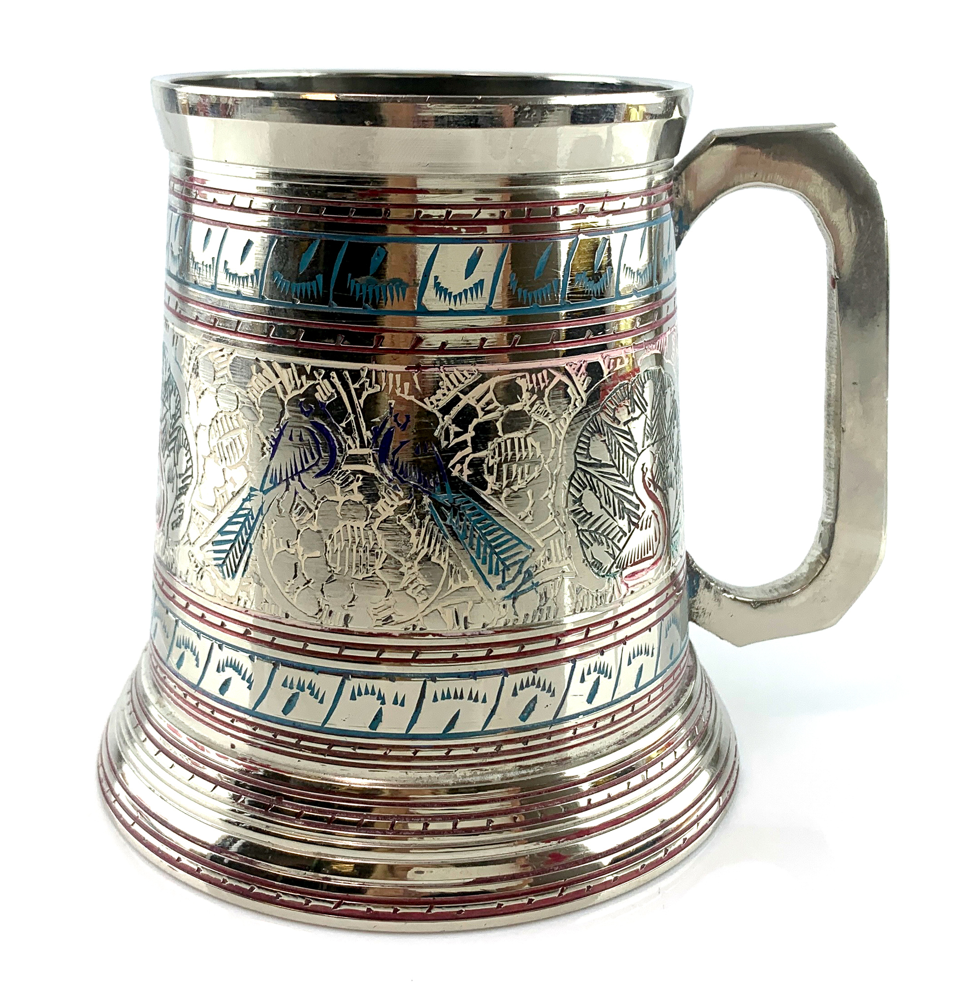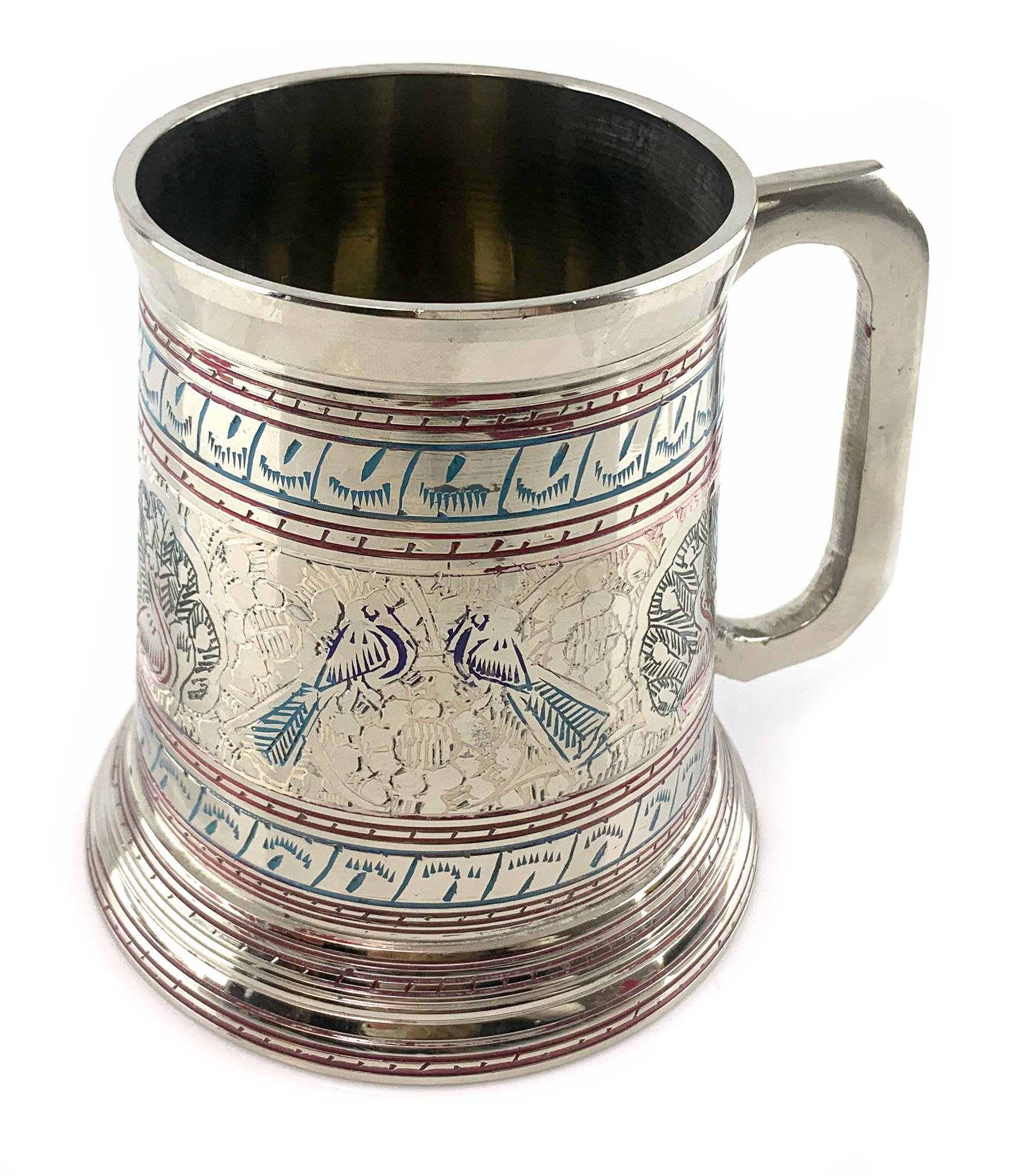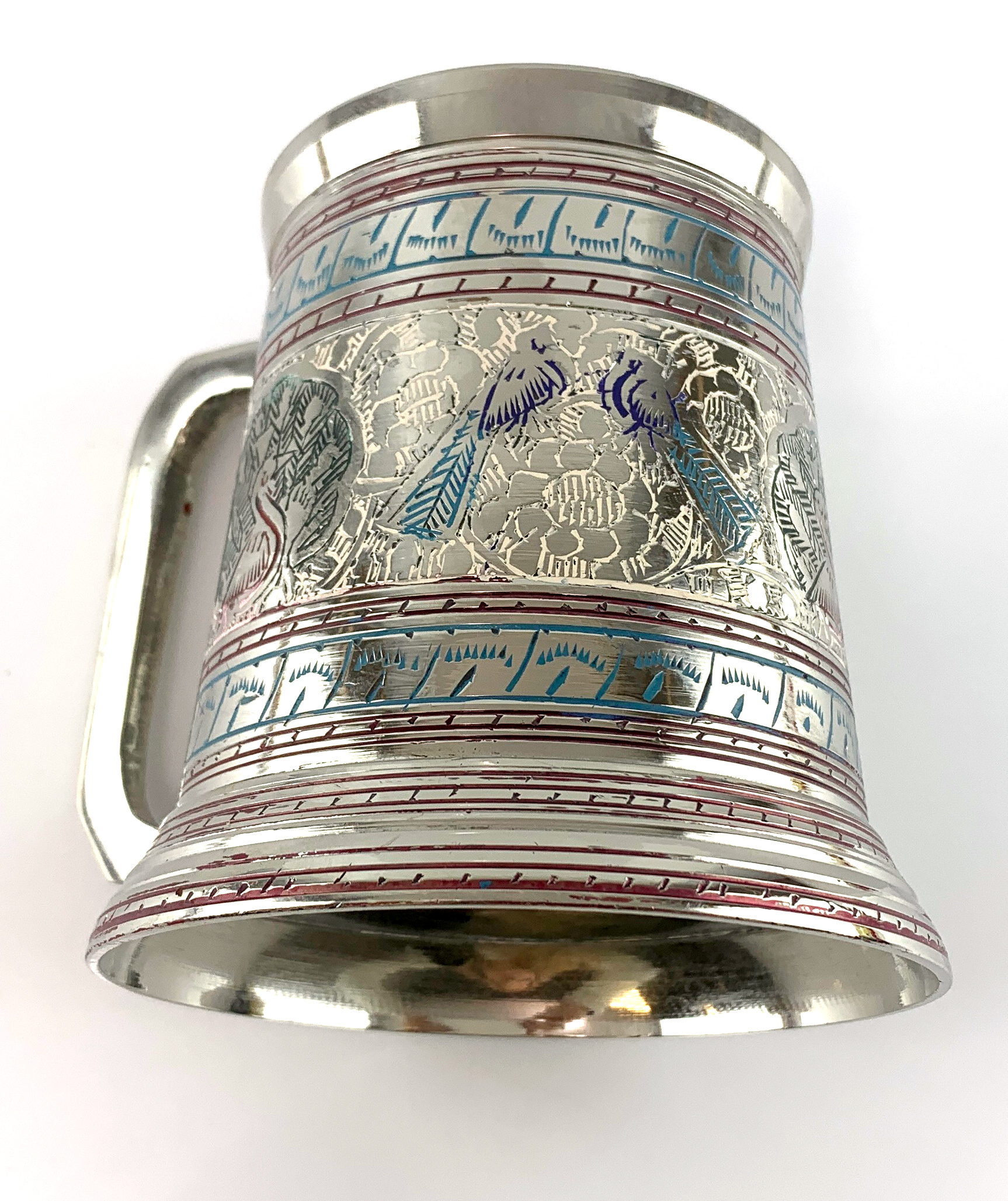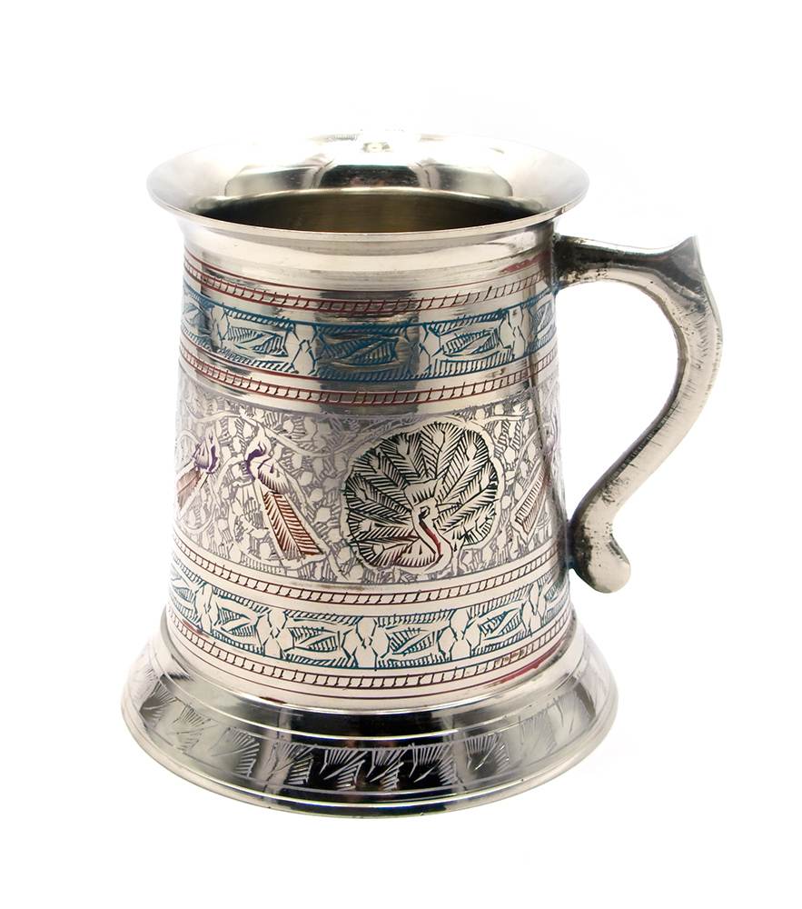 Бронзовая кружка в серебристом цвете украшена удивительными изображениями павлинов, напоминающими нам о свободе, легкости и красоте природы.