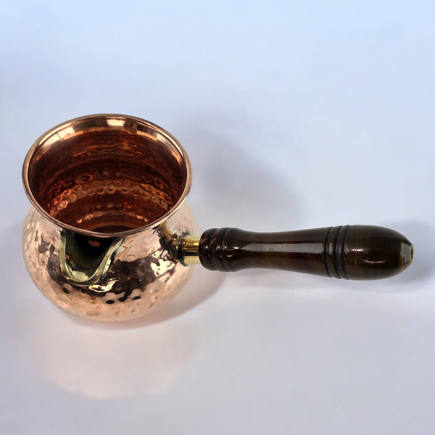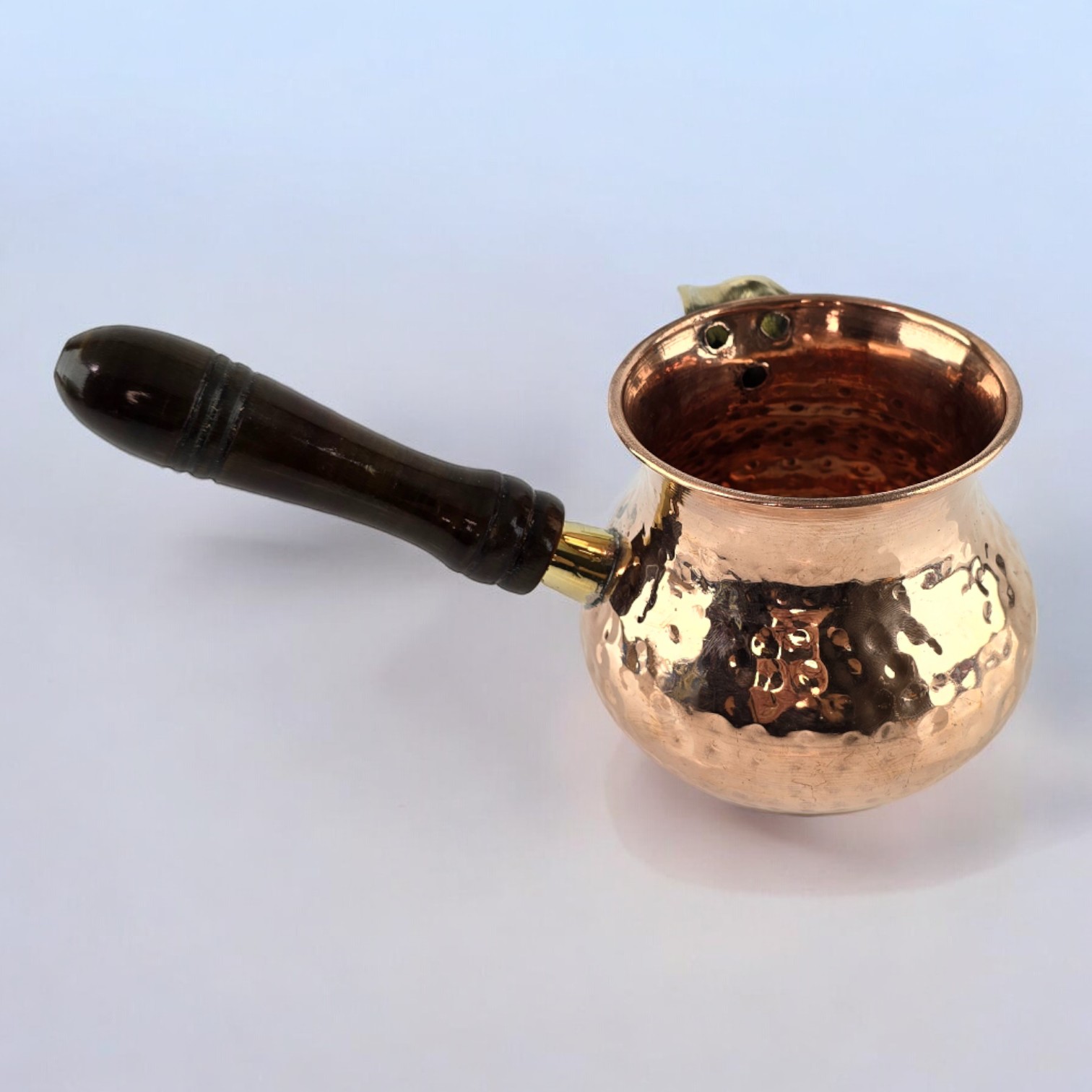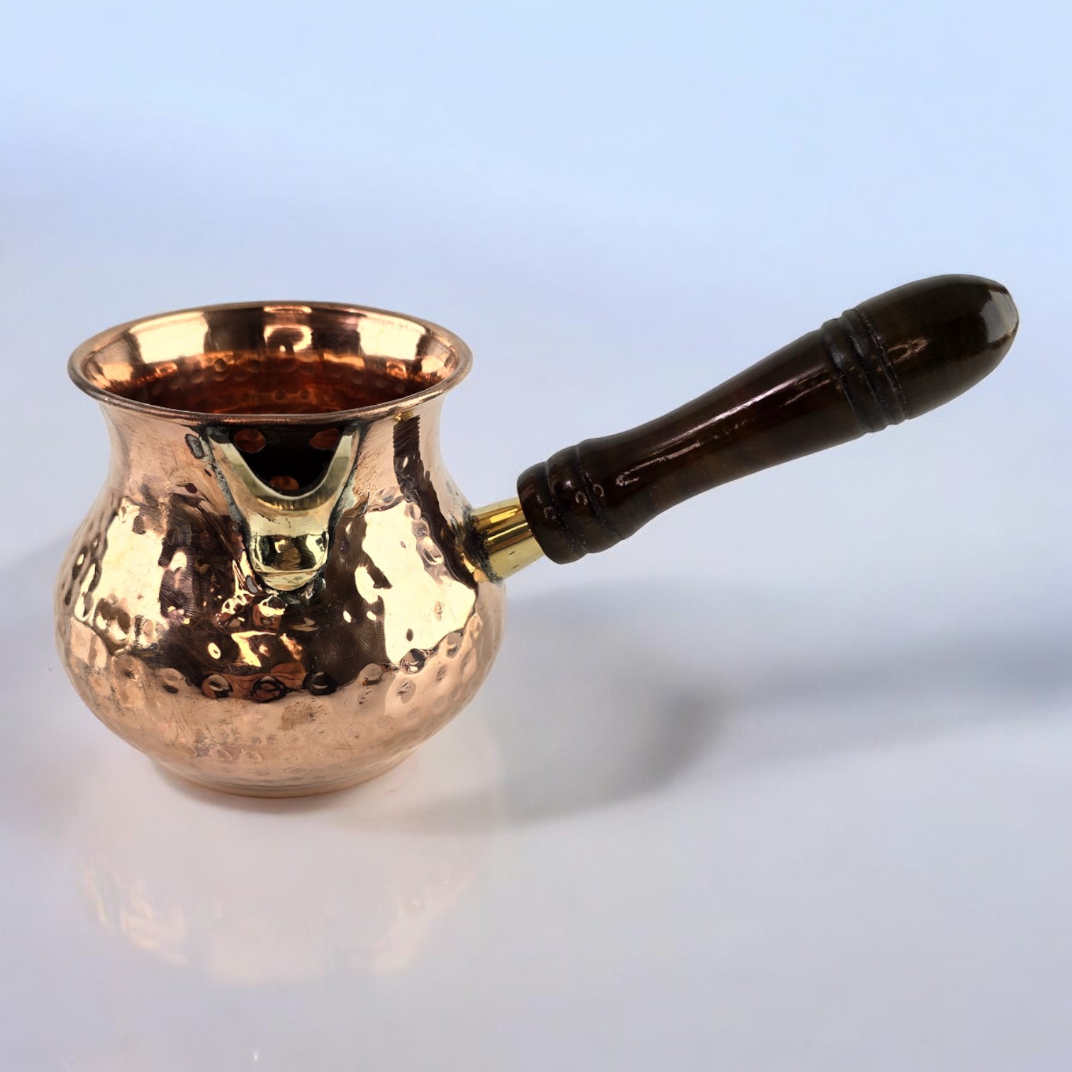 Эта турка изготовлена с использованием традиционных индийских ремесленных техник. Основная часть турки выполнена из меди, что обеспечивает равномерное распределение тепла при приготовлении кофе. Носик и крепление для ручки сделаны из латуни, что добавляет дополнительной прочности и изящности изделию. Деревянная ручка не только обеспечивает комфортный хват, но и придает турке природное очарование.