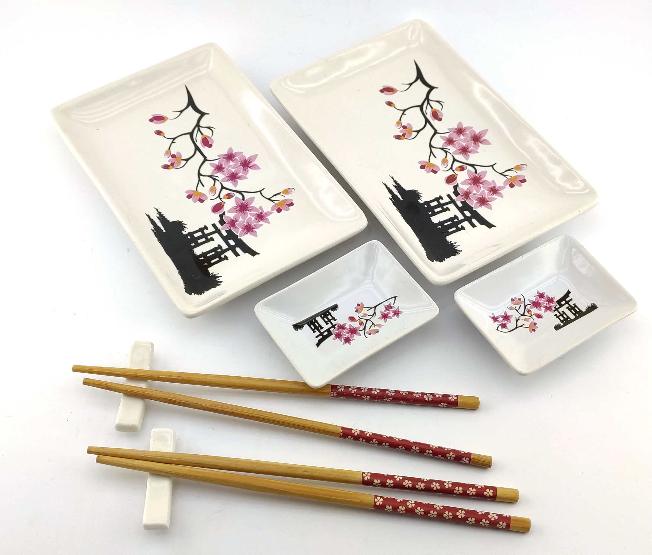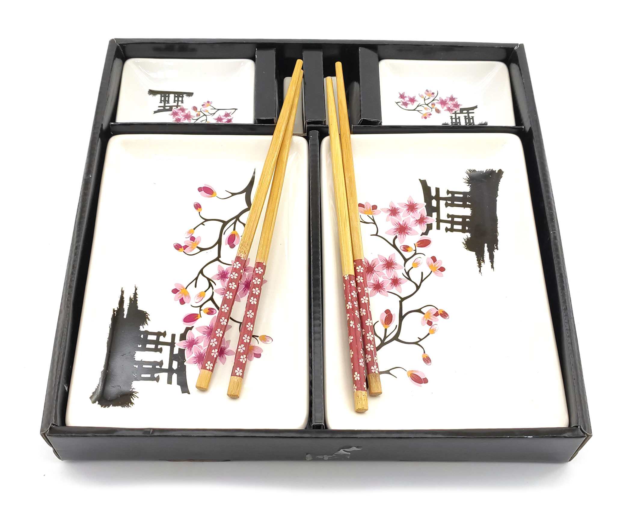 Сервиз для суши Цветы сакуры с иероглифом на черном фоне (2 персоны)(28х28,3х3,5 см)
