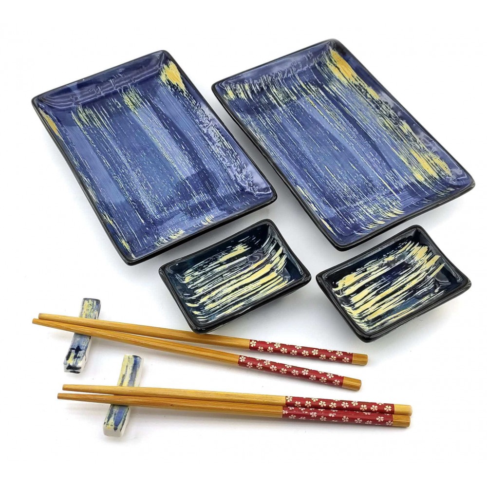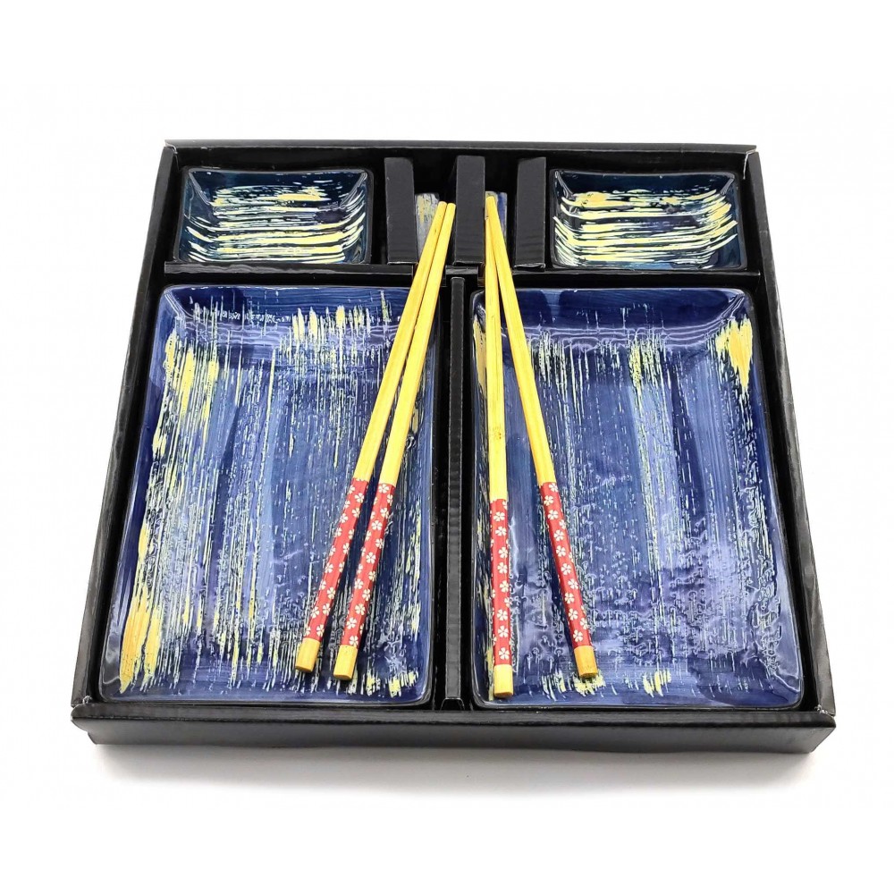 Набор для суши, роллов, сашими ChiBone. Прекрасный набор для ценителей восточной кухни. Набор расчитан на две персоны, в наборе две керамические тарелки прямоугольной формы. Легкие и гладкие бамбуковые палочки, два комплекта, которые не размокают и не деформируются при правильном хранении. Две керамические подставки для палочек. Две керамические соусницы. Набор упакован в картонную коробку с пластиковой крышкой. Каждый предмет набора имеет свою отдельную ячейку для удобного хранения. Состав набора: - Тарелка (20*13 см) -2 шт. - Блюдце для соуса (9*6.5 см) - 2 шт. - Комплект бамбуковых палочек для суши. - 2 комплекта. - Подставка под палочки (5.5*1 см) - 2 шт. - Подарочная картонная коробка (28*14*4см)