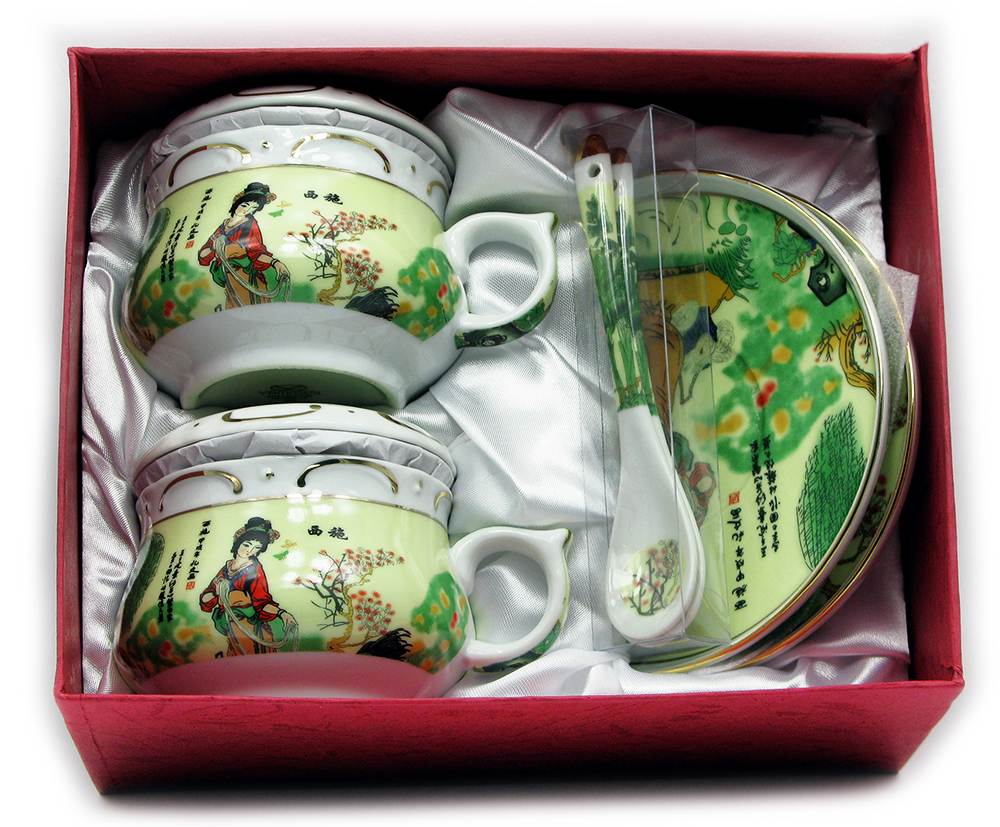 В комплекте: 2 чашки, 2 крышки, 2 фарфоровых ситечка, 2 блюдца, 2 чайные ложки
