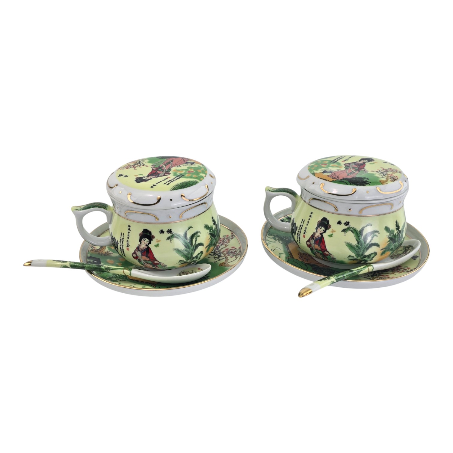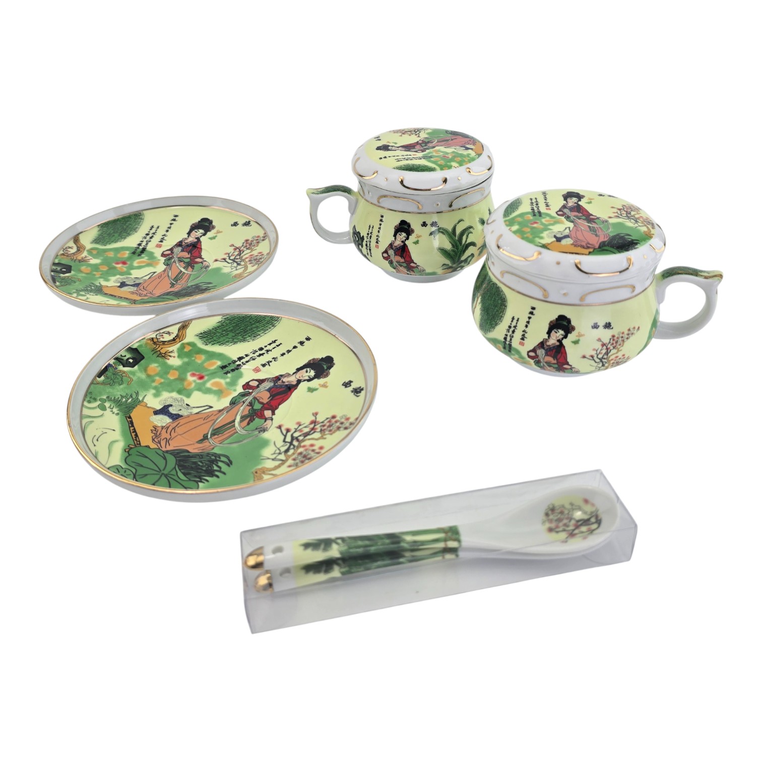 Сервиз фарфор (190мл.)(2GBC-A77SP) 2чашки+2блюдца+2ложки Девушка на салатном фоне (h-6см.,d-7см.)