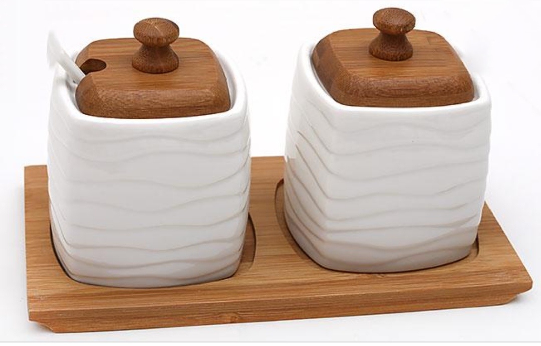 Набор керамических банок (320мл) на бамбуковой подставке с керамическими ложками