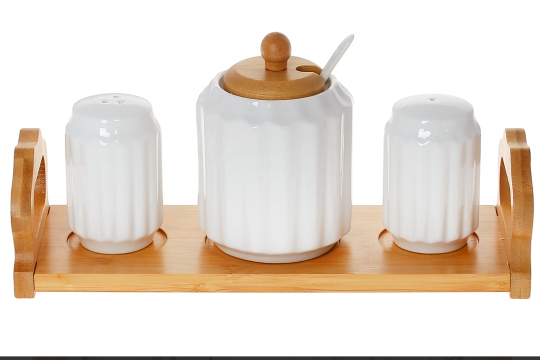 Набор на бамбуковой подставке(соль+перец+сахарница(300мл)с керамической ложкой