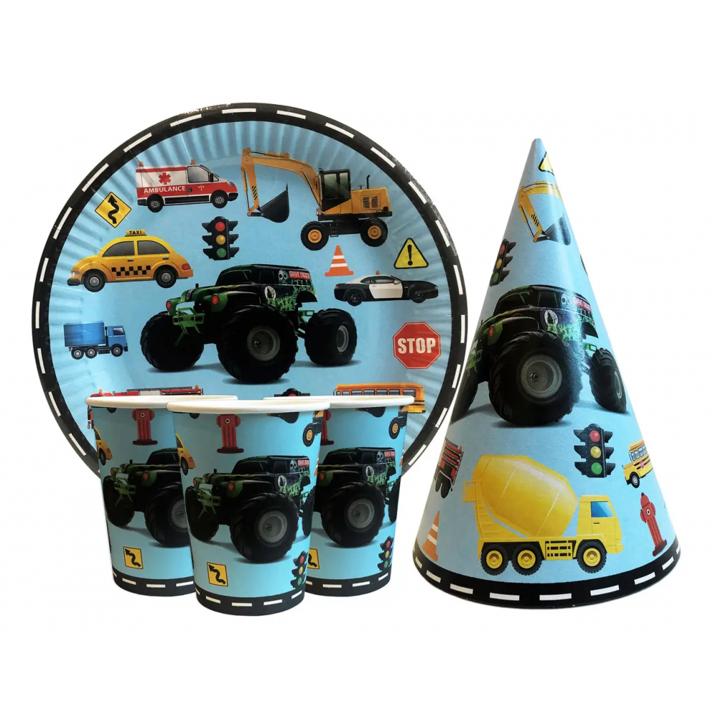 Набор для детского дня рождения "Машинки" Тарелки -10 шт Стаканчики - 10 шт Колпачки - 10 шт