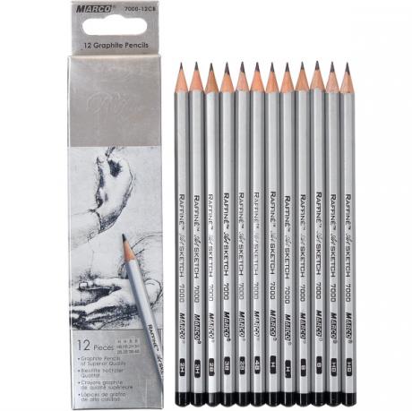 Олівці Marco графітні 7000-12CB raffine різної твердості. Вироблені із високоякісних порід дерева. Покриття - кольоровий лак. Стійкий грифель не кришиться при заточуванні. Набір із 12 Олівців: 3H-1, 2H-1, H-2, HB-2, B-2, 2B-2, 3B-1, 4B-1
