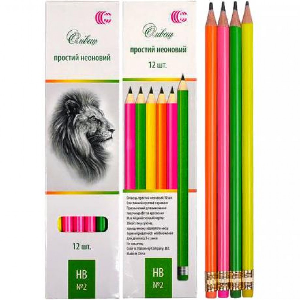 Олівець простий неоновий. З гумкою. Чорнографітних, твердість НВ. В упаковці 12 олівців.