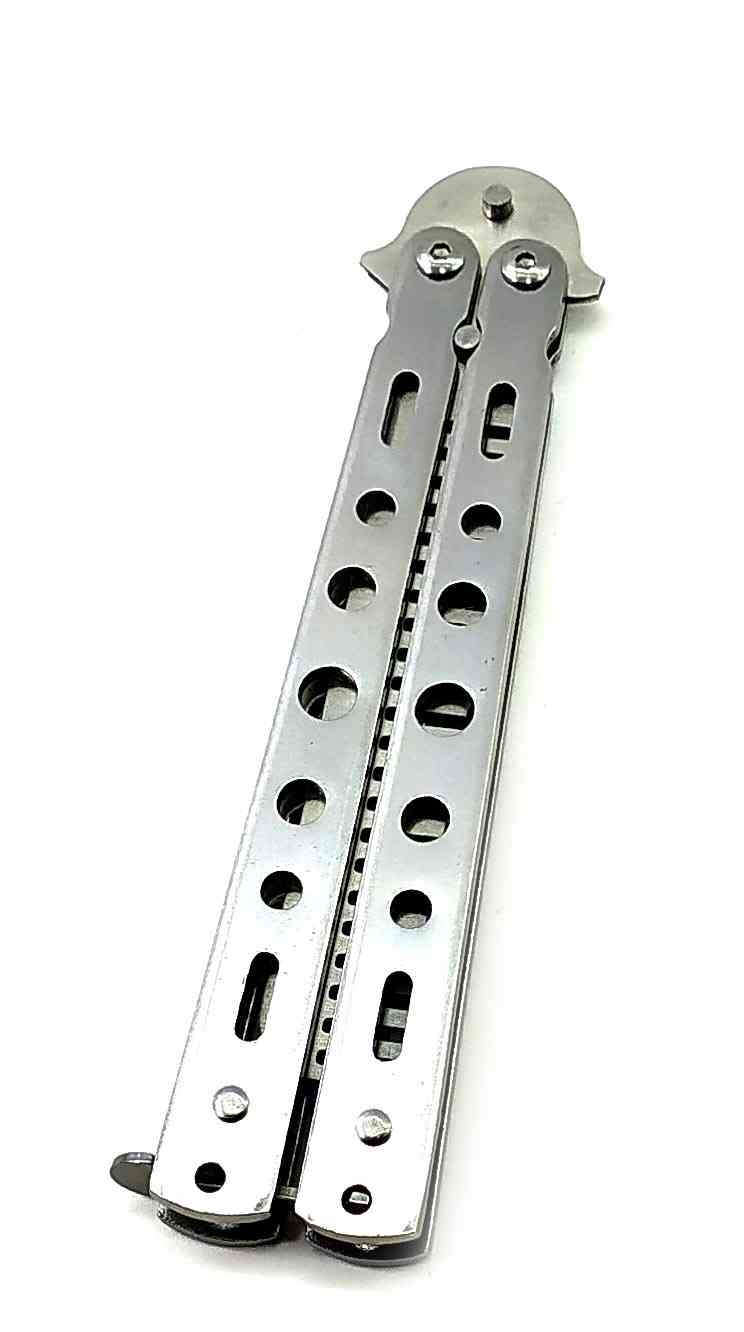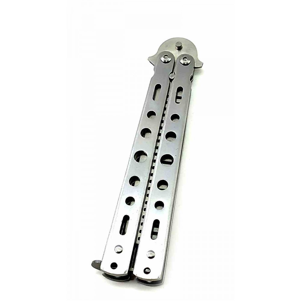 Гребінець балісонг метелик - це стильний і функціональний аксесуар, який поєднує в собі елегантний дизайн і зручність використання. Виготовлений з металу в сріблястому кольорі, він привертає увагу своєю чудовою обробкою.